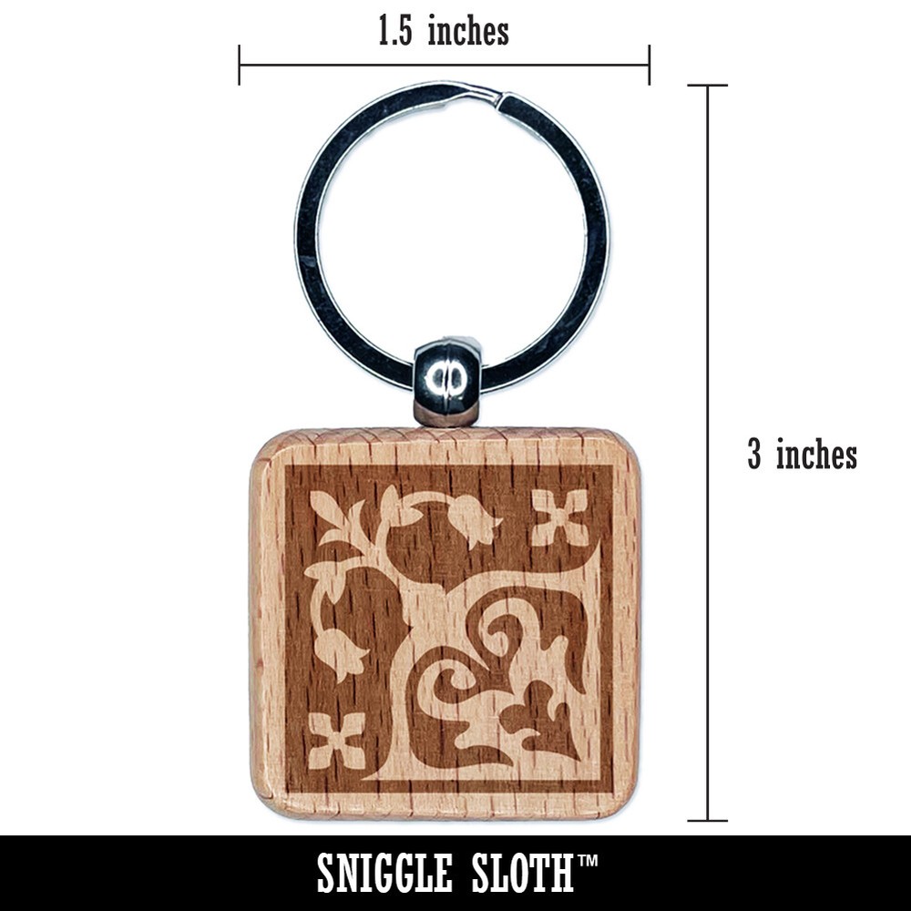 Arabesque Floral Engraved Wooden Square Keychain Charm Tag