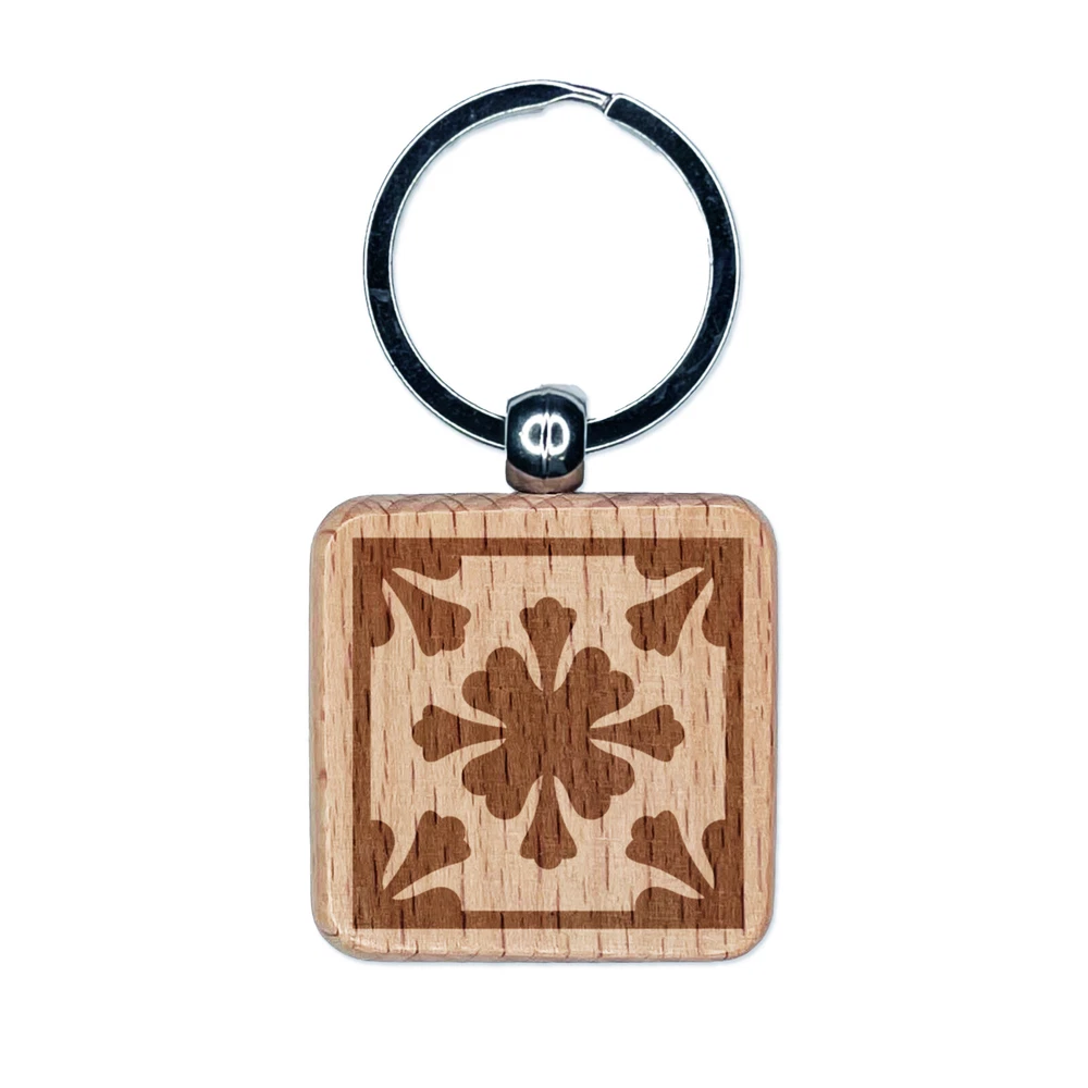 Arabesque Floral Pattern Tile Engraved Wood Square Keychain Tag Charm