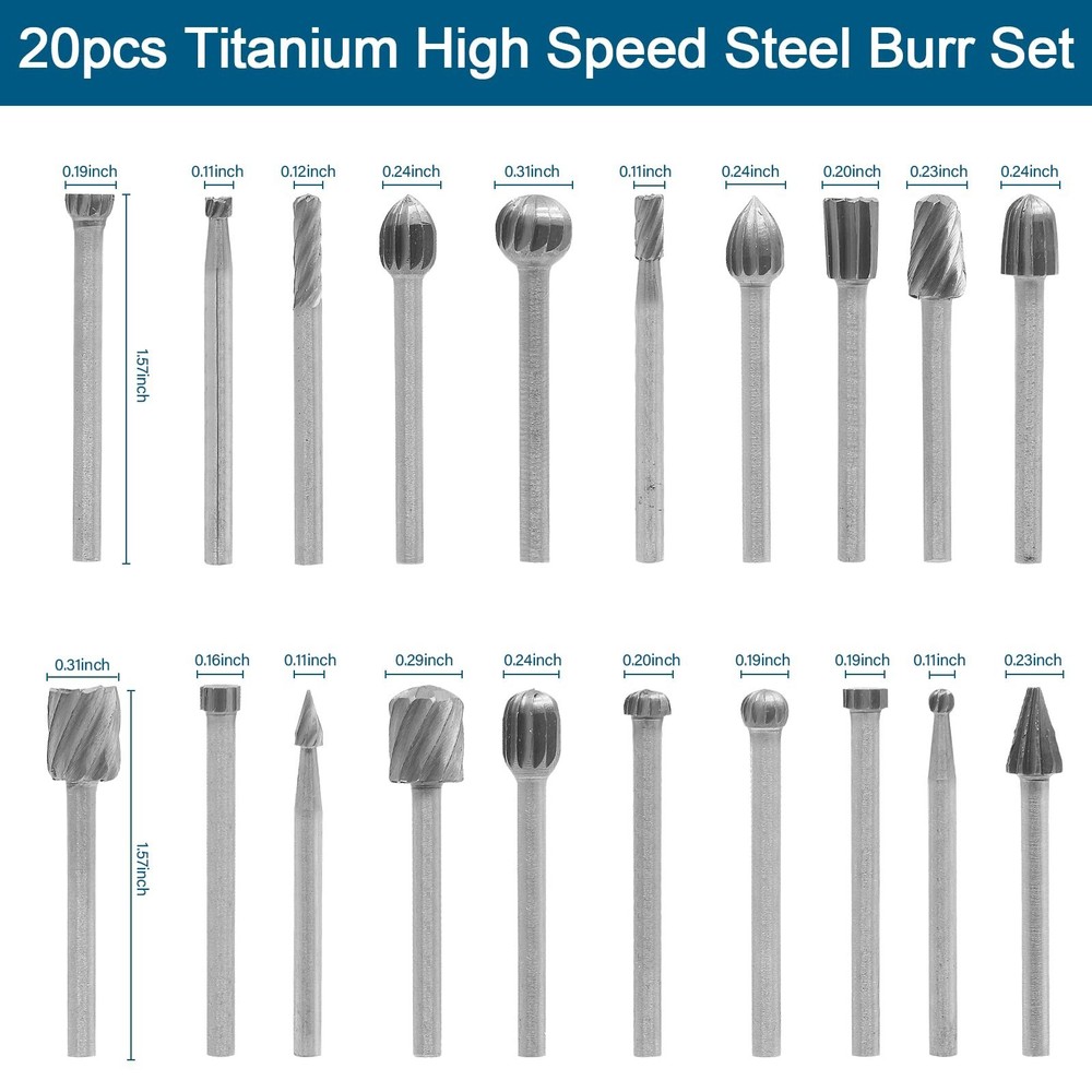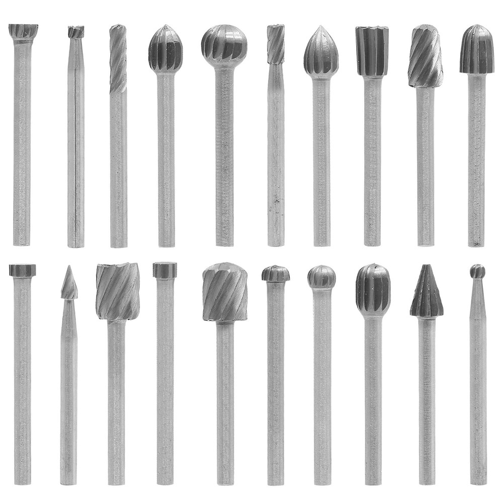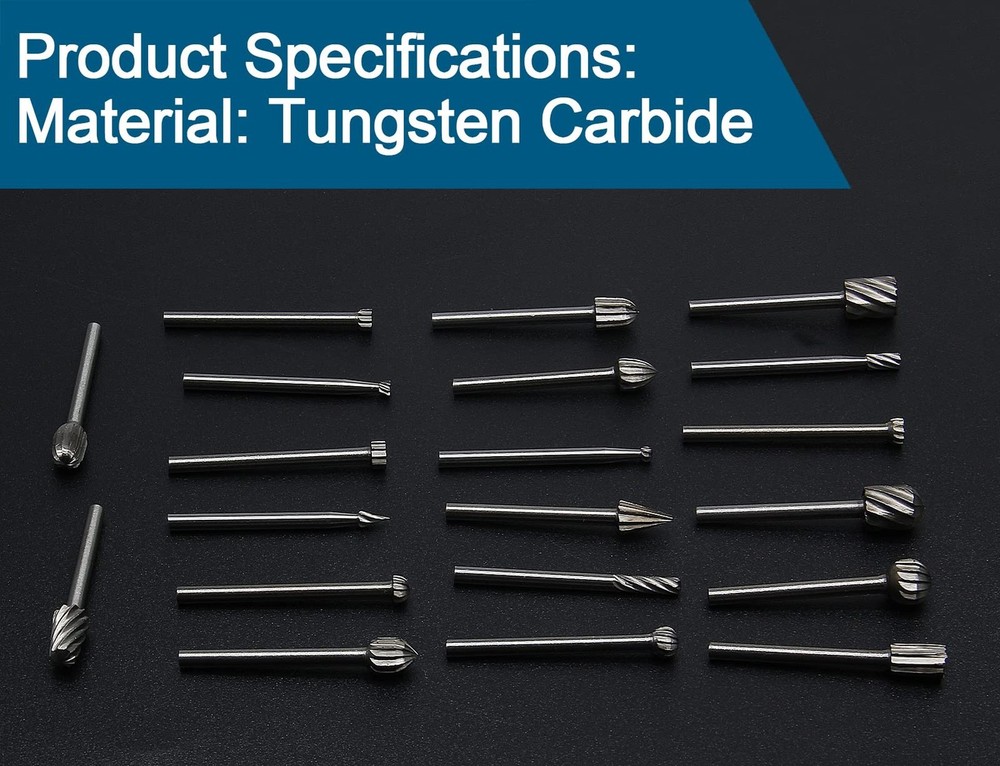Aracombie 20pcs Tungsten Carbide Burr Set Rotary Grinding Bit, 1/8 Inch Shank Wood Carving Bits Rotary Engraving Bits, Drill Bit Deburring Bit Set for Wood, Plastic, Metal Product Details Brand: Aracombie Special Feature: Compact, Electric Style: Pencil Item dimensions L x W x H: 5.91 x 3.94 x 1.97 inches Manufacturer: ‎Aracombie Part Number: ‎AST220413-503 Item Weight: ‎1.76 ounces Product Dimensions: ‎5.91 x 3.94 x 1.97 inches Item model number: ‎AST220413-503 Style: ‎Pencil Special Features: ‎Compact, Electric Batteries Included?: ‎No Batteries Required?: ‎No Date First Available: April 13, 2022 Premium Tungsten CarbideAracombie's rotary burrs are crafted from industrial-grade carbide material that maintains exceptional durability and heat resistance. The robust construction ensures long-lasting performance even under intensive use. Universal Shank CompatibilityFeatures standardized shank design that seamlessly fits most popular rotary tool brands. The secure grip prevents slippage during operation while allowing quick bit changes between different tasks. Efficient Double-Cut DesignCross-cut flute pattern provides aggressive material removal on various surfaces. The innovative design reduces clogging while delivering smoother finishes compared to conventional single-cut burrs. Versatile Application RangePerfect for detailed engraving, metal deburring, wood shaping, and plastic modification. The diverse burr shapes handle everything from fine detail work to heavy stock removal with consistent results. Professional PerformanceEngineered for vibration-free operation and precise control. The balanced weight distribution allows comfortable extended use while maintaining accuracy across different materials and applications. Products Features: Aracombie's rotary burrs are crafted from industrial-grade carbide material that maintains exceptional durability and heat resistance. The robust construction ensures long-lasting performance even under intensive use. Perfect for detailed engraving, metal deburring, wood shaping, and plastic modification. The diverse burr shapes handle everything from fine detail work to heavy stock removal with consistent results. Specification: Length: 1.57 inch Shank: 1/8 inch / 3mm Package Content: 20 x Rotary Grinding Bit