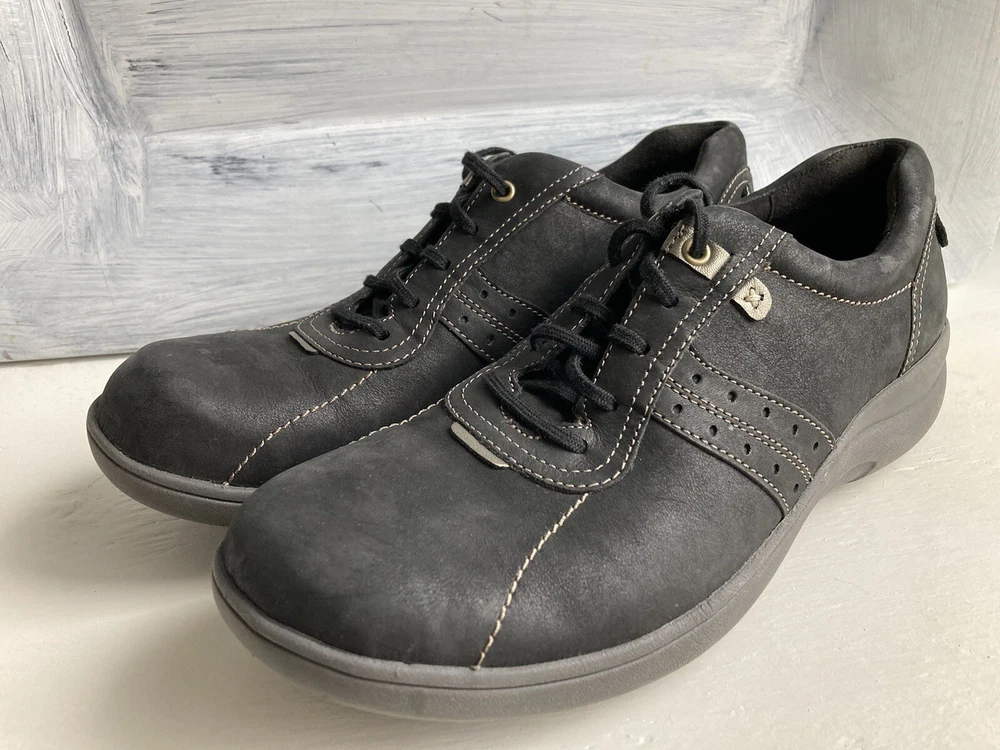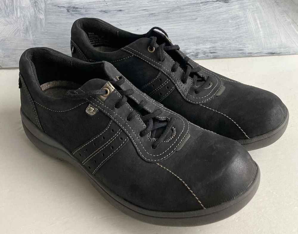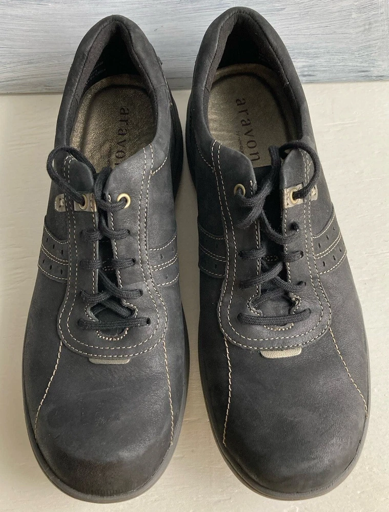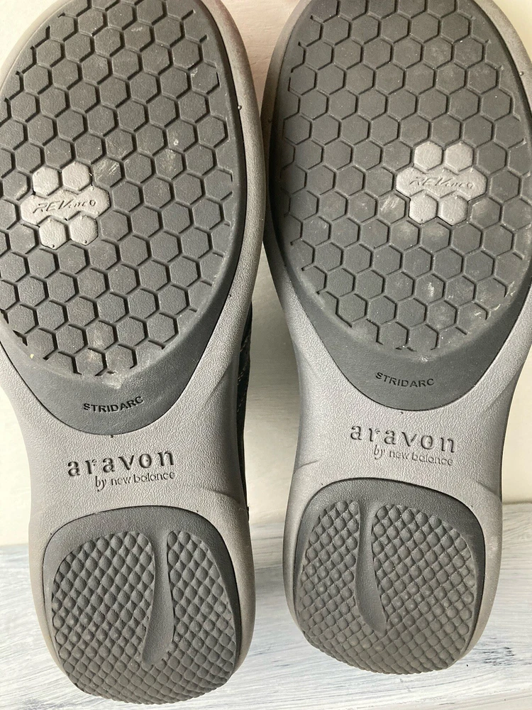 Elevate your footwear with these Aravon By New Balance women's sneakers in size 9AA. This shoe features a comfortable lace-up closure for a secure fit, Stridarc technology, comfortable foam insoles, as well as durable rubber outsoles. The low-top shoe shaft style is perfect for everyday use and the solid black color makes it a classic addition to any wardrobe. Crafted with leather upper material, these shoes offer a sturdy walking foundation that has both support and motion control, making them a suitable choice for all seasons. Perfect for travel, activewear, workwear, or casual occasions, these sneakers are a must-have for any woman looking for a stylish yet comfortable shoe. They are in great condition with no damage. FAST SHIPPING!!
