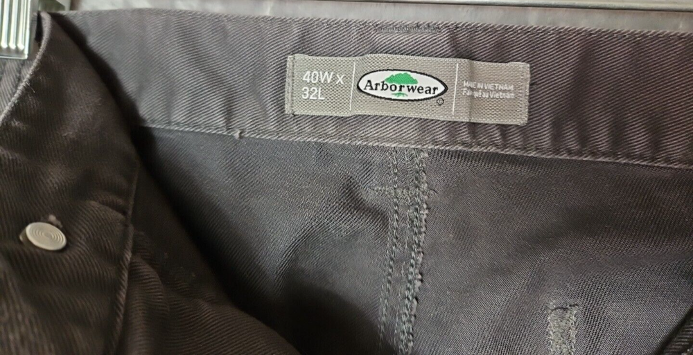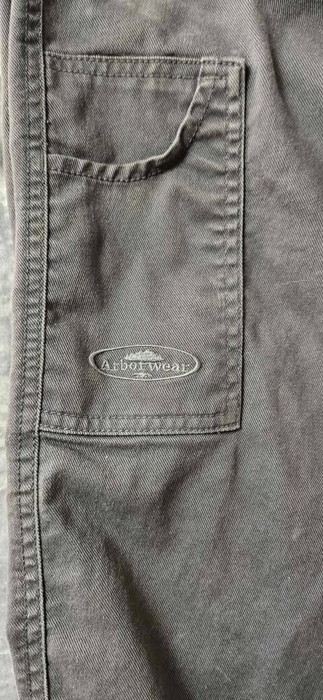 Men's Arbor Wear Cargo Pants in size 40 with a 32-inch inseam. These gray pants feature a flat front design with a regular fit. Made of nylon fabric, ideal for outdoor activities like tree climbing and hiking. The pants have pockets and a button and zip closure. Perfect for casual or workwear in the summer, fall, and spring seasons. Great for outdoor utility use.