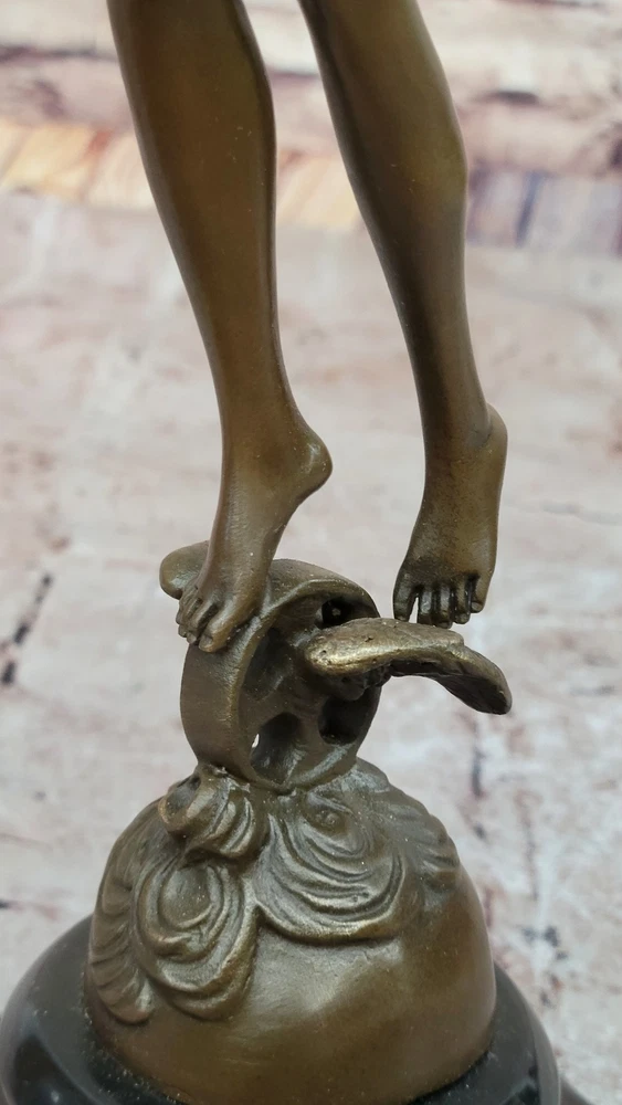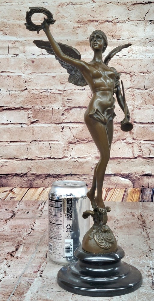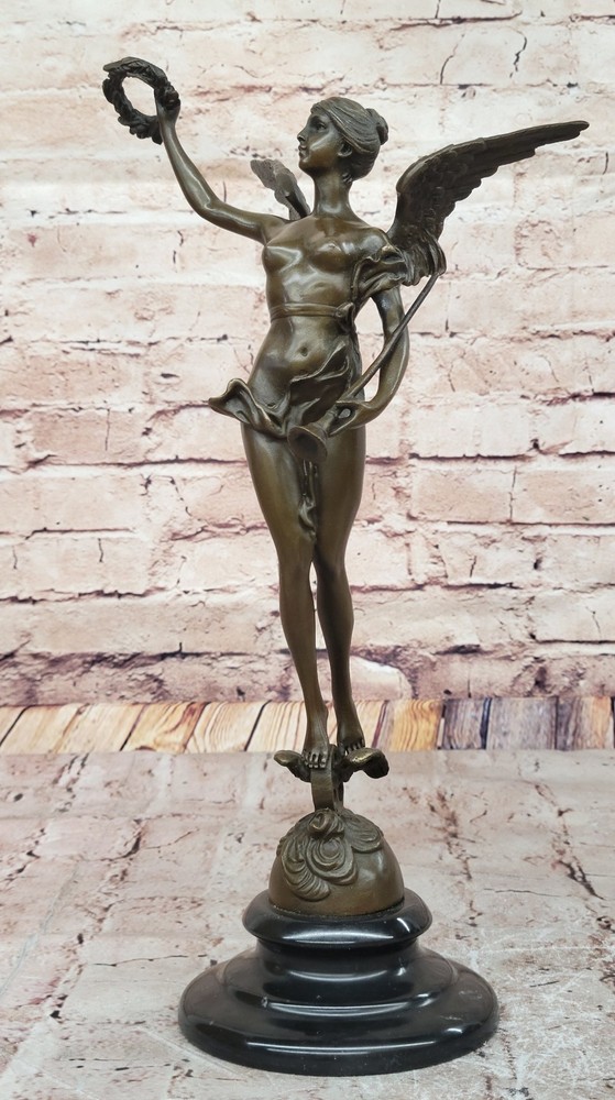 Archangel Nike Bronze Sculpture with Laurel Wreath by A. Bofill Mythical Decor Archangel Nike Bronze Sculpture with Laurel Wreath by A. Bofill Mythical Decor Condition : This sculpture is in perfect condition. Bronze Dimensions with Marble Base: Height 14.5" X Width 7.5" Marble Dimensions: Diameter 4.5" Height without base:12" Weight:5 LBS Inventory:69EPA6966796 This exquisite bronze sculpture depicts an angel gracefully carrying a laurel wreath, symbolizing honor and achievement. Crafted with meticulous attention to detail, the figure embodies the timeless elegance characteristic of Antoine Bofill's work. Bofill, a Spanish artist active in the late 19th and early 20th centuries, was renowned for his small, decorative bronze sculptures that captured the beauty and grace of the human form. ARTNET Handmade using the traditional lost wax method, this sculpture ensures exceptional quality and durability. The rich brown patina finish enhances the depth and texture of the bronze, highlighting the intricate details of the angel's wings and flowing robes. Mounted on a black marble base, the sculpture offers a striking contrast that accentuates its classical aesthetic. Due to the natural variations in marble, each piece is unique, adding to its exclusivity and charm. This timeless artwork is suitable for a variety of interior settings, serving as a captivating centerpiece that evokes a sense of tranquility and reverence. Whether displayed in a home, office, or gallery, it stands as a testament to the enduring beauty of classical sculpture. Angel with a Laurel Wreath Bronze Sculpture By A, Bofill Detailed Artwork Statue www.bronzhaus.com Video will open in a new window Using the eBay App? Paste link into a browser window: [isdntekvideo] Shipping Terms : Most of our items are shipped via USPS (United States Postal Service) mail or UPS. Most orders are shipped within 24-48 hours of purchase. Please be aware that not all items are available for USPS shipping due to size and weight. We do ship to Hawaii, Alaska, Canada, Puerto Rico, APO/AE, and U.S. Virgin Islands, however, an additional charge may be required. Please contact us before making any purchases in these areas. For Non-USA customers, you may be responsible for all duty, tax, brokerage fees that may be due upon delivery (shipping costs cover freight charges only). We also ship internationally. Please refer to the "Shipping and Handling" chart for the rates for each area. Payment : We accept just about any form of payment. PayPal, Master Card, Visa or American Express credit cards. Money orders, cashiers checks, and even personal or business checks. For governmental institutions, we will also accept a purchase order. Please understand that for personal or business checks we have to wait for the check to clear (usually 7 days) before shipping. Condition : New Detailed Hand Crafted Hot Cast Bronze Satisfaction Guaranteed. This is Stock Photo, Slight Color Variation!! Listing and template services provided by inkFrog