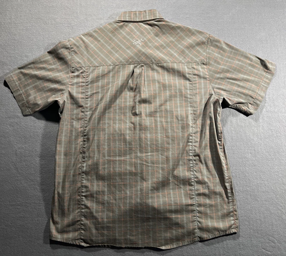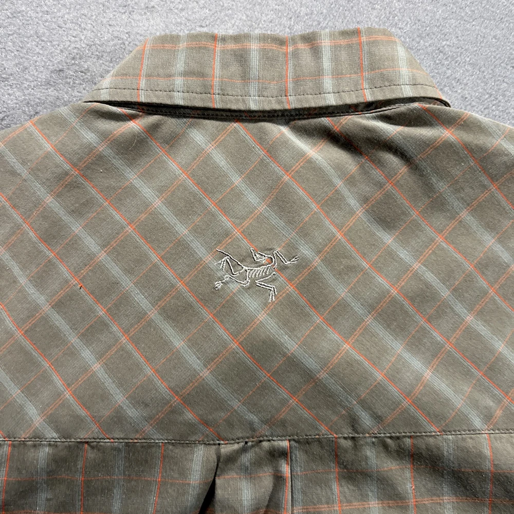 Occasion: Casual, Travel Fit: Regular Garment Care: Machine Washable Season: Fall, Spring, Summer Vintage: No Features: Breathable, Easy Care, Lightweight, Pockets Type: Button-Up Size Type: Regular Sleeve Length: Short Sleeve Theme: Classic, Outdoor Collar Style: Spread Pattern: Plaid Handmade: No Personalize: No Color: Brown Closure: Button Material: Cotton, Polyester Department: Men Brand: Arc'teryx Neckline: Collared Fabric Type: Down Size: L