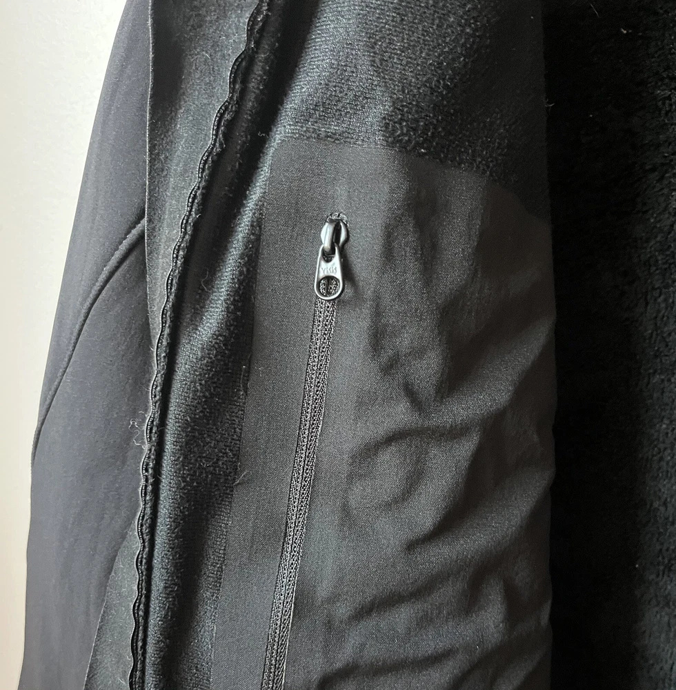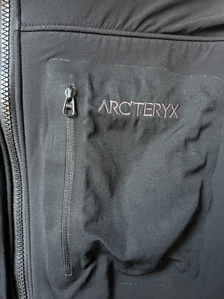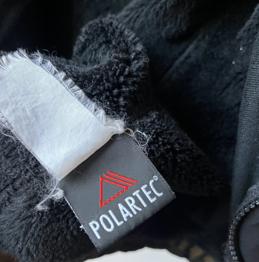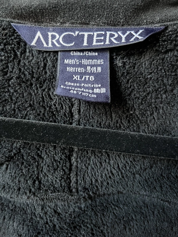 Arc’teryx Easyrider Jacket in the color black. The jacket has a polartec shell and is fleeced lined. Mens Size XL. Jacket is from the 90s so there is some wear and tear as shown in the pictures. Biggest flaw is two holes on the front near the zipper. One hole is very small, the other is larger and was sewn together but still noticable.