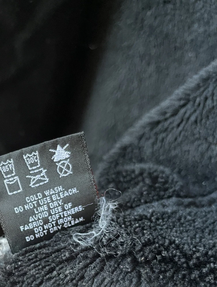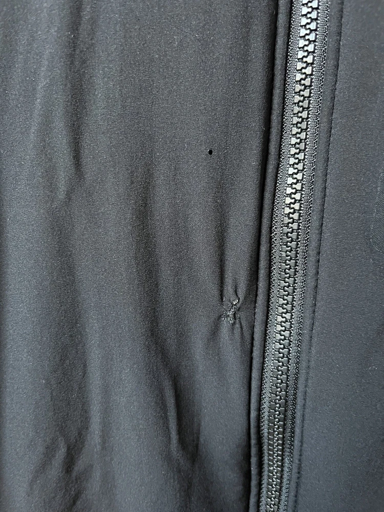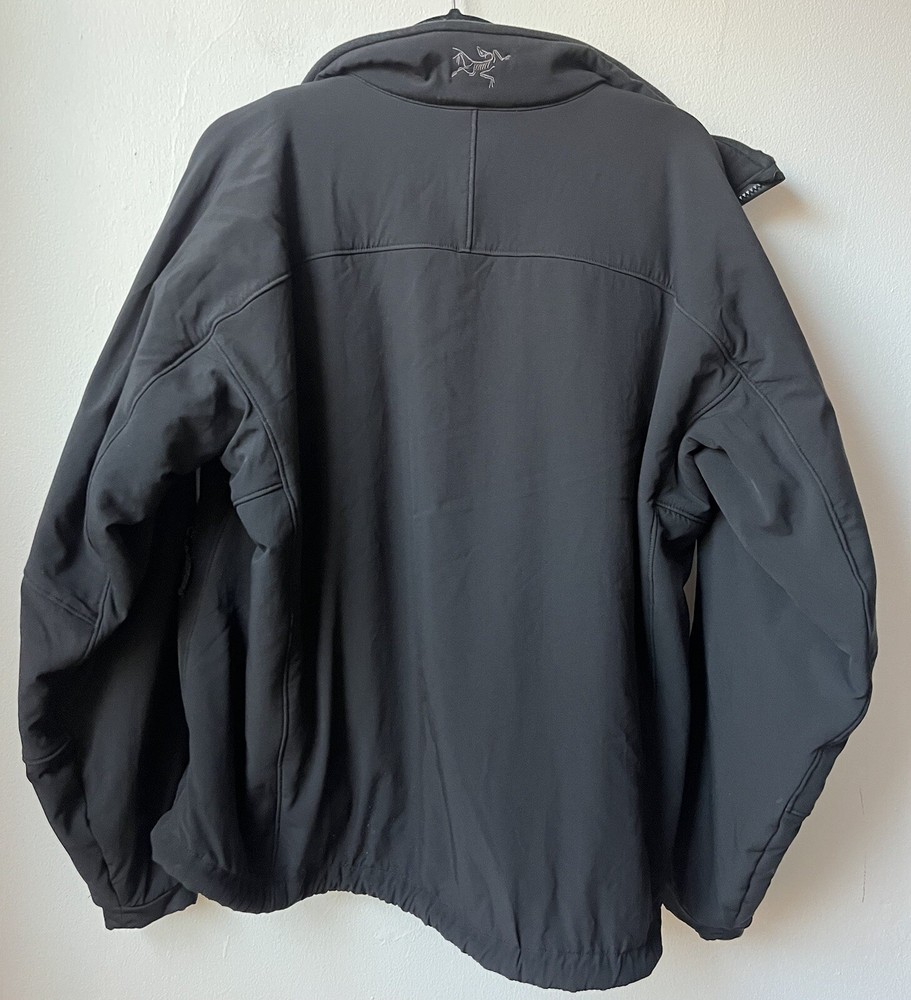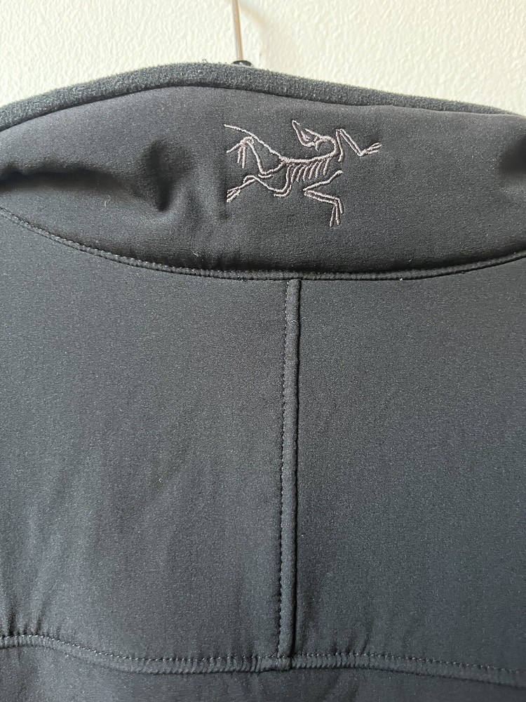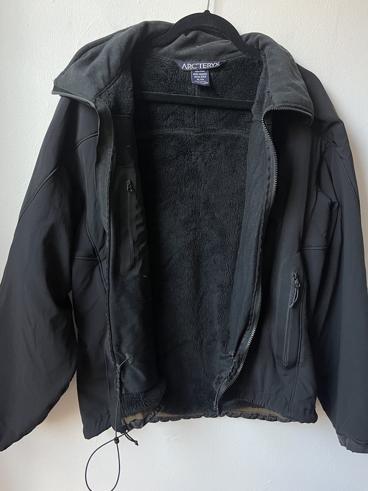 Arc’teryx Easyrider Jacket in the color black. The jacket has a polartec shell and is fleeced lined. Mens Size XL. Jacket is from the 90s so there is some wear and tear as shown in the pictures. Biggest flaw is two holes on the front near the zipper. One hole is very small, the other is larger and was sewn together but still noticable.