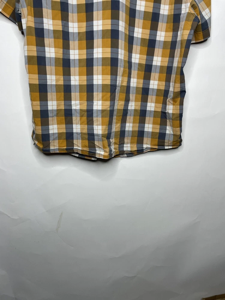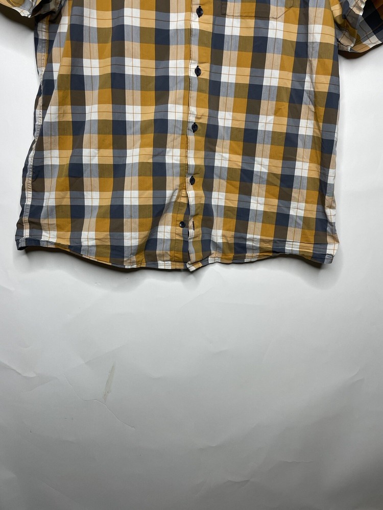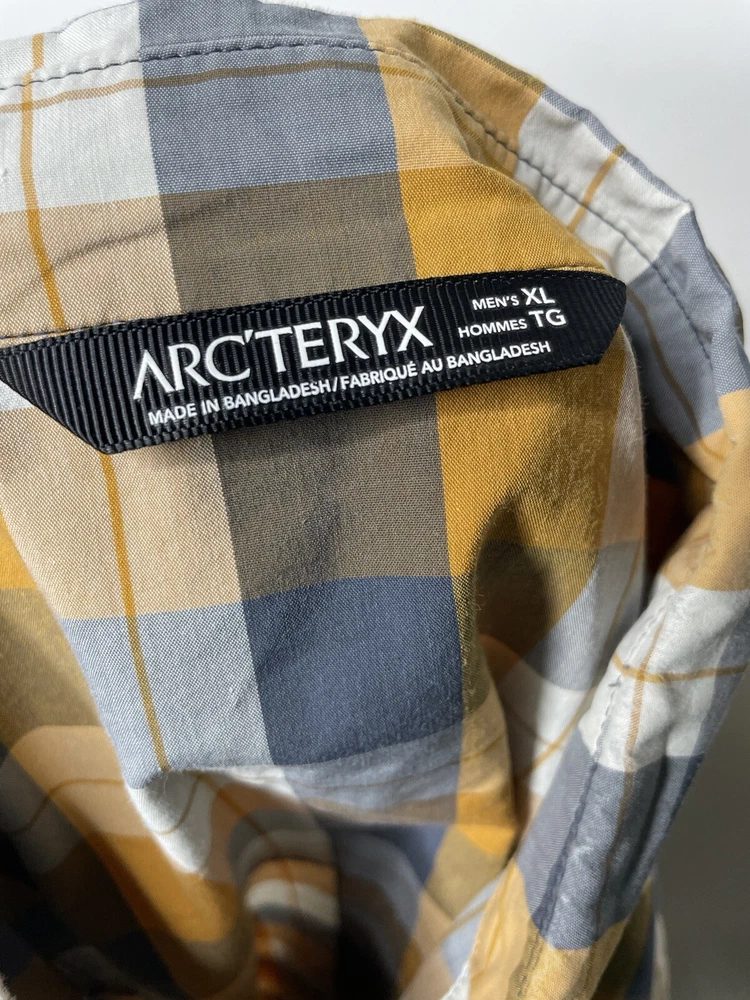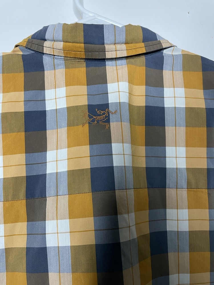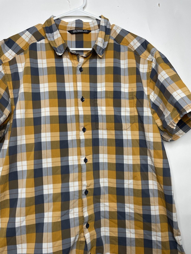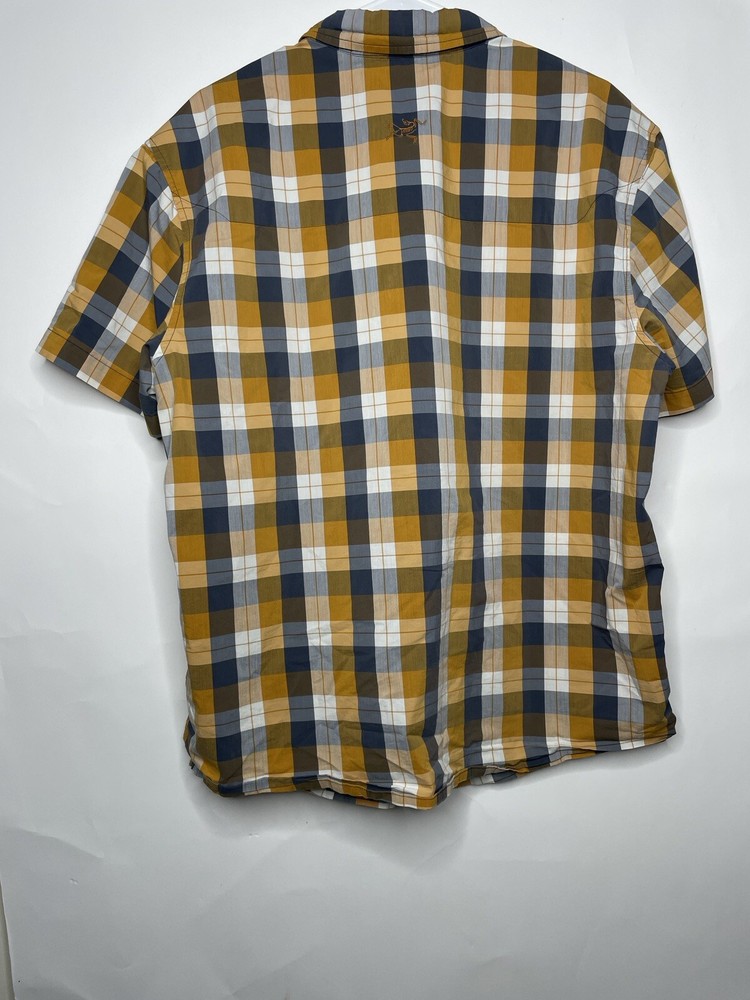 This Arc'teryx men's shirt in size XL features a multicolor plaid pattern with short sleeves and a collared neckline. Made from a lightweight and breathable cotton blend fabric, this button-down shirt is designed for outdoor activities. The shirt has a regular fit with button accents and embroidered details, perfect for a casual yet stylish look while enjoying the outdoors.