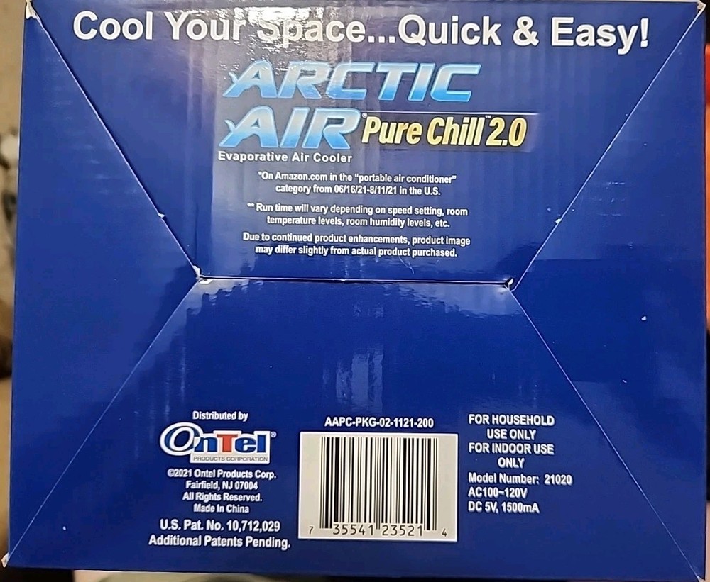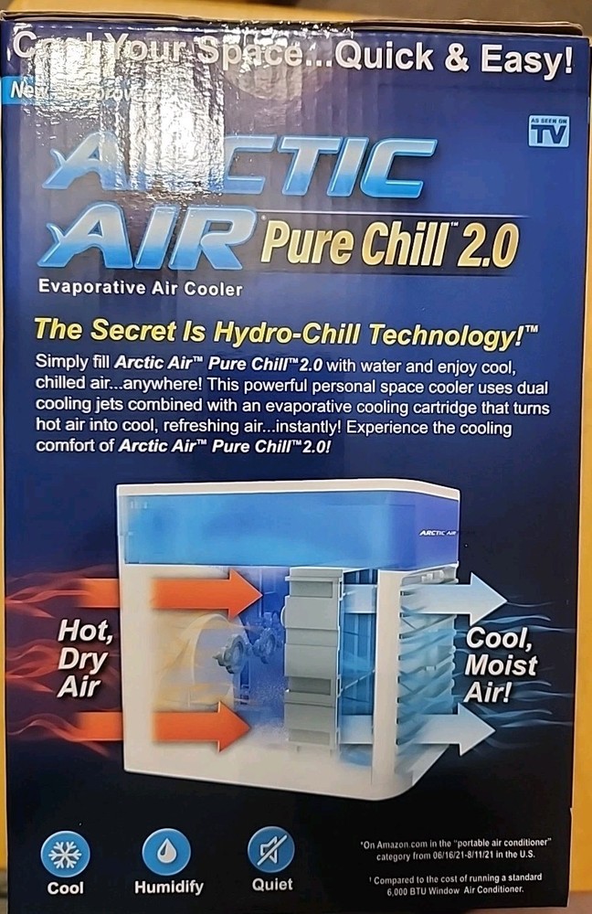 Arctic Air Pure Chill 2.0 About This Product Introducing Arctic Air Pure Chill, the compact, personal air cooler that helps cool and humidify your space. The secret is Hydro-Chill Technology that uses evaporative cooling to help turn hot air into cold refreshing air. It's so simple to set up and use - just pour water in the top fill tank, plug it in, and enjoy. Arctic Air Pure Chill has multi-directional air vents so you can point the cool air in the direction you want. Its sleek, compact design fits nicely on your desk, nightstand, or coffee table - wherever you need it. Use it in your home and work offices, garages, campers, dorm rooms, reading nooks, and more - It's even convenient for travel. Highlights Personal space cooler Adjustable - 4 speeds Quiet operation Lightweight and portable Holds 0.25 gallons of water Please look at the photo's.If there are more than one of the same item it will be a stock photo. Feedback is automatically given after you leave feedback for me. Shipping discount will be give in the form of a refund when buying more than 1 item after package is ready for shipping Thanks for looking.
