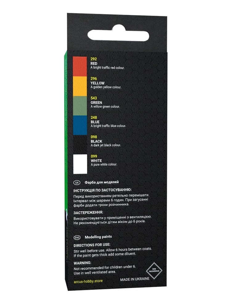 Arcus #E0001 Enamel Paint Set Basics Paint Set Set 6 colors in set 10ml Red Yellow Green Blue Black White for Scale Plastic Model Kit Manufacturer: Arcus Colors Condition: New in Box Volume, ml: 6 х 10 ml. (6 x 0.33oz) Material: Enamel Paint Paint Type: Enamel A starter paint kit containing 6 primary color enamels or enamels (red, yellow, green, blue, black, and white) that can be used by scale modelers or artists for any creative work or when building a scale model of an aircraft, or car, ship, or when painting a figure. Basics Paint Set Use Guide: Can be used as a starter color kit for any creative work or when building and painting a scale model miniature. Basics Paint Set Includes: 292 Red - A bright traffic red color. 296 Yellow - A golden yellow color. 543 Green - A willow green color. 248 Blue - A bright traffic blue color. 098 Black - A dark jet black color, the darkest black among other Arcus blacks. 099 White - A pure white color. The brightest Arcus color within the entire palette. Arcus A0001 Enamel Basics Paint Set is a great choice for modelers of all skill levels. The set includes 6 colors in 10ml bottles, which are perfect for painting plastic model kits. The paints are easy to use and provide excellent coverage. This set is a great value for the price and is sure to help you create realistic and detailed models. Order your Arcus A0001 Enamel Basics Paint Set today!