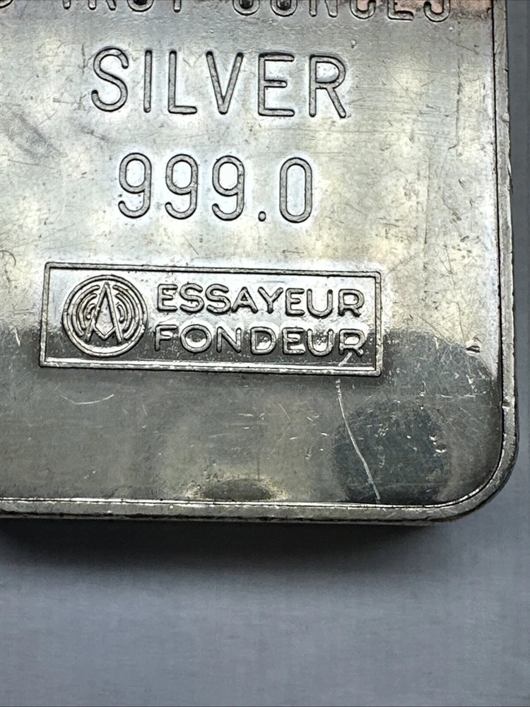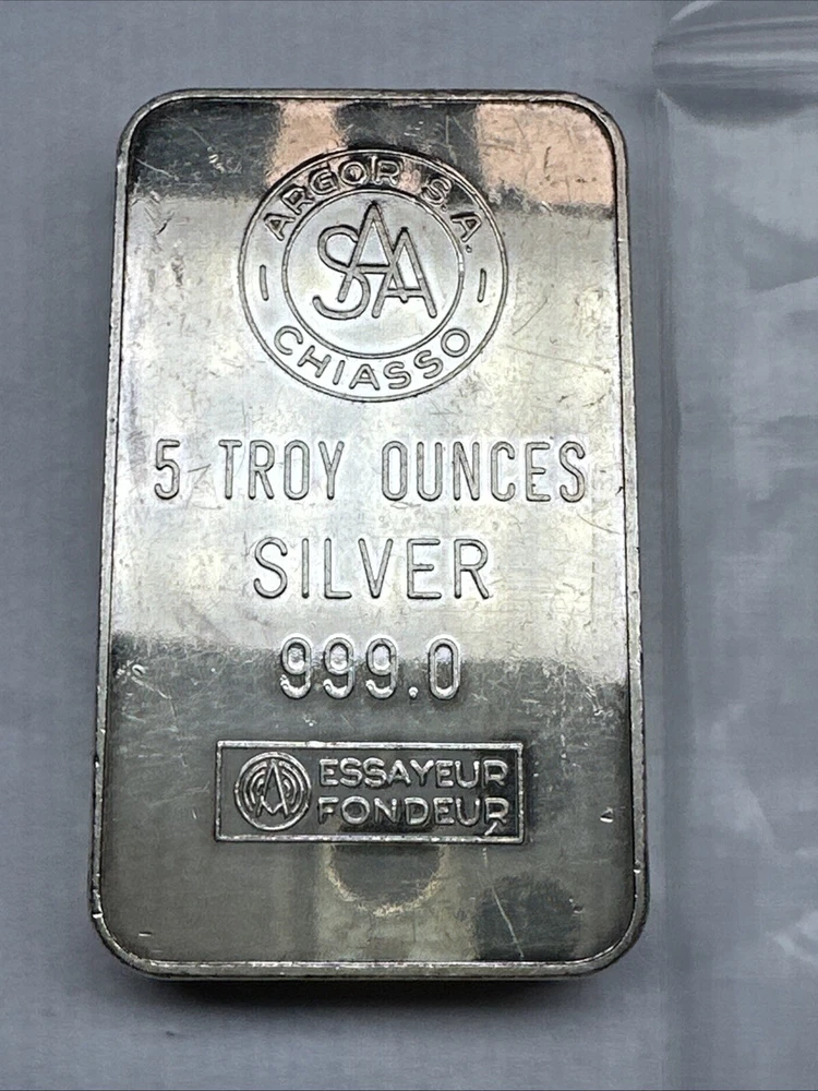 This is a vintage Argor Chiasso 5 oz silver bar made of 0.999 fine silver. It features the "Essayer Fondeur" mark, indicating the bar's quality and authenticity. Produced in Switzerland by Argor S.A. Chiasso, this bar contains a total of 5 oz of precious metal content.
