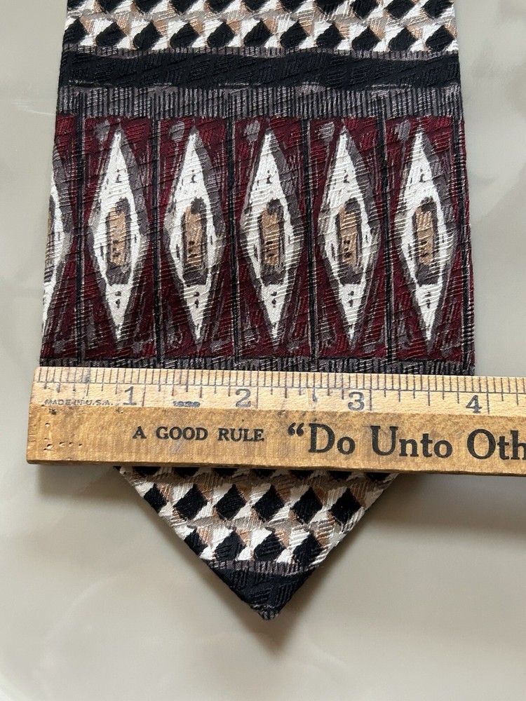 Elevate your sartorial choices with the Argyle Shop's premium necktie, a testament to timeless style and impeccable craftsmanship. The tie features a bold, black and white burgundy geometric pattern, offering a sharp contrast that's sure to make a statement. Crafted from the finest silk, this classic-width HANDMADE tie is designed to provide a perfect knot and a sleek drape, complementing any gentleman's ensemble. Whether for business or a special occasion, this Argyle Shop tie adds a touch of sophistication to your outfit. 4 X 59
