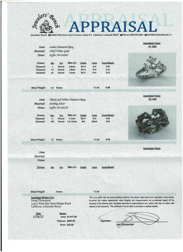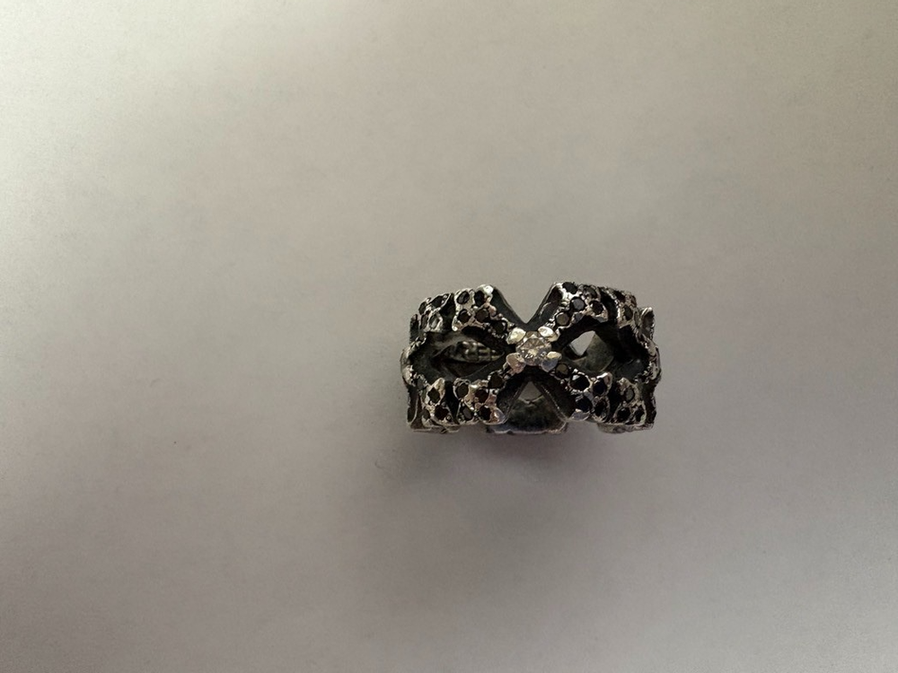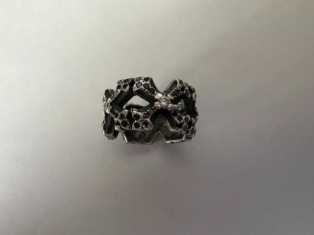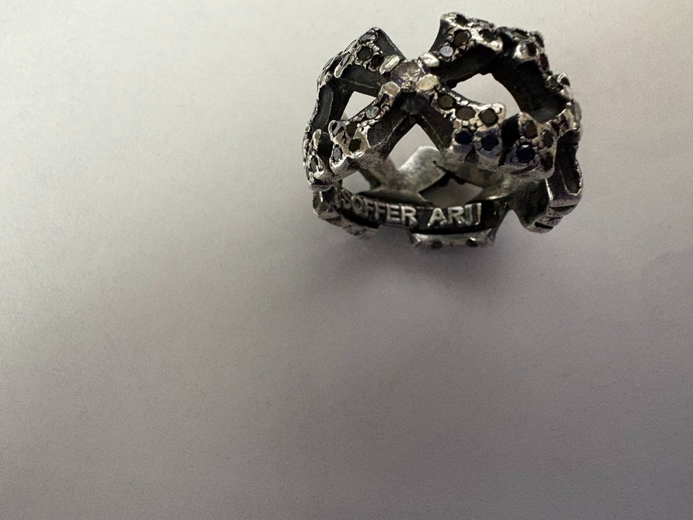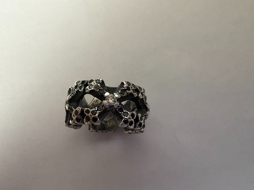 The Ari Soffer Perfect Collateral & NC Cross Borderless White/Black Diamond Ring is a beautiful and unique piece of fine jewelry. It features a cross-shape design with black diamonds set in sterling silver and white diamonds as the main stone. The ring size is 10 and the metal purity is 925, making it a high-quality and luxurious accessory. This ring is perfect for those who appreciate a blend of elegance and edginess in their jewelry choices. There are 4 crosses total around the ring welded together. I've attached the Appraisal (ignore other ring on appraisal) which outlines the number of diamonds in the ring. 5 crosses with 5 Center White Diamonds and 100 Black Diamonds completing the cross. This ring is a stunner. I get a compliment every time I wear it. Now that I've become older, I don't have many places I can wear it so I'd like it to go to someone who will wear and appreciate it. This is a spectacular ring that you would see rock stars wearing and would retail for over $3,000 on Ari's website.