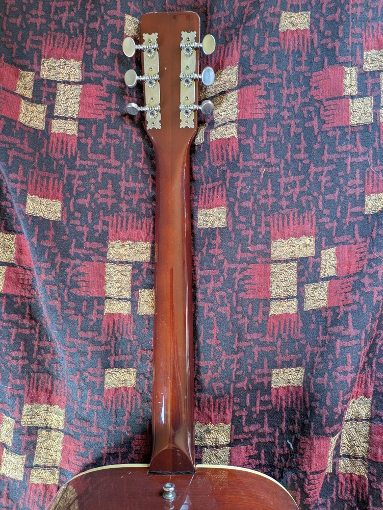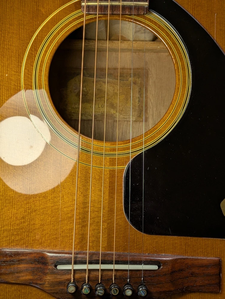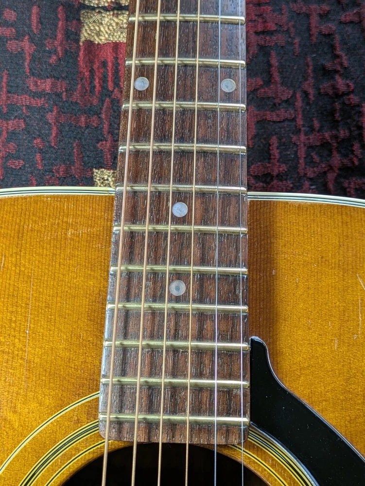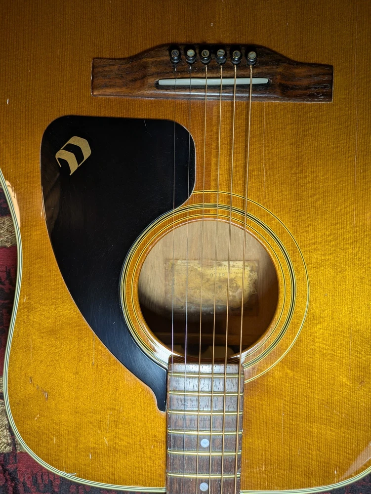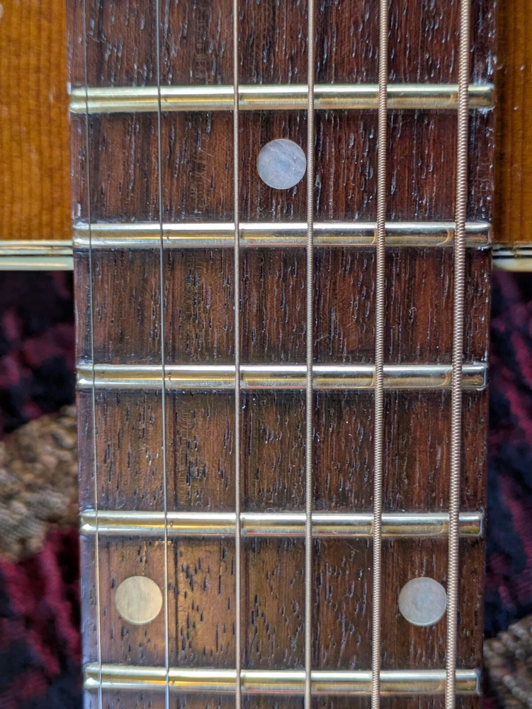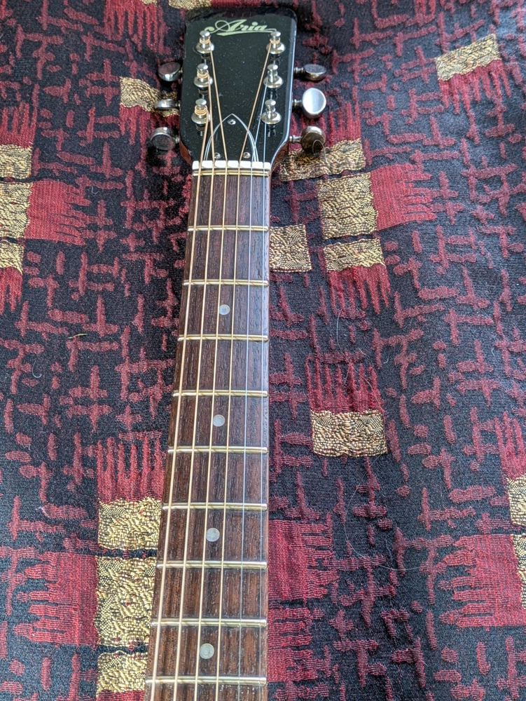 Great sounding guitar, loud with clarity, very good bass for a laminate top. An early model with a cedar top (from what it looks like and from what I read on the net). Also has V bracing instead of the typical X bracing, which I have only seen before on another early Aria orchestra model. Added Jescar gold EVO frets (harder than nichel silver) leveled crowned and polished. Slightly tapered the braces through the sound hole for more bass response. Slim neck, plays like an electric. Added a bone saddle and nut, ebony pins and filled the adjustable saddle slot with an ebony inlay. The original adjustable saddle comes with it. Added an Oak shim to increase saddle height and adjust action. Filled finish cracks with CA glue and wet sanded at least a third of the finish off to improve sound and remove most of the scratches. Looks great, plays great.