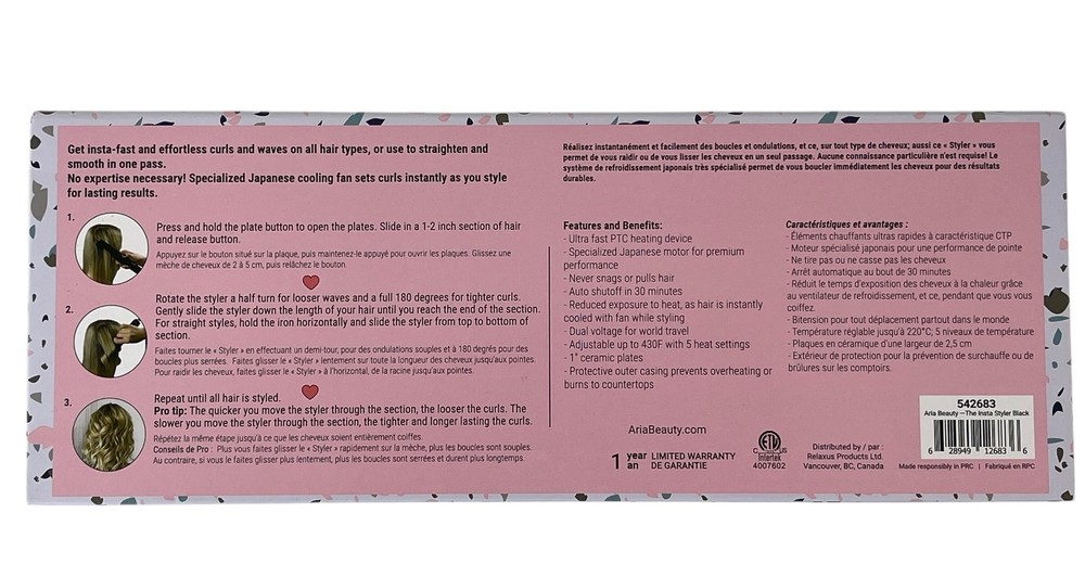 Aria Beauty The Insta Styler Hot Curler + Cool Air Hair Curling Iron New / Never Used. Open Box. Curls, Sculpts, Sets. Get Insta-fast and effortless curls and waves on all hair types, or use to straighten and smooth in one pass. Specialized Japanese Cooling Fan sets curls instantly as you style for lasting results. Auto Shutoff in 30 minutes Adjustable up to 430 degrees with 5 heat settings. 1" inch ceramic plates Protective outer casing prevents overheating or burns Please check our eBay Store for all the other great items we offer. click link >>> Matvey eBay Store! <<< click link Please see the pictures and read the full item description for product details. Please ask any questions you have before purchase. I accept payment through eBay only. I ship with tracking to ensure fast and safe delivery. FREE SHIPPING IN THE USA!