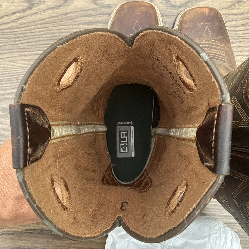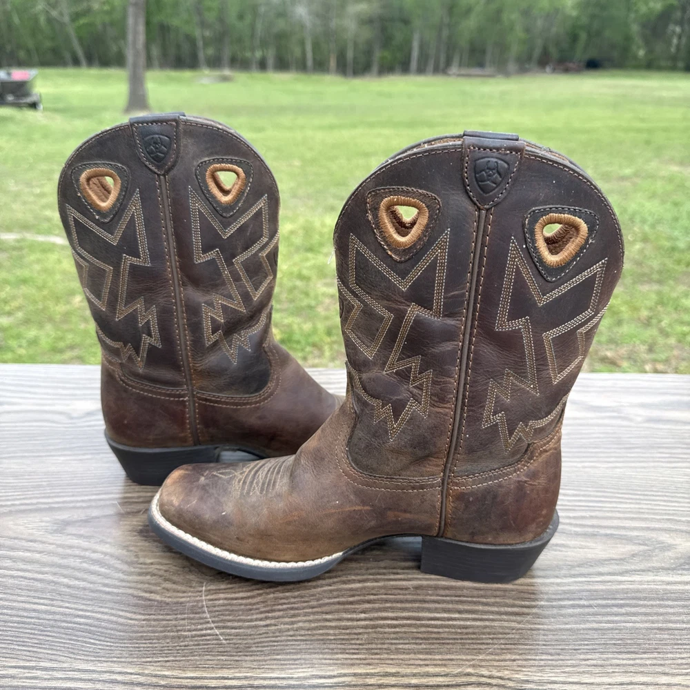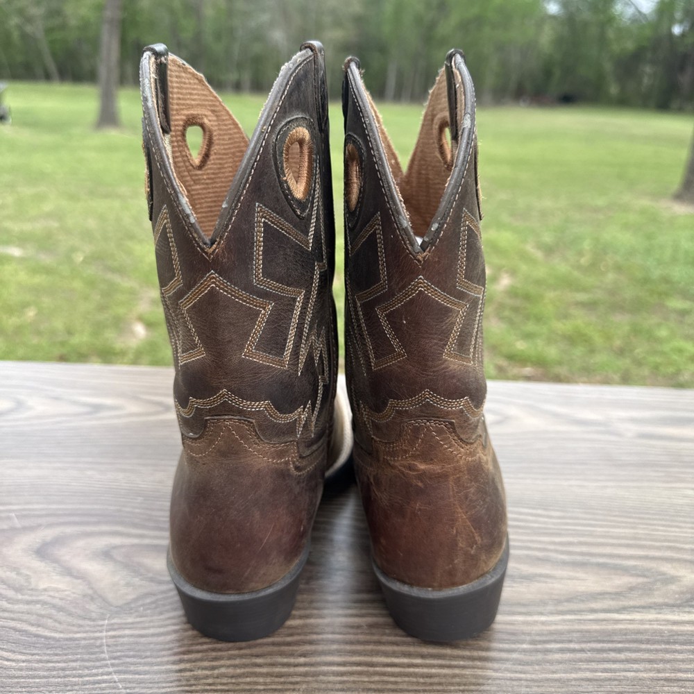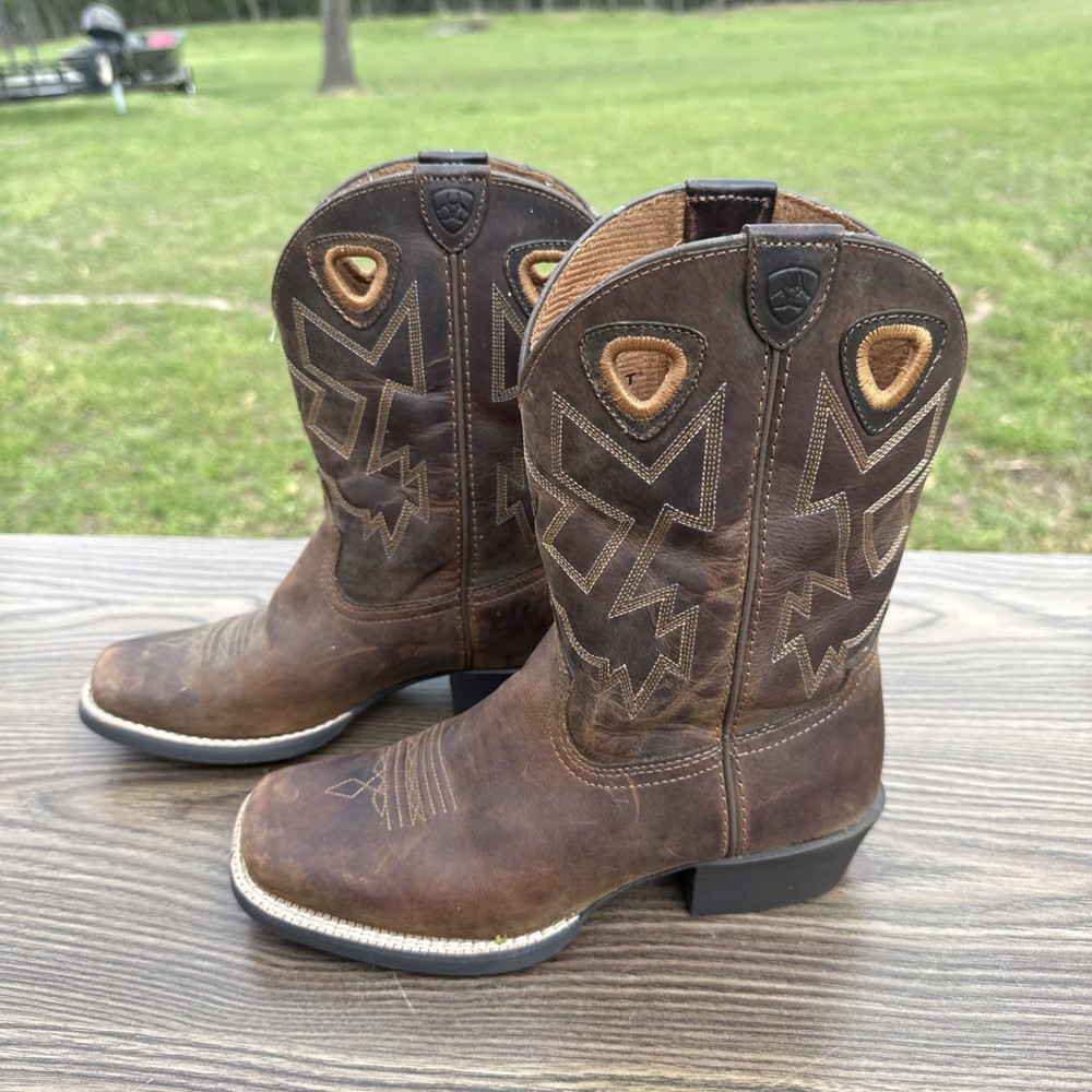 These Ariat Boots in kids size 3 are a stylish and durable choice for young cowboys. The brown leather material with embroidered accents and a square toe shape give them a classic Western look. The pull-on closure, low heel height, and moderate cushioning make them comfortable for all-day wear. Perfect for riding and everyday casual occasions, these mid-calf boots are a versatile addition to any young rider's wardrobe.