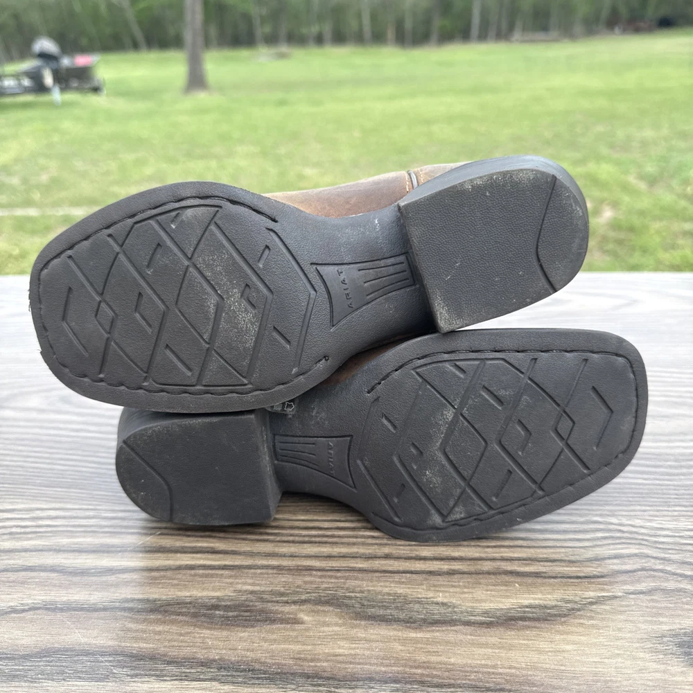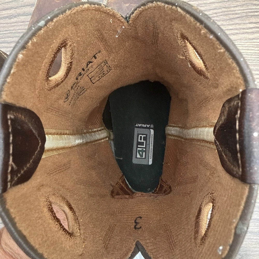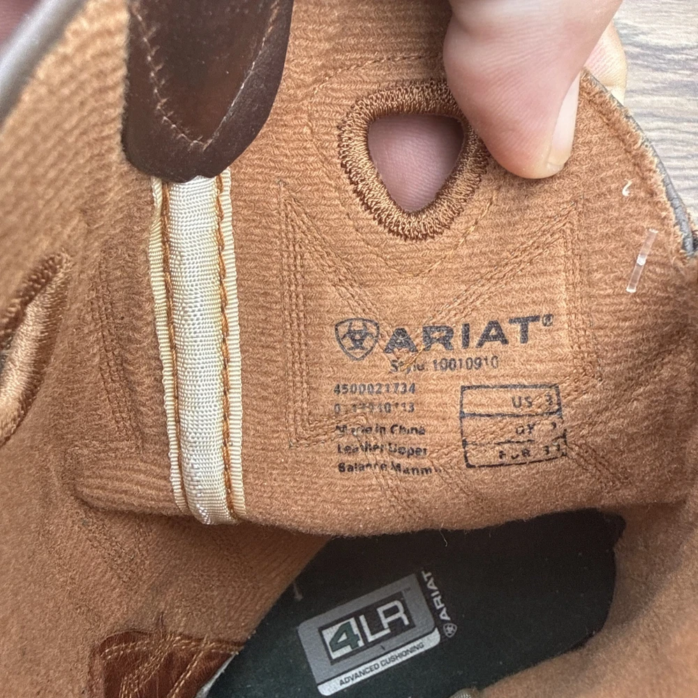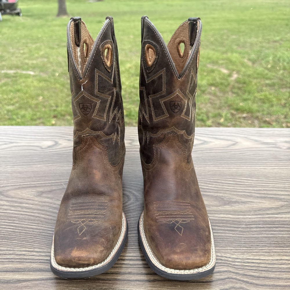 These Ariat Boots in kids size 3 are a stylish and durable choice for young cowboys. The brown leather material with embroidered accents and a square toe shape give them a classic Western look. The pull-on closure, low heel height, and moderate cushioning make them comfortable for all-day wear. Perfect for riding and everyday casual occasions, these mid-calf boots are a versatile addition to any young rider's wardrobe.
