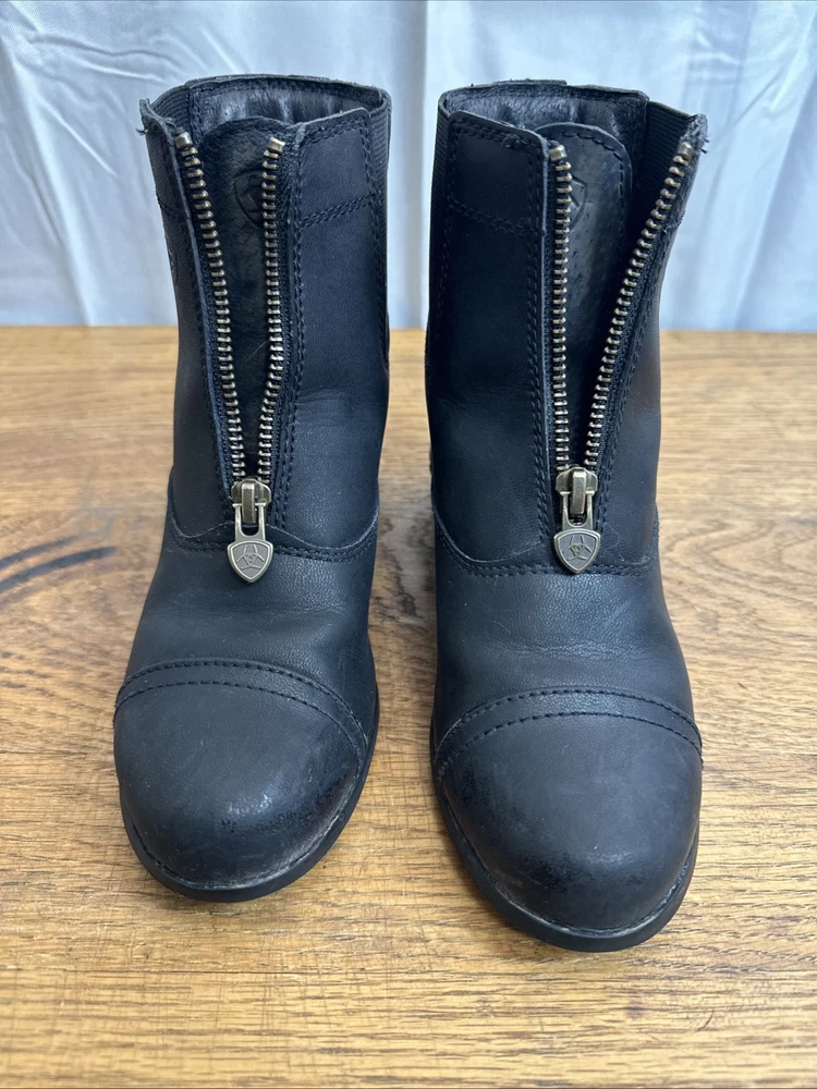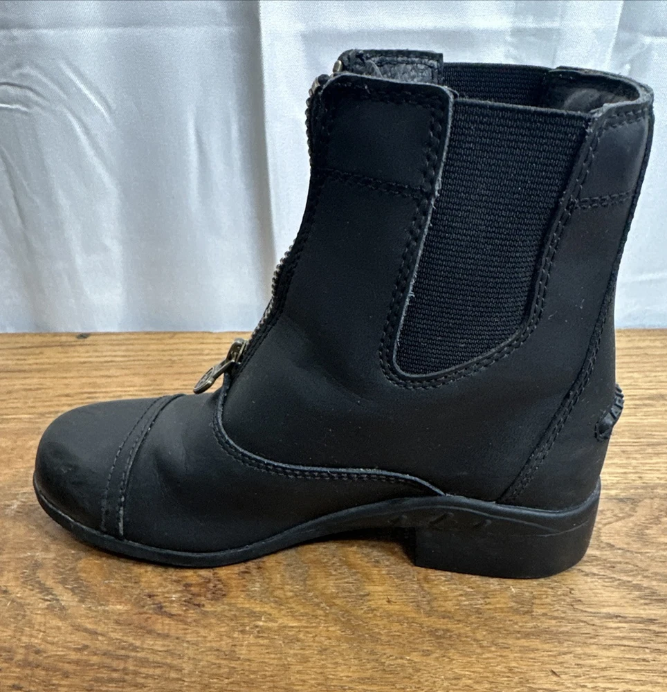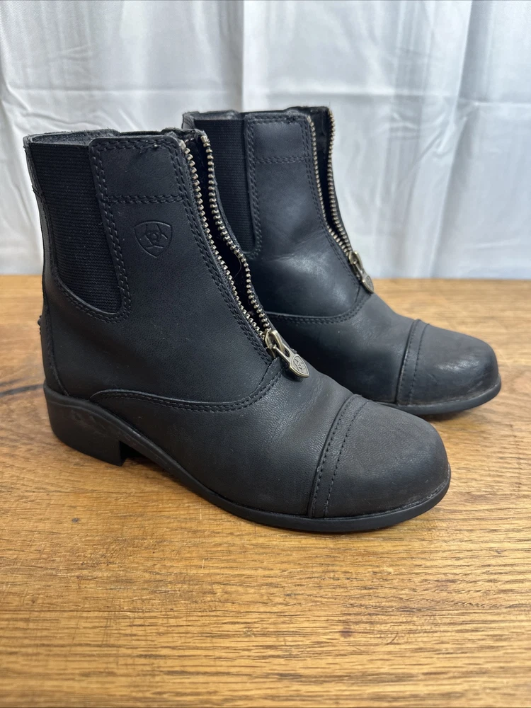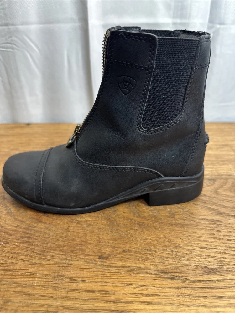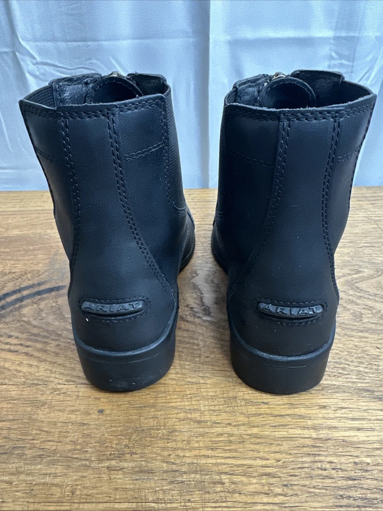 The Ariat Boots in toddler size 13 are designed for casual wear, featuring an almond toe shape, low block heel, and ankle shaft style. These black leather riding boots have a zip closure for easy on and off, with cushioned insoles for moderate comfort. The boots are adorned with zipper accents and the Ariat logo, perfect for young girls who enjoy equestrian activities or have a love for horses and cowboys. Built with rubber outsoles for traction, these boots are suitable for all seasons and provide a standard width fit. Pre-owned condition. The boots are in great shape. The insole cushion has been removed. See photos,