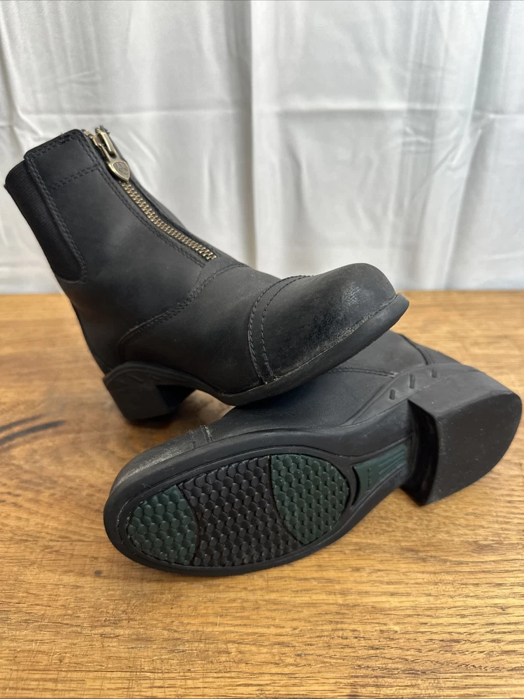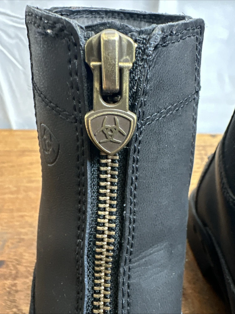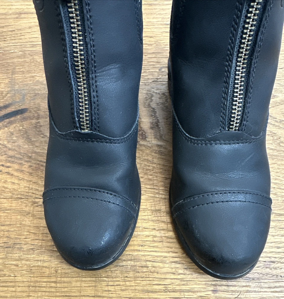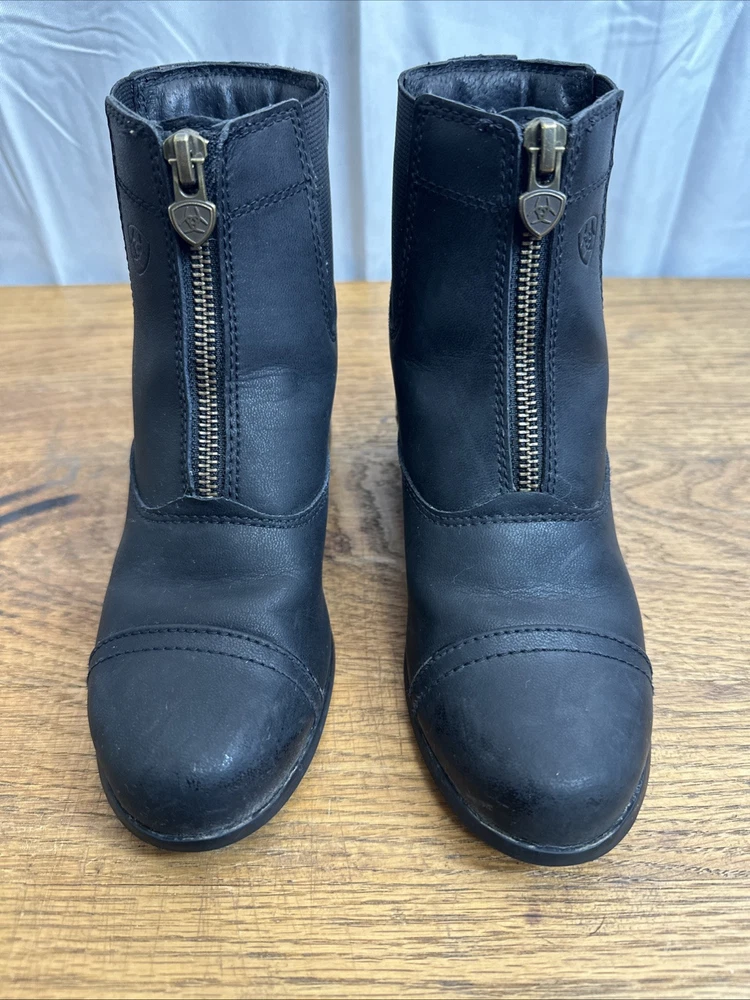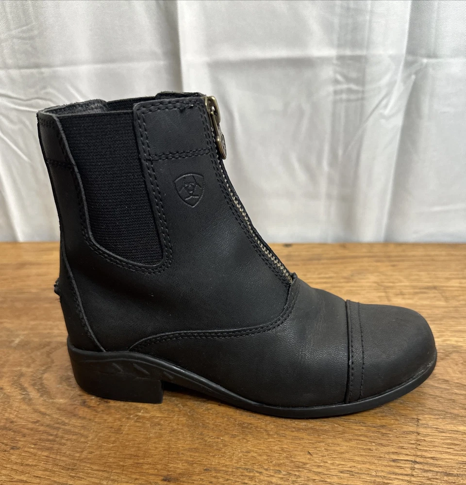 The Ariat Boots in toddler size 13 are designed for casual wear, featuring an almond toe shape, low block heel, and ankle shaft style. These black leather riding boots have a zip closure for easy on and off, with cushioned insoles for moderate comfort. The boots are adorned with zipper accents and the Ariat logo, perfect for young girls who enjoy equestrian activities or have a love for horses and cowboys. Built with rubber outsoles for traction, these boots are suitable for all seasons and provide a standard width fit. Pre-owned condition. The boots are in great shape. The insole cushion has been removed. See photos,