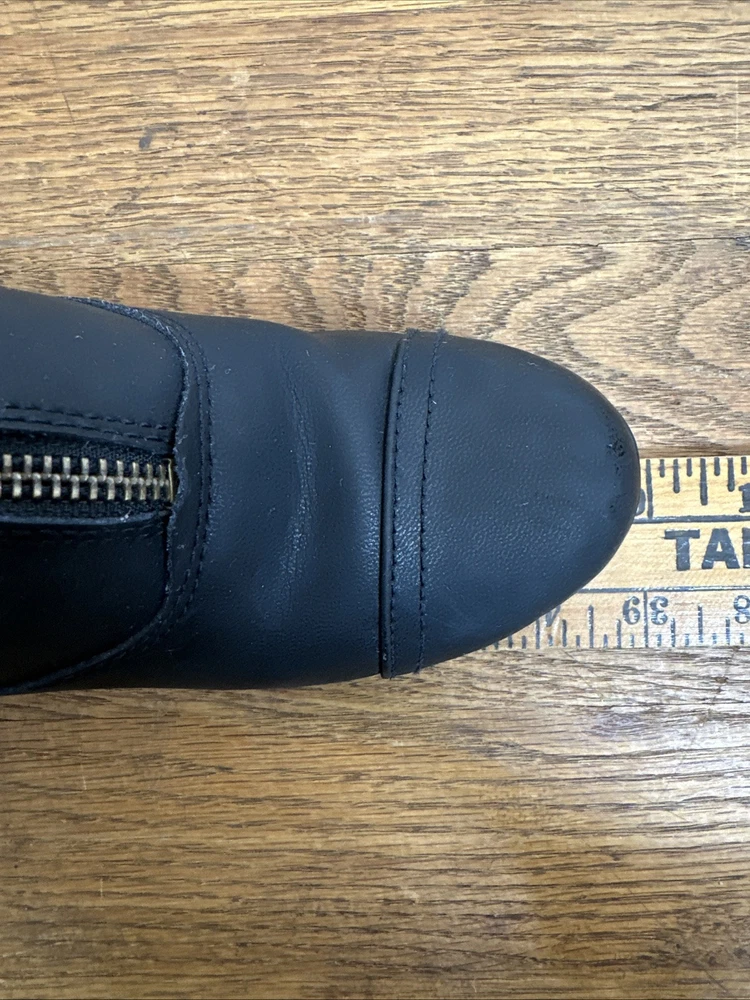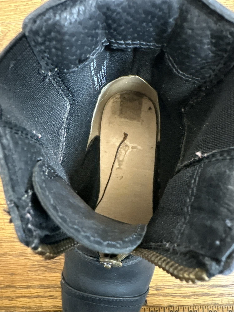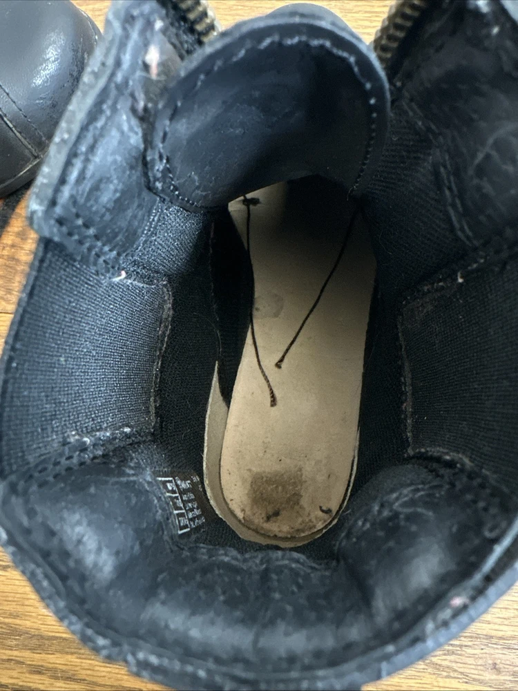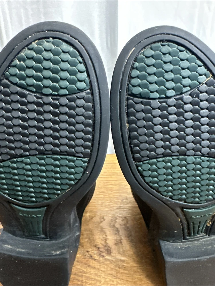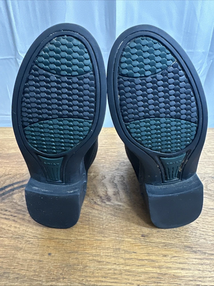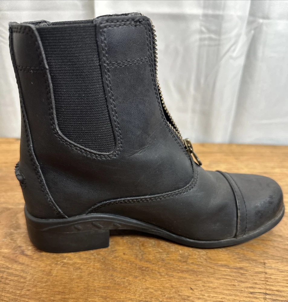The Ariat Boots in toddler size 13 are designed for casual wear, featuring an almond toe shape, low block heel, and ankle shaft style. These black leather riding boots have a zip closure for easy on and off, with cushioned insoles for moderate comfort. The boots are adorned with zipper accents and the Ariat logo, perfect for young girls who enjoy equestrian activities or have a love for horses and cowboys. Built with rubber outsoles for traction, these boots are suitable for all seasons and provide a standard width fit. Pre-owned condition. The boots are in great shape. The insole cushion has been removed. See photos,