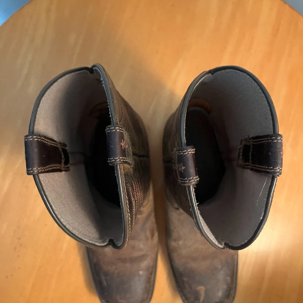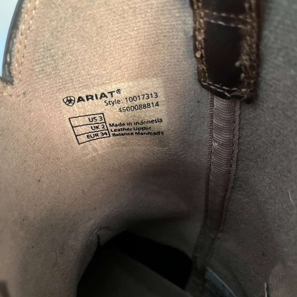Country/Region of Manufacture:IndonesiaProduct Line:AriatStyle:WesternColor:BrownType:BootUS Shoe Size:3Theme:Western, CowboyShoe Shaft Style:Mid-CalfDepartment:BoysFeatures:ComfortSeller Notes:“These are in very good shape. Great for farm work! Much life left in them.”Performance/Activity:Fishing, Hunting, Riding, WalkingUpper Material:LeatherClosure:Pull OnCustomized:NoPattern:SolidToe Shape:Square ToeFabric Type:LeatherEU Shoe Size:34Shoe Width:StandardVintage:NoBrand:AriatOccasion:CasualCharacter:BootsSeason:Spring, Fall, Summer, WinterUK Shoe Size:2