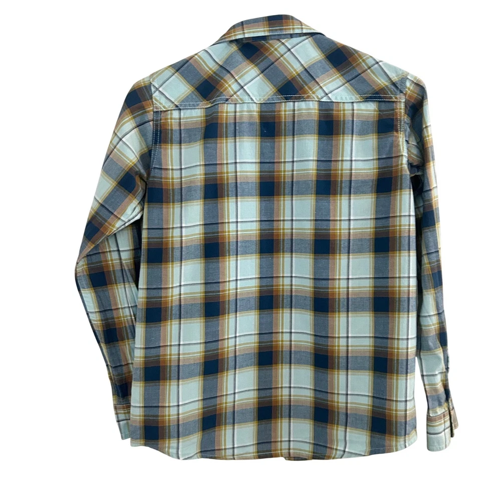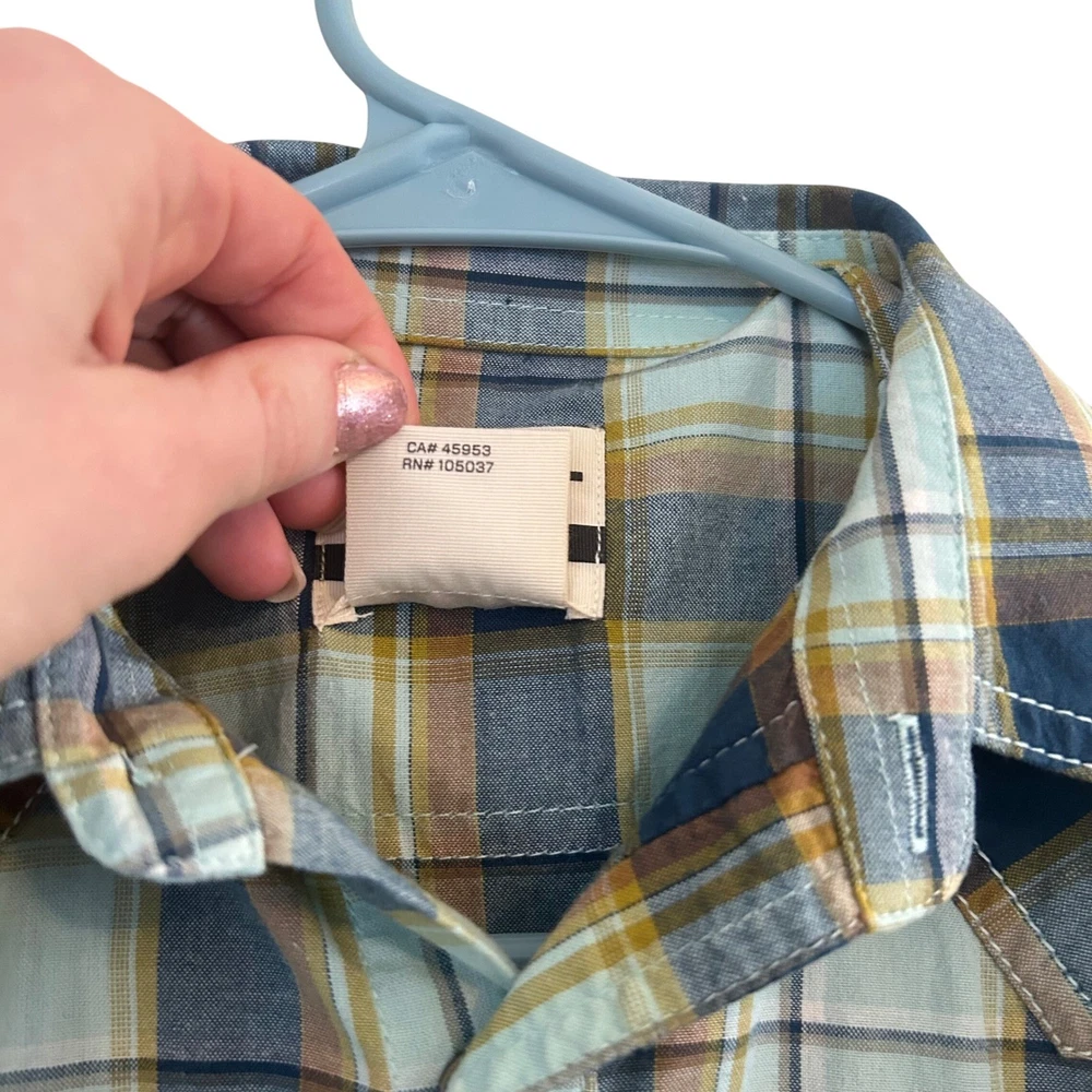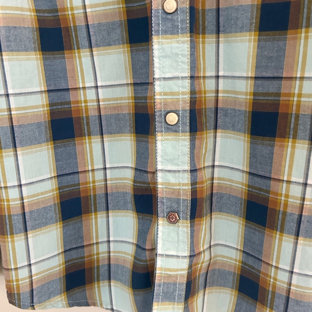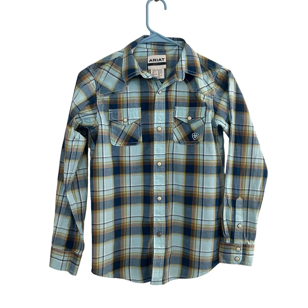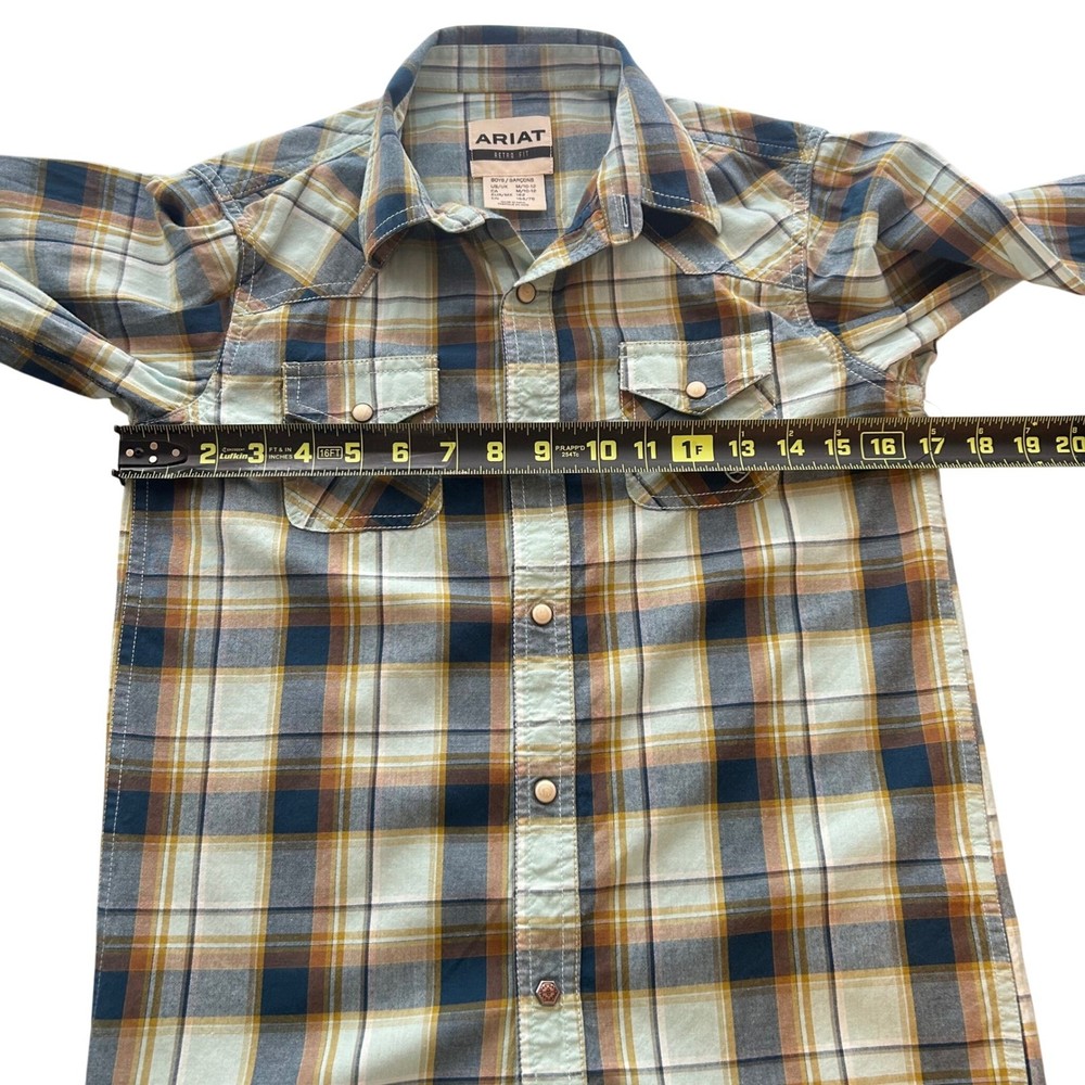 Ariat Habney Retro Snap long sleeve shirt features a classic plaid pattern in shades of blue, tan, and yellow. This Western-style top is designed with a retro fit, pointed yokes, and dual chest pockets with snap closures. The pearlized snap buttons and embroidered logo detail on the pocket add a touch of authentic cowboy style to this durable cotton-blend garment. This item is in good used condition. Keywords: Western, Cowboy, Rodeo, Plaid, Retro, Country, Southwestern, Pearl Snap, Workwear, Ranch, Casual, Habney, Rugged Brand: Ariat Product Type: Button-Up Shirt Style: Western / Retro Fit Sleeve Length: Long Sleeve Closure: Snap Button Pattern: Plaid Color: Blue, Tan, Yellow Material: Cotton Blend Features: Chest Pockets, Pointed Yoke Model: Habney 10043716 Measurements: • Chest (Pit-to-Pit): 17" (34" doubled) All items come from a smoke free, golden retriever dog friendly home. All of items unless NWT or Dry Clean Only are washed with Tide. We try our best to disclose any flaws with items, if we miss something please reach out and let us know.