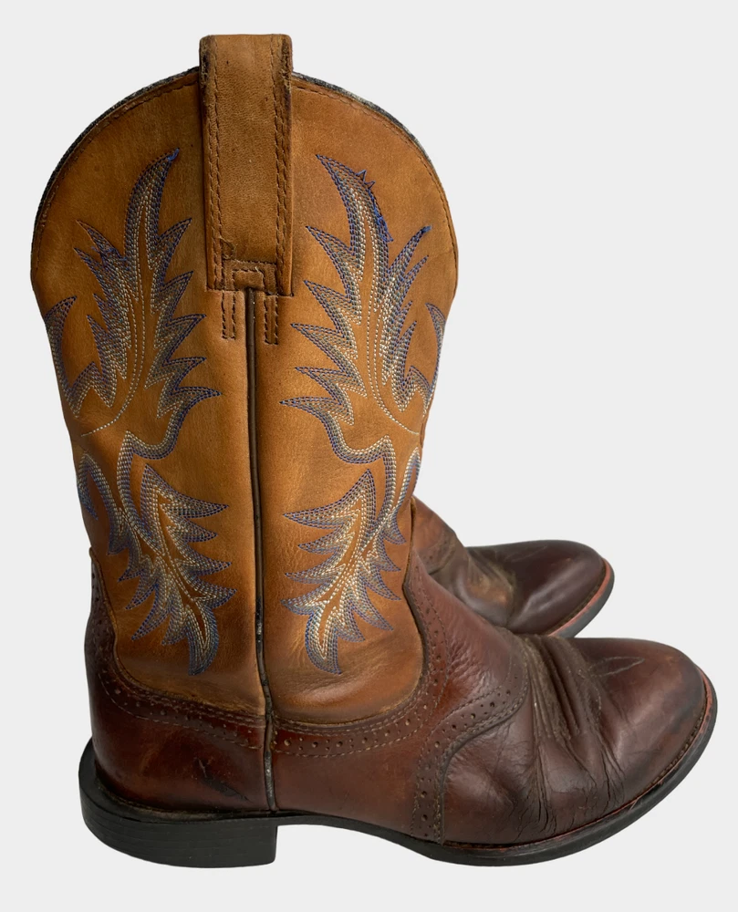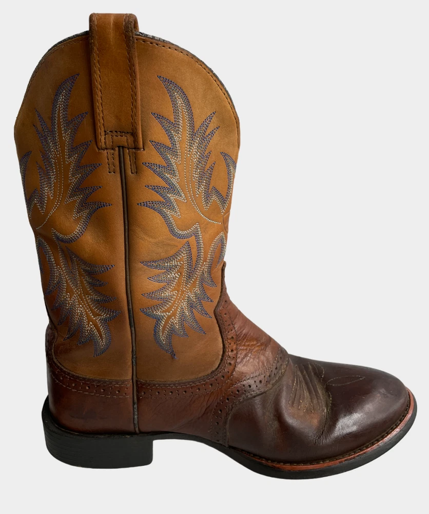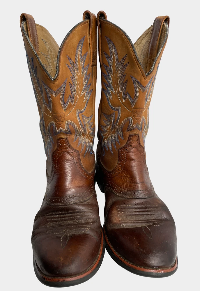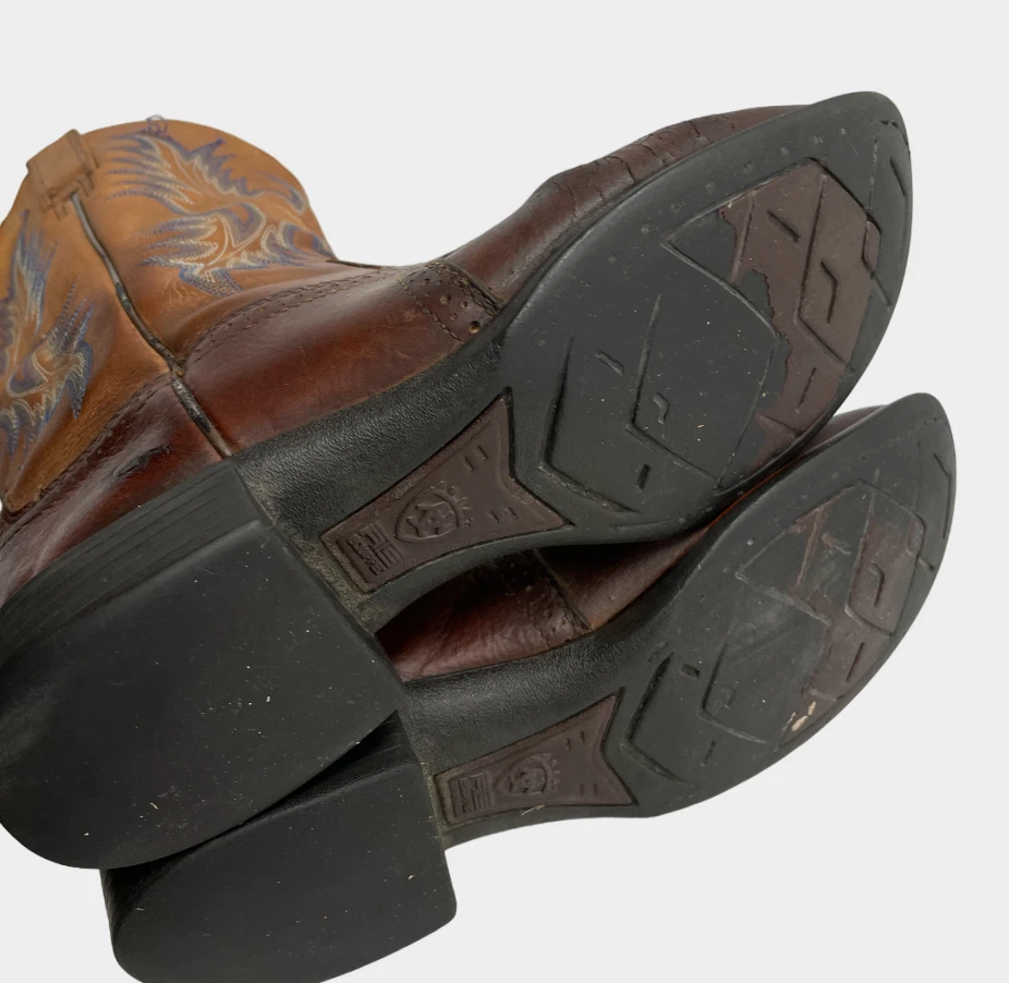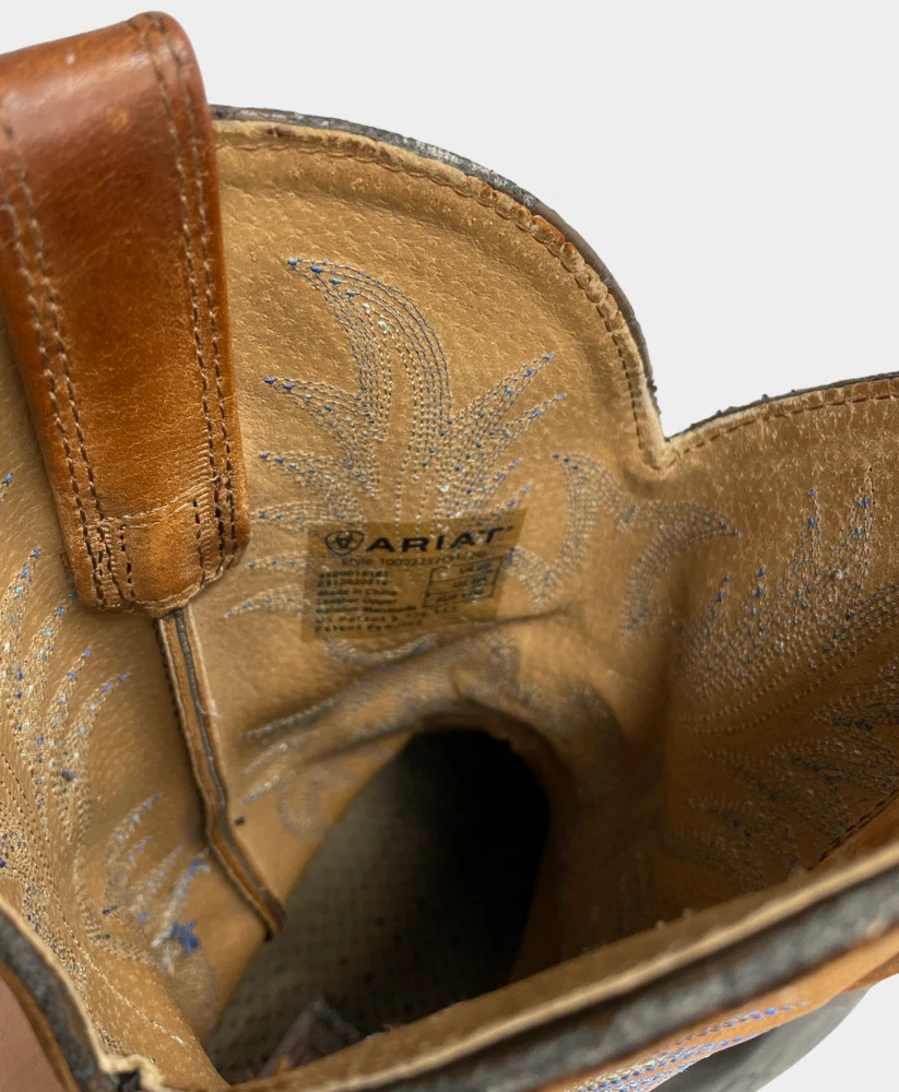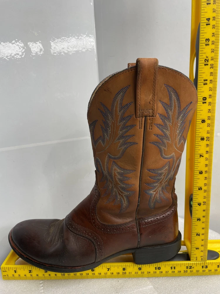 Type: Boot Accents: Embroidered Style: Western Features: Comfort Closure: Pull On Product Line: Ariat Heritage Stockman Color: Brown Theme: Biker, Cowboy, Motorcycle, Western Upper Material: Leather Department: Men Model: 34920 Toe Shape: Almond Toe Shoe Width: D Pattern: Western US Shoe Size: 9 Brand: Ariat