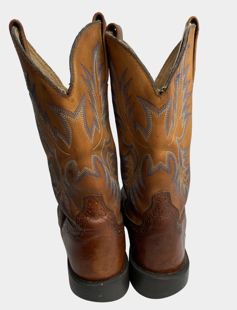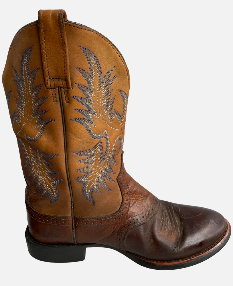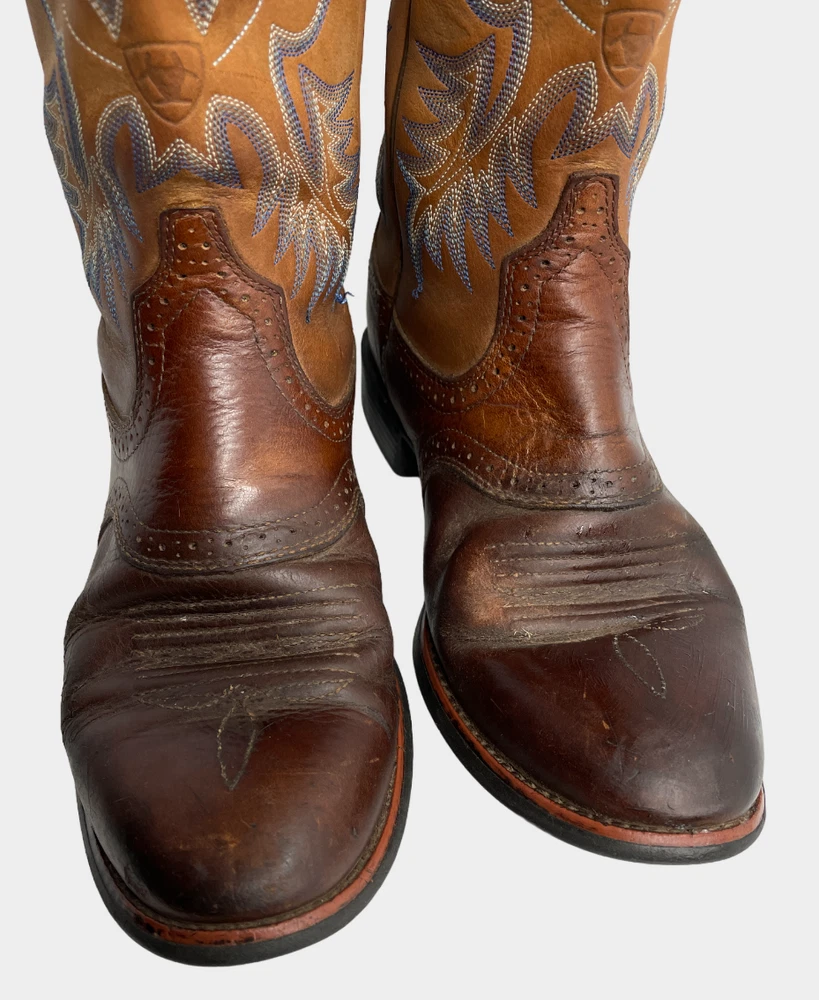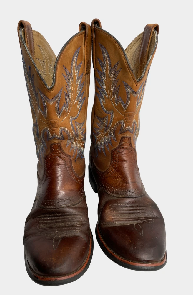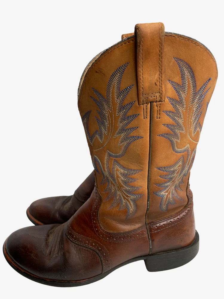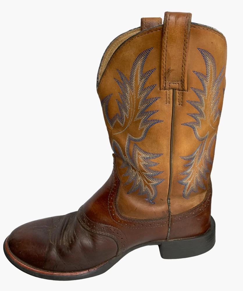 Type: Boot Accents: Embroidered Style: Western Features: Comfort Closure: Pull On Product Line: Ariat Heritage Stockman Color: Brown Theme: Biker, Cowboy, Motorcycle, Western Upper Material: Leather Department: Men Model: 34920 Toe Shape: Almond Toe Shoe Width: D Pattern: Western US Shoe Size: 9 Brand: Ariat