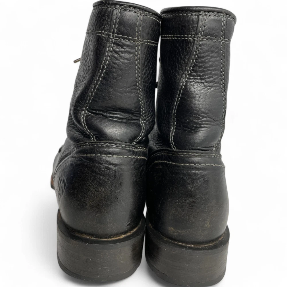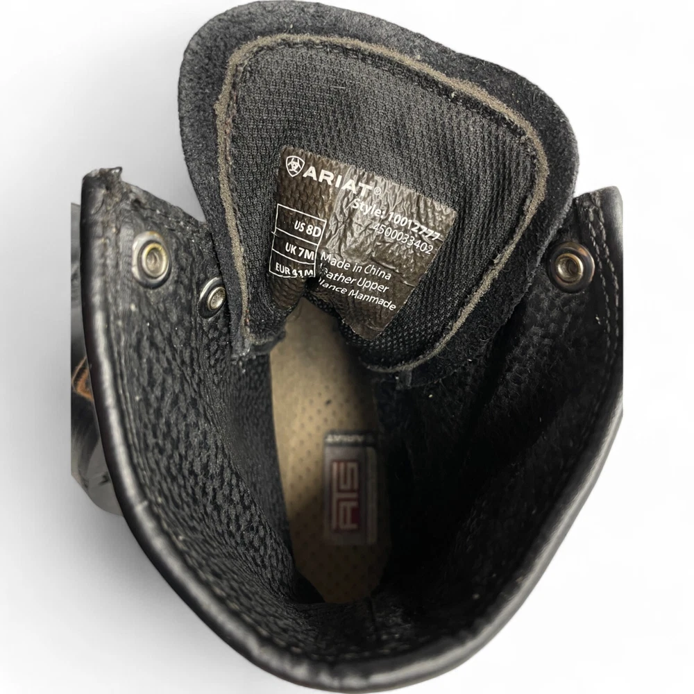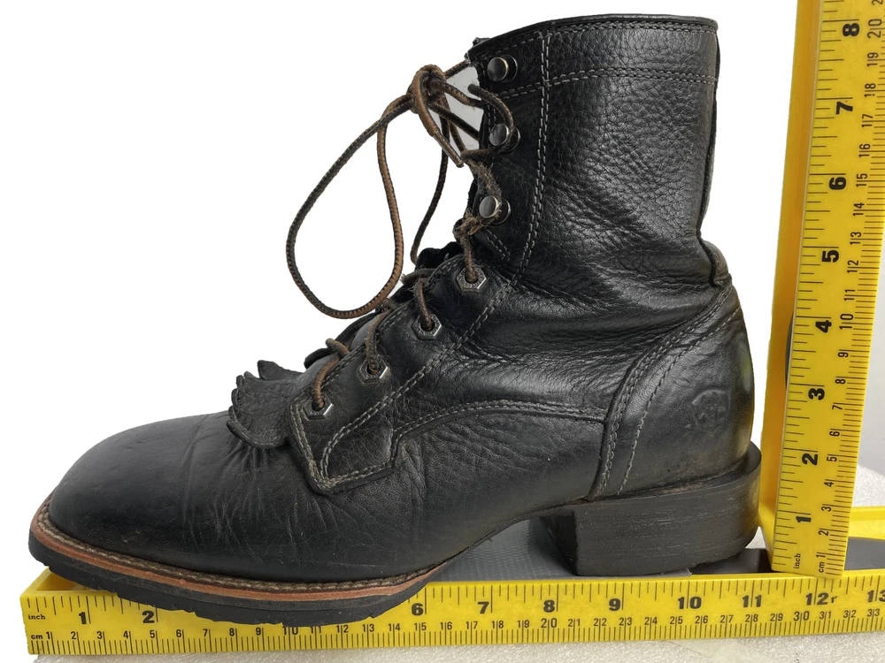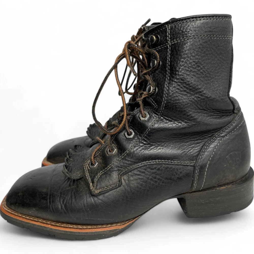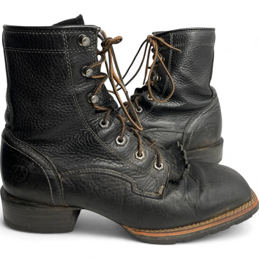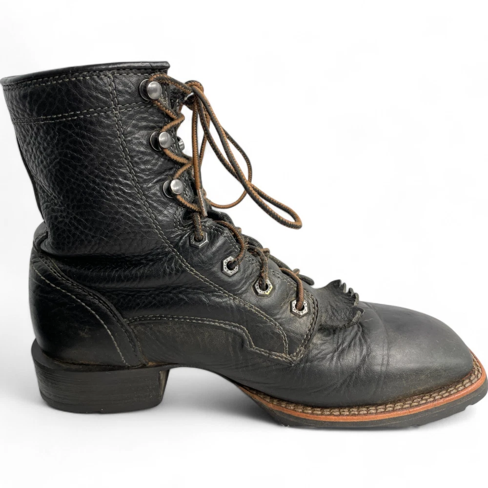 Style: Work Features: Comfort Pattern: Solid Closure: Lace Up Department: Men Type: Boot Product Line: Ariat Hybrid Lacer Toe Shape: Square Toe Brand: Ariat Model: Ariat 10012777 US Shoe Size: 8 Upper Material: Leather Shoe Width: D Color: Black Accents: Embroidered Theme: Biker, Cowboy, Western, Work