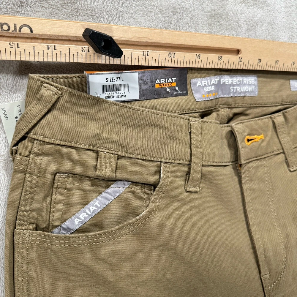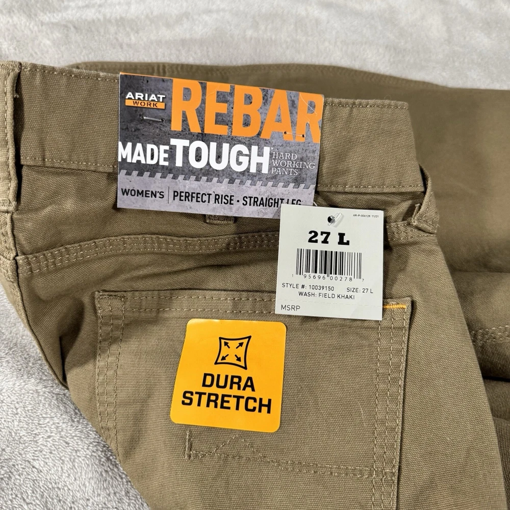 Upgrade your western or work wardrobe with these Ariat® Ladies Rebar DuraStretch Made Tough Field Khaki Pants. These pants come in size 27L and feature a button closure with belt loops. The 5-pocket design with side leg pocket accents and slim fit provide both style and functionality. Crafted from durable canvas fabric, these pants are perfect for all seasons and can be easily maintained with machine washable garment care. The solid brown color and mid-rise design add to the versatility of these jeans. Get your hands on the 2020-2029 model of these Ariat® jeans and make a statement in your field or western setting.