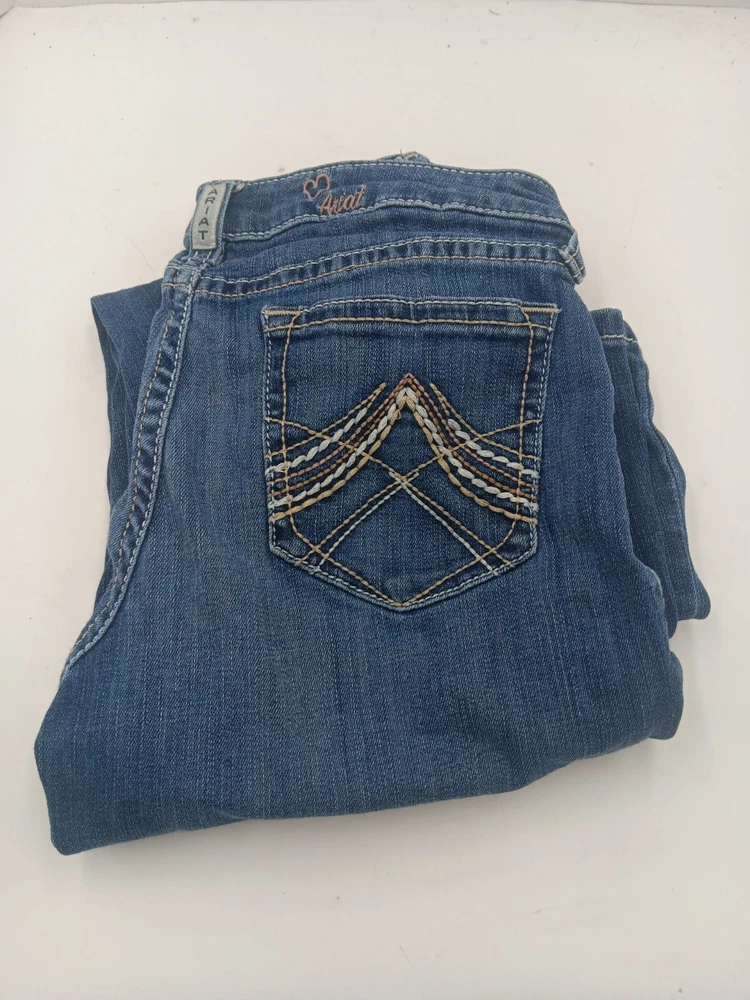 These Ariat jeans are a must-have for any stylish girl! Made with a blend of polyester, spandex, and cotton, they are comfortable and stretchy, and feature pockets for added convenience. The heavy stitch construction ensures durability, while the medium wash denim gives them a classic, timeless look. Perfect for any occasion, whether it's a party, casual outing, or formal event, these jeans have a versatile style that will complement any outfit. With a mid-rise fit and bootcut design, they are flattering and easy to wear. Whether you're walking, riding, or playing, these jeans are perfect for any activity. See pictures for best description. Inventory Sku: K