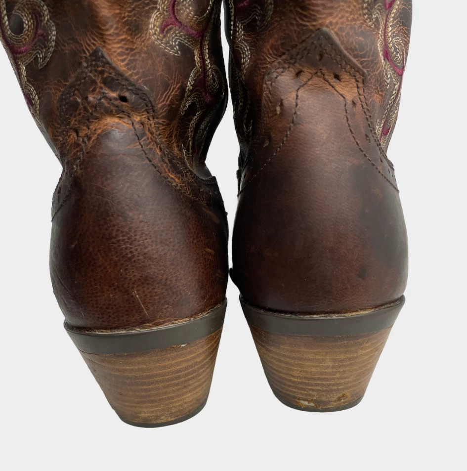 Color: Brown Model: 10007960 Toe Shape: Pointed Toe Closure: Pull On Heel Style: Block Brand: Ariat Features: Comfort Upper Material: Leather Theme: Cowboy, Cowgirl, Western Product Line: Ariat Wichita Heel Height: High (3-3.9 in) Shoe Shaft Style: Mid-Calf Style: Western Department: Women Type: Boot Occasion: Casual, Formal, Party/Cocktail Accents: Embroidered US Shoe Size: 6.5 Shoe Width: B Pattern: Western