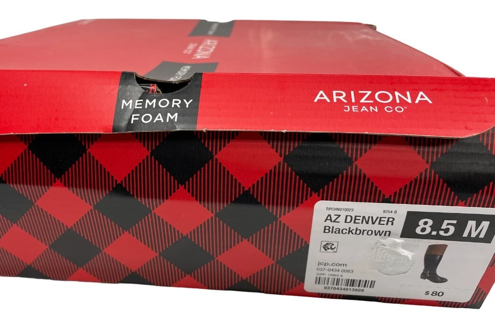 Features: Comfort, Lightweight, Memory Foam Closure: Zip Upper Material: Faux Leather Model: Denver US Shoe Size: 8.5 Character: Boots Theme: American, Equestrian, Modern Occasion: Business, Casual, Party/Cocktail, Travel, Workwear Pattern: Solid Accents: Buckle Type: Boot Color: Black brown Toe Shape: Round Toe Heel Height: Mid (2-2.9 in) Heel Style: Block Brand: Arizona Jean Co Style: Riding Boot Shoe Shaft Style: Knee High Shoe Width: M Department: Women