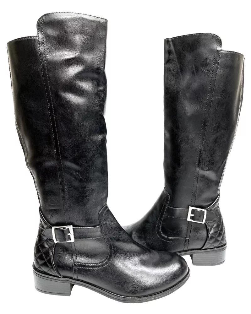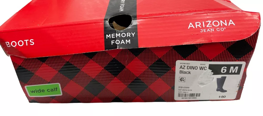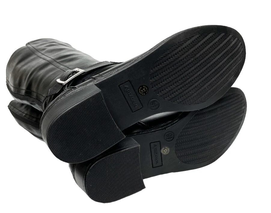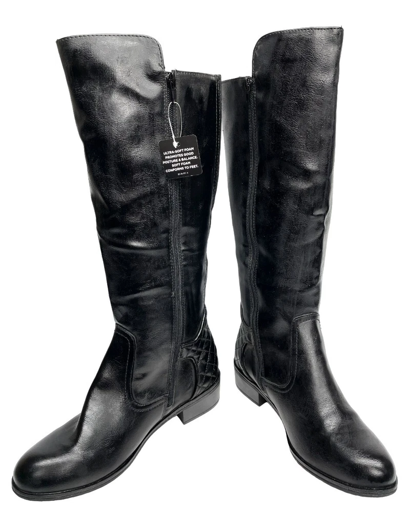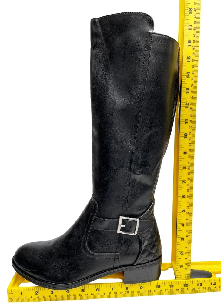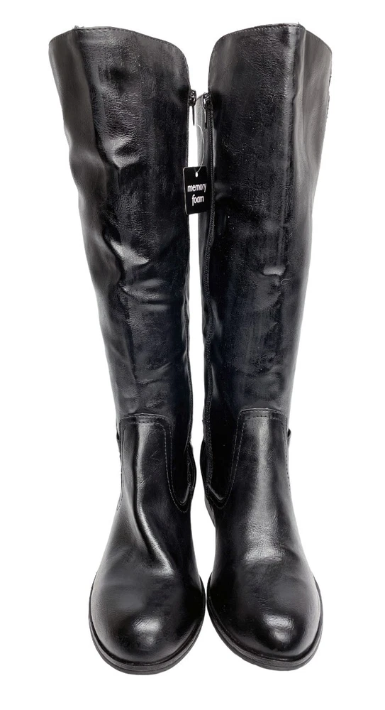 Heel Height: Low (1-1.9 in) Type: Boot Model: Denver Color: Black Style: Riding Boot Shoe Shaft Style: Knee High Theme: American, Equestrian, Modern Features: Comfort, Lightweight, Memory Foam Closure: Zip Upper Material: Faux Leather Toe Shape: Round Toe Character: Boots Brand: Arizona Jean Co Heel Style: Block Department: Women Calf Width: Wide Occasion: Business, Casual, Party/Cocktail, Travel, Workwear Pattern: Solid Accents: Buckle Shoe Width: M US Shoe Size: 6