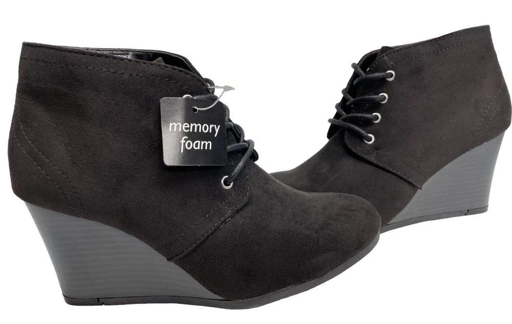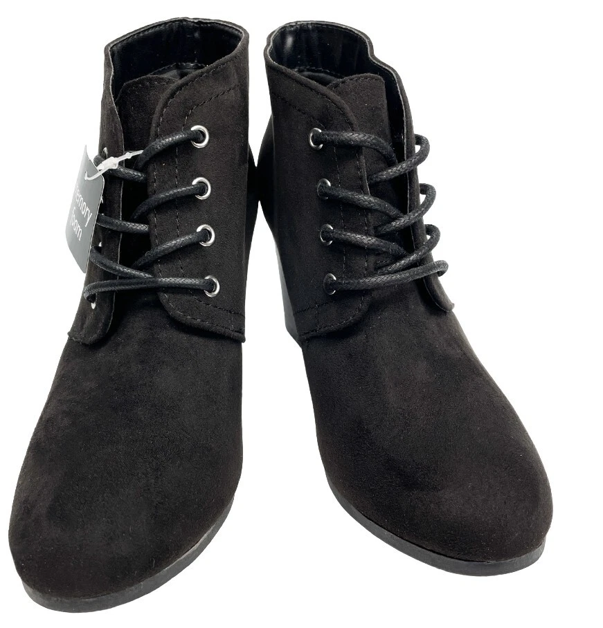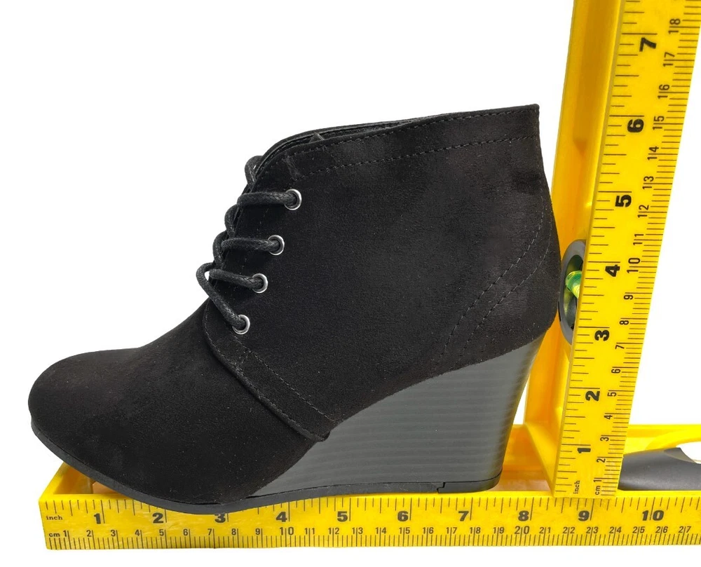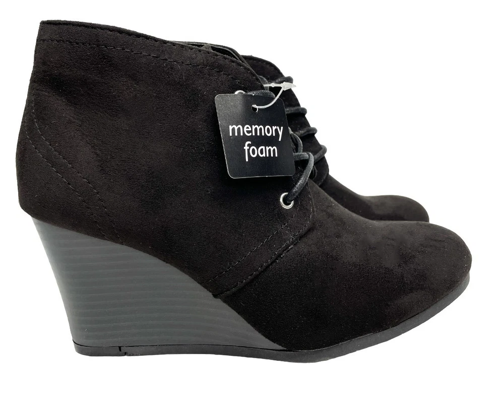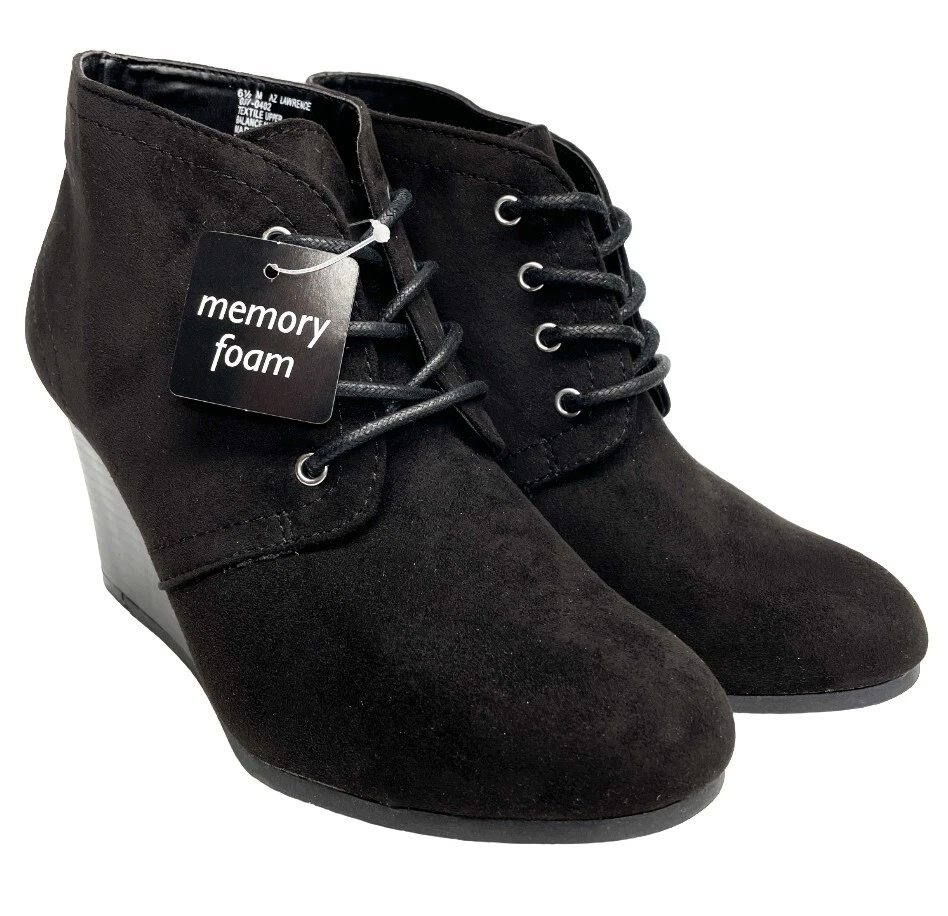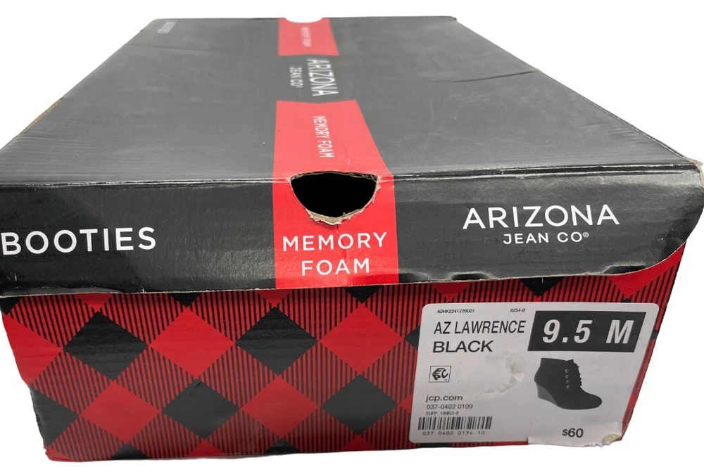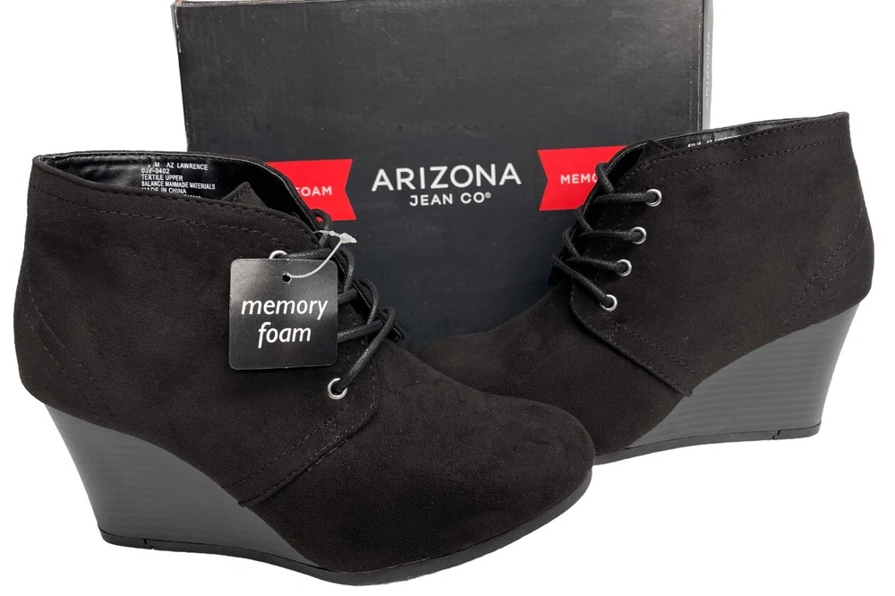 Closure: Lace Up Department: Women Upper Material: Faux Leather Type: Boot Theme: American, Modern Heel Style: Wedge Style: Bootie Shoe Width: M Features: Comfort, Lightweight, Memory Foam Heel Height: High (3-3.9 in) Shoe Shaft Style: Ankle Brand: Arizona Jean Co Toe Shape: Round Toe US Shoe Size: 9.5 Pattern: Solid Model: Lawrence Occasion: Business, Casual, Party/Cocktail, Travel, Workwear Character: Boots Color: Black