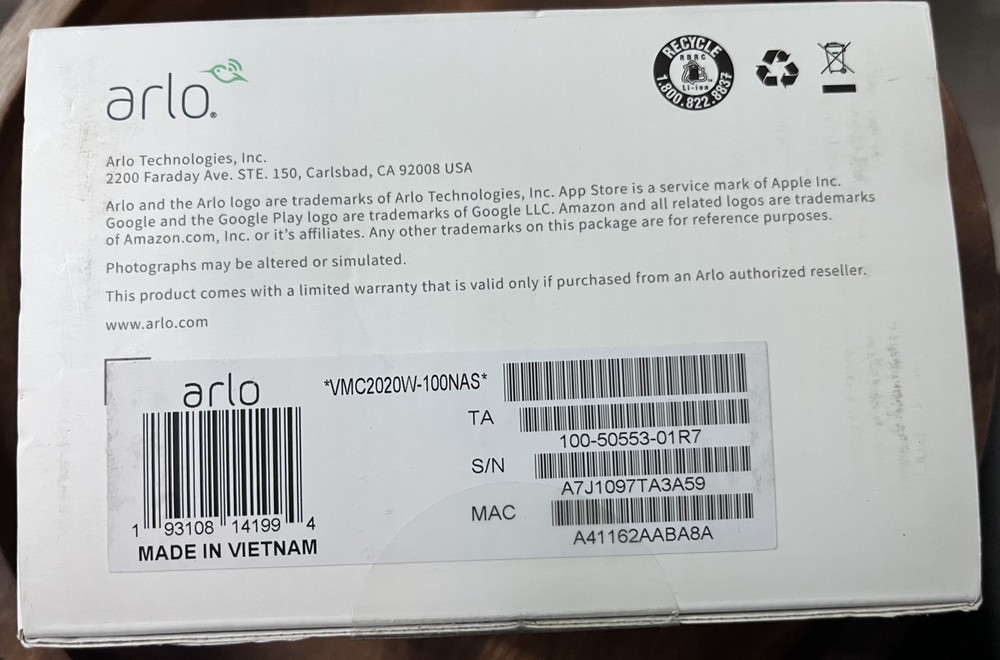 gtin13: 0193108141994 Location: Indoor/Outdoor Features: Outdoor/Weatherproof, Wi-Fi, Waterproof, Night Vision, Add-On Camera, Adjustable Magnet Color Mode: Color Power: 1000 W Storage Capacity: 2TB Item Width: 2 in Number of Zones: 1 Connectivity: Wireless, Wi-Fi Brand: Arlo Model: VMC2020W-100NAS Maximum Resolution: 1080p (FHD) UPC: 0193108141994 Power Source: Battery MPN: VMC2020W100NAS Type: Surveillance Camera Surveillance Technology: IP/Network Display Technology: LED LCD Smart Home Protocol: Wi-Fi Operating Sound Rating: 100 dB Number of Cameras Included: 1 Year Manufactured: 2020 Color: White Number of Channels: 1