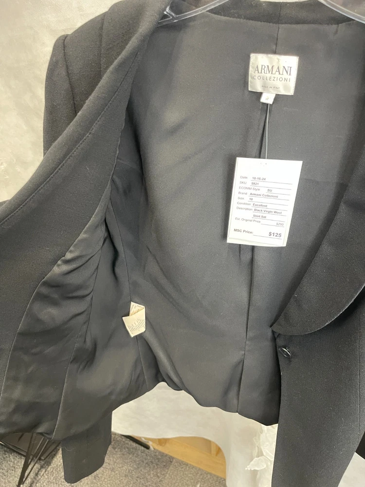 Armani Collezioni Black 2-pc Wool Skirt Suit 10 Brand: Armani Collezioni Overall Condition: Excellent condition. See pictures for details. Material: Wool and polyester lining Shipped with USPS Priority or Flat Rate, or if possible First Class Mail. Description: 2pc skirt suit, one button short, long sleeve blazer, skirt is a back zip elastic waist flared lower. Details for Shopper Shoulder: 16 inches Sleeve: 25 inches Bust: 19 inches Waist: 20 inches Length: 20 inches in the front, 22 inches in the back. Skirt: 32 inch waist, 24 inch length. Payment Policies We accept payment through PayPal, credit card, and debit card. Please note that the item may be relisted if payment is not received within the 10 day period. Shipping Policies Delivery estimates will be displayed at checkout. In-store pickup is also available if you would like to visit us in store. We ship to Continental United States only. Terms of Sale Each item we sell is unique. There are no exchanges for the same item available. All items are carefully inspected by My Sister’s Closet of Monroe County’s quality control team prior to shipping. Please carefully review item details. If you have questions, please message us regarding the item before purchasing. Note: Due to the different monitor and light effects, the actual color of the item shown might be slightly different from the color in pictures. Return Policy We strive to describe and measure our items accurately. If your order is not what you expected, we accept returns under the following conditions: The item was not as described as listed The wrong item was shipped. The item does not fit. If the wrong item was shipped, we will attempt to replace it with the item originally ordered. Please note - items not returned in the exact same condition, with tags attached, may be subject to a partial refund to account for loss of the item’s value. Please refer to eBay Return policy for more details. You are covered by the eBay Money Back Guarantee if you receive an item that is not described as listed. Return Requirements: The buyer must return the item within 30 days of receipt. Buyer is responsible for return shipping charges. The item(s) must be returned in the original condition, unworn, with tags attached. Thank you for shopping with us! A little bit more about us… My Sister’s Closet is a nonprofit serving women in poverty since 1998. Our mission is to help women move closer to economic self-sufficiency by providing essential career development tools. This includes job training, mentoring, advocacy services, and professional attire for job interviews to help them find employment. We have helped over 2800 women thus far. Most clients we serve have been dealing with homelessness, domestic violence, illness, divorce, job loss, economic recovery and/or lack basic education. Visit Our eBay Store