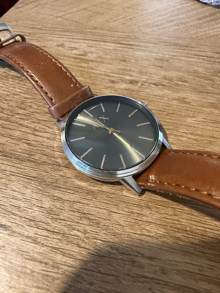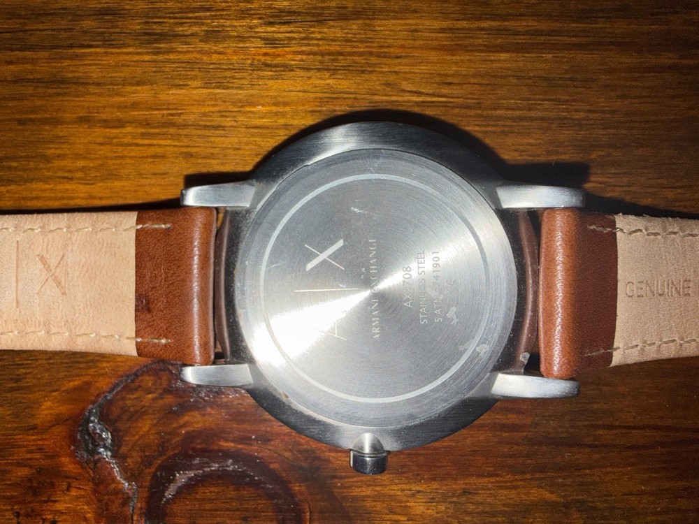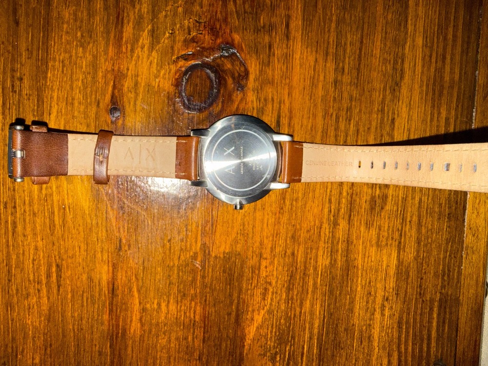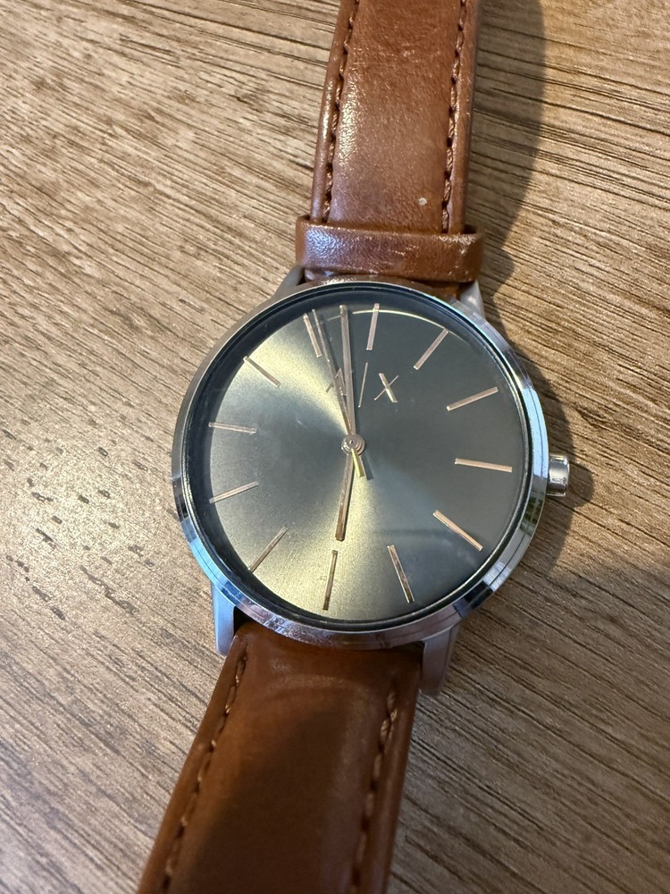 Armani Exchange (A|X) Men’s Wristwatch – Model AX2708 Stylish and minimalist Armani Exchange men’s watch featuring a stainless steel case and brown genuine leather strap. Clean, modern design suitable for everyday wear or casual dress. Details: Brand: Armani Exchange (A|X) Model: AX2708 Movement: Quartz Case Material: Stainless Steel Strap: Brown genuine leather Dial: Minimalist analog Gender: Men’s Origin: Made by Armani Exchange Condition: Pre-owned, in good condition Normal light wear consistent with use Crystal is clear Strap shows minor wear (see photos) Watch is running Included: Watch only (no box or papers) Ships securely and quickly. Feel free to message with any questions.