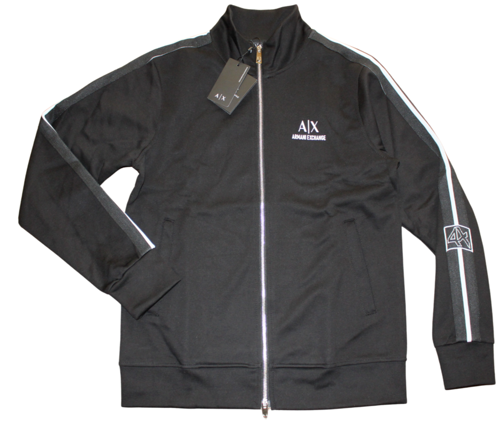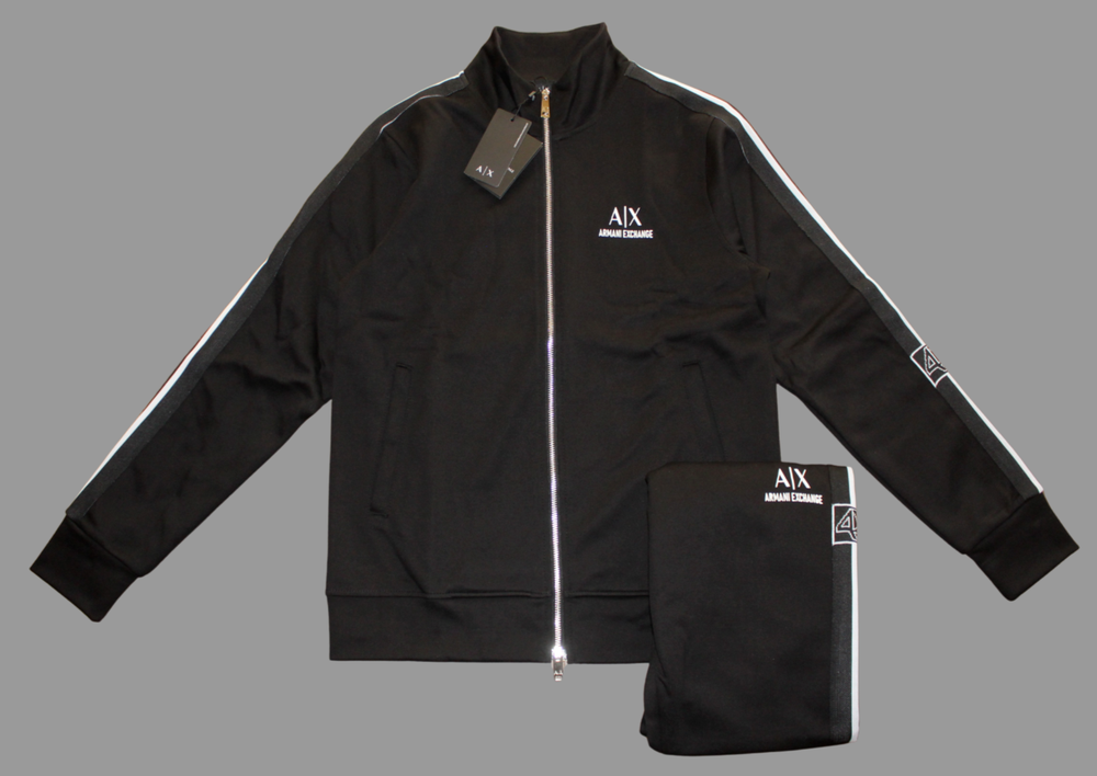 BNWT ARMANI EXCHANGE MEN TRACKSUIT SET INCLUDE TOP AND BOTTOMS BLACK COLOR WITH WHITE LOGO AND SIDE STRIPE FULL ZIP SWEATER WITH POCKETS REGULAR SIZE SHIP SAME OR NEXT WORK DAY FULL TRACKING SERVICE FAST SHIPPING TO USA 7-12 WORK DAYS FOR DELIVERY