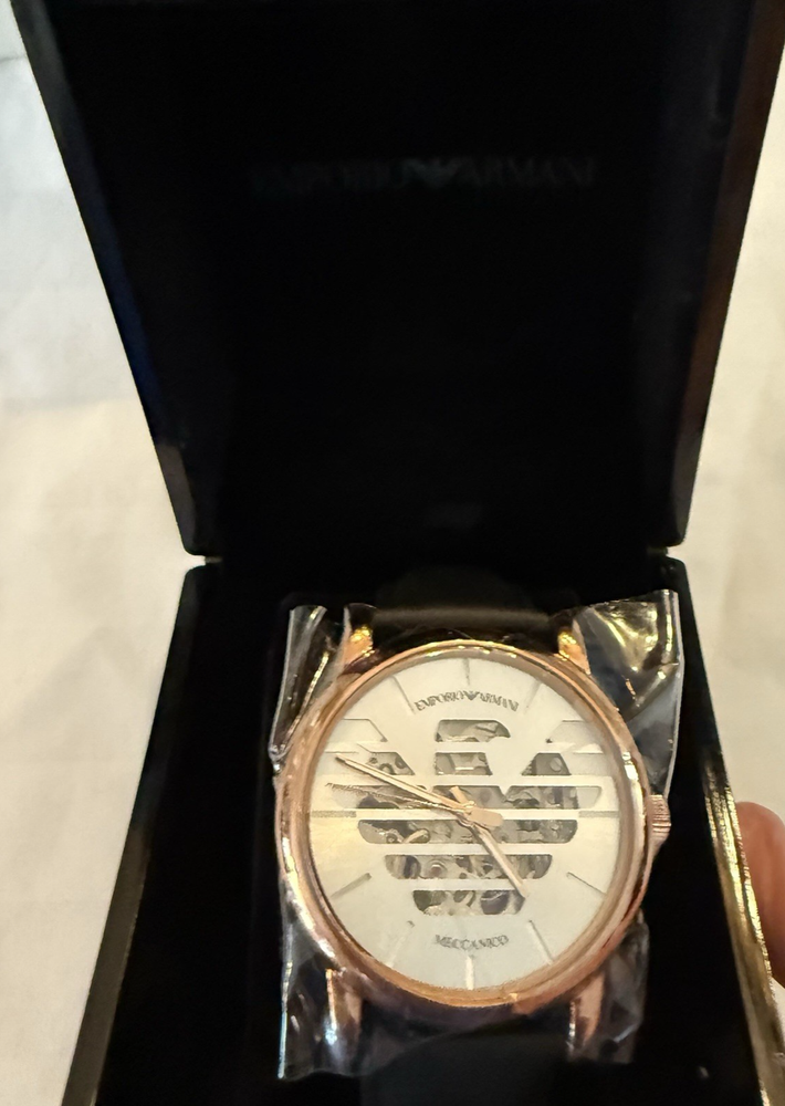 The Emporio Armani Luigi Skeleton Leather Automatic Men's Watch AR60031 is a stylish and sophisticated timepiece designed for men. This wristwatch features a sleek rose gold case color with a black leather band, making it a classic choice for formal occasions. With 21 jewels and an automatic movement, this watch offers precision and reliability. The watch comes with papers, original box/packaging, and is part of the Emporio Armani Meccanico collection, known for its elegant design and quality craftsmanship. Perfect for those looking for a dressy and functional timepiece that exudes luxury and style.
