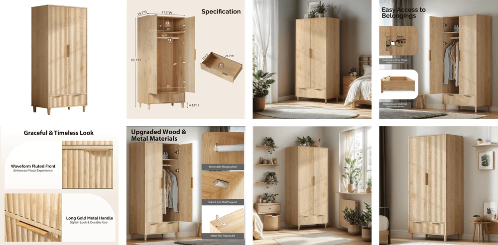 listing template Visit our store Sigh up for email Armoire Wardrobe Closet with Drawers & 2 Fluted Doors Tall Fluted Cabinets Introductions Maximize your bedroom storage with our Farmhouse Armoire Wardrobe, a charming freestanding closet that combines rustic elegance with practical organization. Measuring 31.5"L x 19.7"W x 69.3"H, this spacious cabinet features two fluted doors, a hanging rod, shelves, and drawers to accommodate clothing, linens, and accessories. The natural wood and white two-tone finish adds farmhouse character to any space, while the compact footprint fits comfortably in bedrooms, guest rooms, or apartments. With its versatile storage options and timeless design, this armoire provides a perfect solution for homes lacking built-in closets. Features Farmhouse Charm - Fluted doors with natural/white two-tone finish Multi-Level Storage - Hanging rod + shelves + 2 drawers Space-Saving Design - Fits snugly in corners or small bedrooms Sturdy Construction - Solid wood frame with metal hinges Easy Assembly - All hardware and instructions included Freestanding Convenience - No installation required Specifications Material: Engineered wood with metal hardware Dimensions: 31.5"L x 19.7"W x 69.3"H Hanging Space: 28" rod length Drawer Dimensions: 14"W x 16"D x 6"H each Shelf Dimensions: Adjustable heights Color: Natural wood/White Package Includes 1 x Armoire with 2 Fluted doors You might like this more>> 6-Tier Bamboo Bookshelf Adjustable Storage Shelf Rack $49.99 Professional Cello 4/4 Full Size BassWood Set with Bag $148.99 Stainless Steel 4 Tier Steamer Cooker Steam Pot Kitchen Food $39.29 110 LB x 0.1oz All-In-One Digital Postal Shipping Scale 50kg $22.79 2Pack 10000LM LED Zoomable Flashlight Torch Lamp Light $9.99 Mini Exercise Bike Desk Pedal Bicycle $35.14 Shipping Policy 1. Ship worldwide from New Jersey by reliable shipping companies -- USPS, UPS, FEDEX, DHL, etc., and only to VERIFIED PAYPAL ADDRESS. Transport Delivery ETA. Package handling only takes 1 business day at our warehouse, so please make sure entering correct payment and shipping information before checking out. Once your payment is completed, we are not going to accept any more changes to your order. 2. International Buyers – Please Note: a. Import duties, taxes and charges are not included in the item price or shipping charges. These charges are the buyer's responsibility. b. Please check with your country's customs office to determine what these additional costs will be prior to bidding/buying. 3. Please check your shipping address carefully before checkout, it can't be changed if order completed. 4. Orders placed on weekend will be shipped within 2 days.Notification of shipment with tracking number will be sent to buyers. 5. Standard shipping: 2-7 business days Expedited Shipping: 2-3 business days One-day Shipping: 1 business day International shipping: Varies 6.Ship within 1 business day once payment completed. Notification of shipment with tracking No. will be sent to buyer. 7.We offer discounts for combine shipping. Please contact us first if you need combine shipping, and an invoice with discount will be sent to you. 8.Please allow 5 business days for delivery to US destinations on any eBay orders and 14 business days for delivery to any International destinations. We highly recommend our buyer choose priority/expess mail for international delivery which is much more stable. Return Policies 1. Refunds given only if item DOA and cannot be replaced via PAYPAL . If so, Please contact us with 5 days since you receive the item and and return to us within 30 days from the delivery date for exchange or refund. 2. If you need return, please contact our customer service representative, let us know the detailed problem and send us some pictures for confirmation. Payment Payment should be sent within 8(EIGHT) days of auction closing. Feedback If you are dissatisfied for any reason, please do not be quick to leave negative/neutral feedback. We work hard to make sure EVERY CUSTOMER 100% SATISFIED and resolve any problem for you. Work Time Work Time: Monday to Saturday About Us | Newsletter| Feedback| Contact Us Copyright © 2021 Yallstock. All rights reserved. 无标题文档 Armoire Wardrobe Closet with Drawers & 2 Fluted Doors Tall Fluted Cabinets Introductions Maximize your bedroom storage with our Farmhouse Armoire Wardrobe, a charming freestanding closet that combines rustic elegance with practical organization. Measuring 31.5"L x 19.7"W x 69.3"H, this spacious cabinet features two fluted doors, a hanging rod, shelves, and drawers to accommodate clothing, linens, and accessories. The natural wood and white two-tone finish adds farmhouse character to any space, while the compact footprint fits comfortably in bedrooms, guest rooms, or apartments. With its versatile storage options and timeless design, this armoire provides a perfect solution for homes lacking built-in closets. Features Farmhouse Charm - Fluted doors with natural/white two-tone finish Multi-Level Storage - Hanging rod + shelves + 2 drawers Space-Saving Design - Fits snugly in corners or small bedrooms Sturdy Construction - Solid wood frame with metal hinges Easy Assembly - All hardware and instructions included Freestanding Convenience - No installation required Specifications Material: Engineered wood with metal hardware Dimensions: 31.5"L x 19.7"W x 69.3"H Hanging Space: 28" rod length Drawer Dimensions: 14"W x 16"D x 6"H each Shelf Dimensions: Adjustable heights Color: Natural wood/White Package Includes 1 x Armoire with 2 Fluted doors Shipping + 1. Ship worldwide from New Jersey by reliable shipping companies -- USPS, UPS, FEDEX, DHL, etc., and only to VERIFIED PAYPAL ADDRESS. Transport Delivery ETA. Package handling only takes 1 business day at our warehouse, so please make sure entering correct payment and shipping information before checking out. Once your payment is completed, we are not going to accept any more changes to your order.