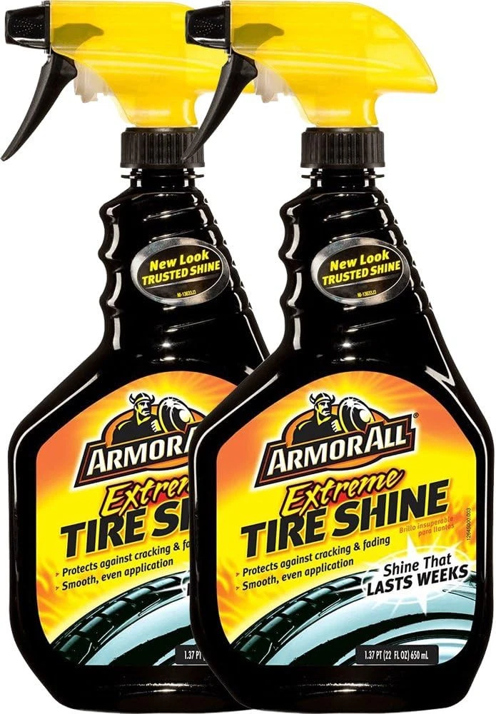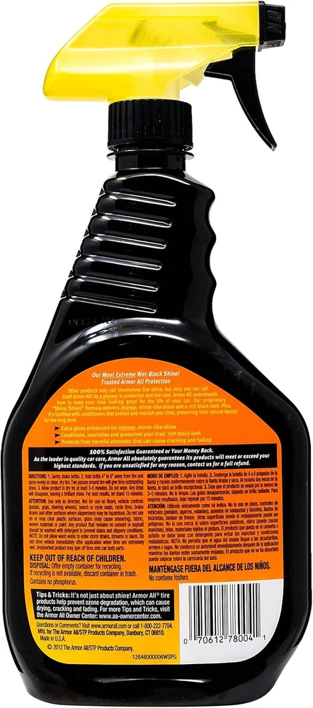 Product Description Armor All Extreme Tire Shine, Tire Cleaner and Black Shine, Trigger Spray, 22 Ounce (Pack Of 1) Armor All, 22 OZ, Extreme Tire Shine, Extra Gloss Enhancers For Intense, Smooth, Even Shine Conditions, Nourishes, & Preserves Your Tires Rich Black Look, Precision Applicator Provides Smooth, Even Shine Without Messy Over Spray, Protects From Harmful Elements That Can Cause Cracking & Fading, 1 Step, Easy Application, No Wiping, Trigger Spray. Armor All Extreme Tire Shine Spray gives your tires an extreme shine finish with an easy-to-use spray application. Made with a proprietary Shine-Shield formula featuring extra gloss enhancers, this tire protectant spray gives your tires an intense mirror-like shine with a rich black appearance to keep them looking like new. Conditioners fortify the tire protection spray to protect and nourish your tires, preserving their natural beauty with car care products that are easy to apply. The tire conditioner prevents cracking and fading caused by harmful elements to make your tires last longer and look better. 22 oz bottle of Armor All Extreme Tire Shine Spray Tire protection spray offers smooth and even application for extreme shine Easy-to-use car care products use extra gloss enhancers for tire conditioner with mirror-like shine Tire spray fortified with conditioners to protect and nourish tires for a deep black color Extra gloss enhancers for intense, mirror-like shine Conditions, nourishes, and preserves your tires' rich Black look Protects from harmful elements that can cause Cracking and fading Fit type: Universal Fit Tire protectant spray prevents cracking and fading Simply spray onto clean, dry tires and allow spray to dry for instant extreme shine Armor All tire shine results last for weeks Product Type - AUTO ACCESSORY Indications FIRST AID: INGESTION: DO NOT INDUCE VOMITING. Get prompt medical attention. EYE CONTACT: Remove contact lenses. Immediately flush eyes thoroughly with plenty of water for 15 minutes. Get medical attention. SKIN CONTACT: Remove contaminated clothing. Wash area with soap and water. If irritation persists, get medical attention. INHALATION: Remove to fresh air. If breathing problems or irritation persist, get medical attention.