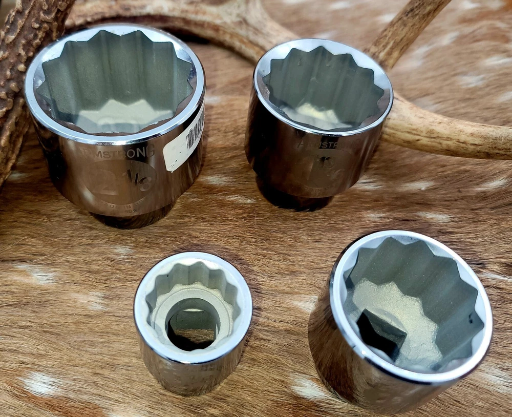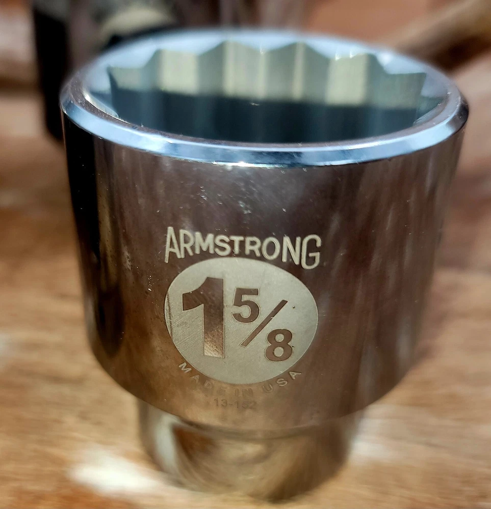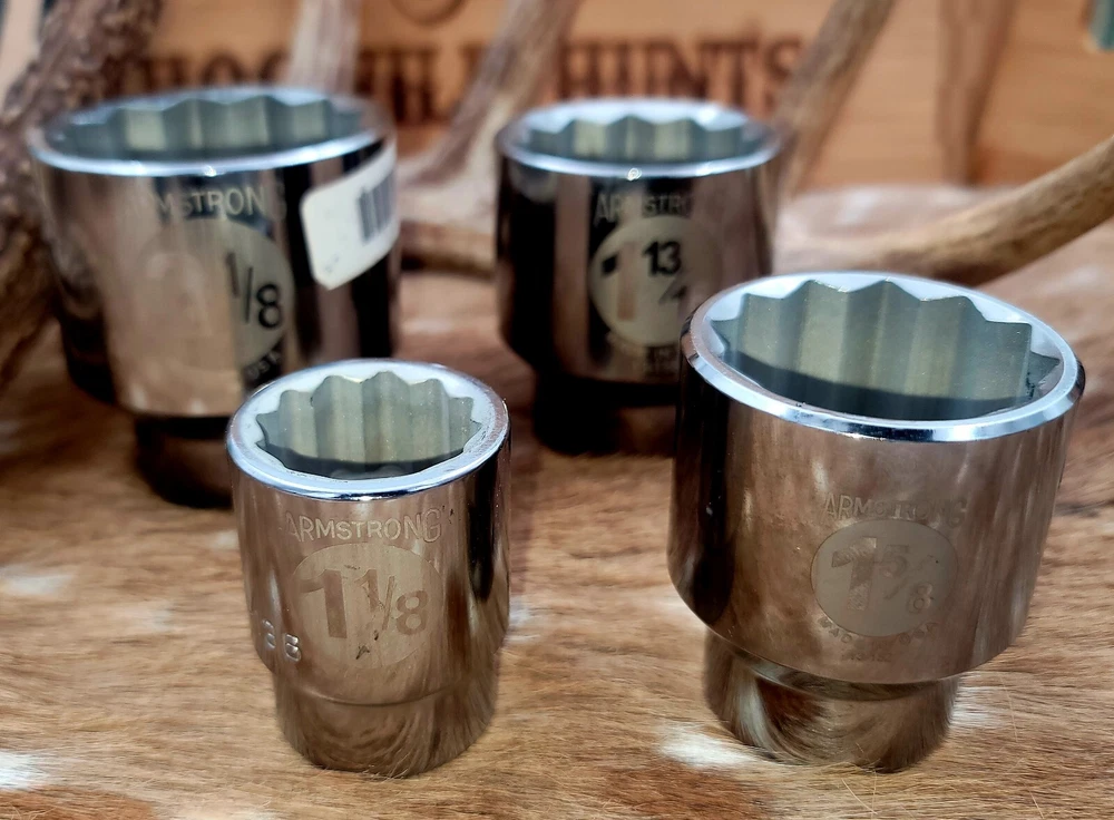 This Armstrong 3/4 inch Dr. Sockets set is the perfect addition to any mechanic's or DIY enthusiast's tool collection. Made with a durable chrome surface finish and 12 point design, these sockets are built to last and provide a secure grip on your fasteners. The set includes a variety of sockets, all made in the United States, ensuring that you have the right tool for any job. Whether you're a professional mechanic or a weekend warrior, this set is sure to impress. This is NEW OLD STOCK. Sizes 1-13/16, 2-1/8, 1-5/8, 1-1/8. 1 of each socket is included. Total of 4 sockets.