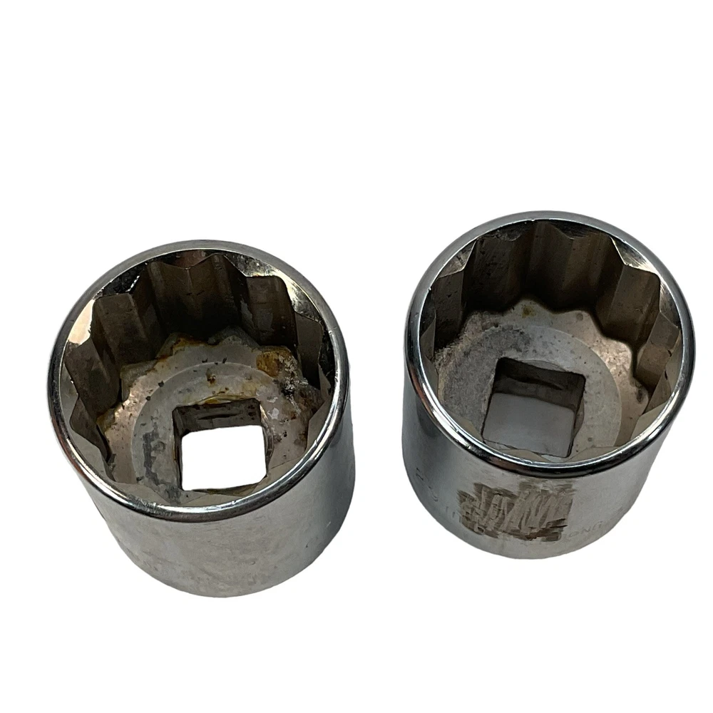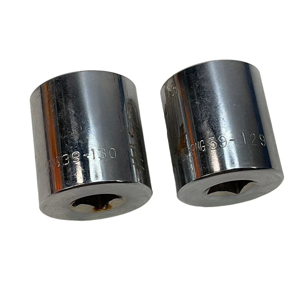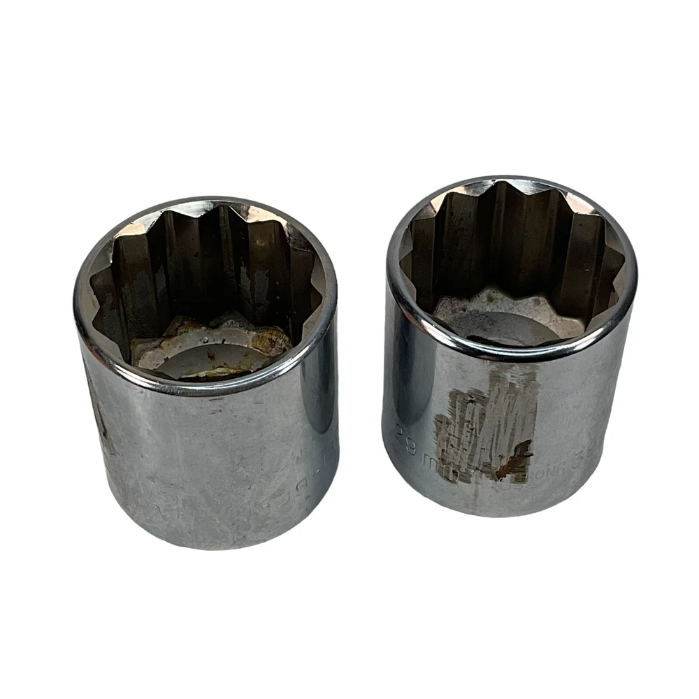 This set of Armstrong Tools chrome sockets is perfect for all your automotive needs. The lot includes two sockets in sizes 29mm and 30mm, both with a 1/2" drive and 12 point design. The high-quality chrome finish ensures durability and longevity, while the standard socket type and metric system of measurement make them versatile for a wide range of projects. Both sockets are in great working condition and ready to be used on your next project. The manufacturer part number is 39-130 and 39-129, and the set comes with a total of two pieces. Trust in the quality of Armstrong Tools and add this set to your collection today! Sockets do have previous owner marks.