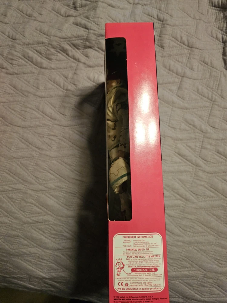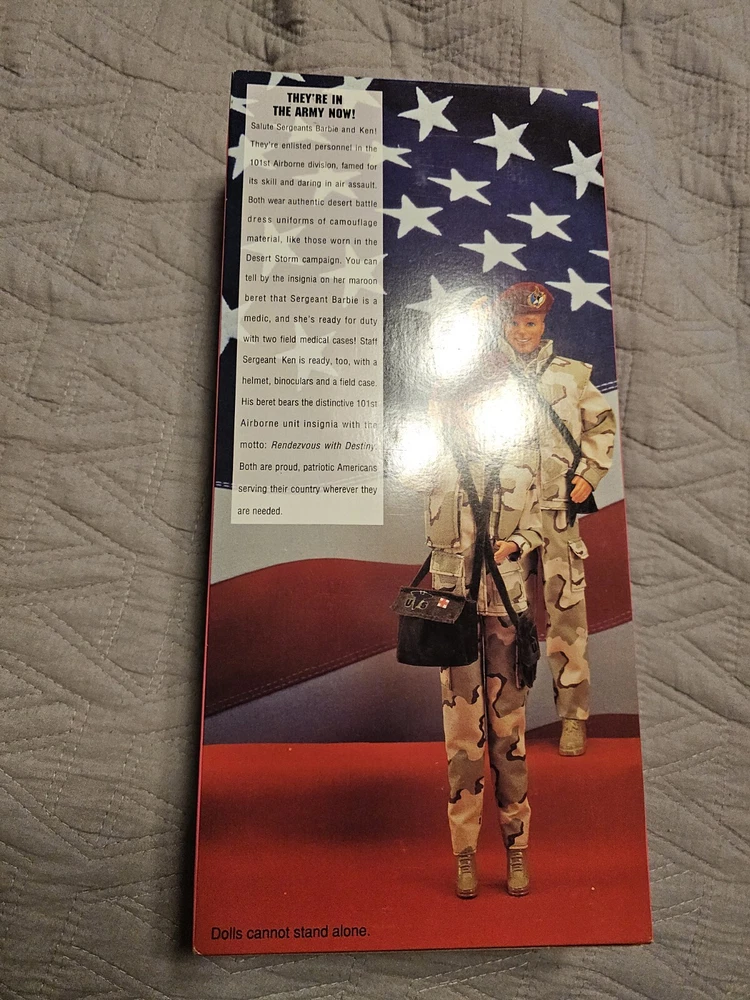 This is a vintage Barbie doll set from the Stars and Stripes product line, manufactured in 1992. The set includes an Army Barbie doll with blonde hair and blue eyes, along with her boyfriend Ken. The dolls come in their original, unopened packaging and are in special edition format. This set is an original, licensed reproduction from the 1990-1999 time period and features Barbie's classic fashion doll design. The dolls are of Caucasian ethnicity and the set includes only the dolls themselves. In perfect condition!