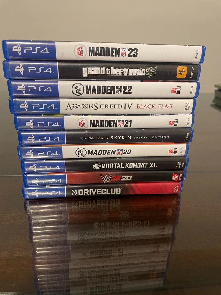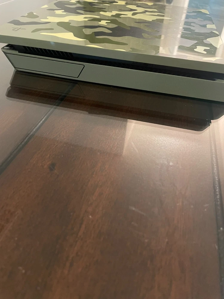 Super Great Buy for the holidays! Army Fatigue colored console with three controllers and 10 PS4 games. Games include: Madden 23, 22, 21, 20, Grand Theft Auto 5, Assassins Creed 4, Skyrim, Mortal Kombat XL, W2K20, and Drive Club. Game console works. Scratches on top surface of console, small crack at ps4 right side port, and back panel slightly loose on back side of console.
