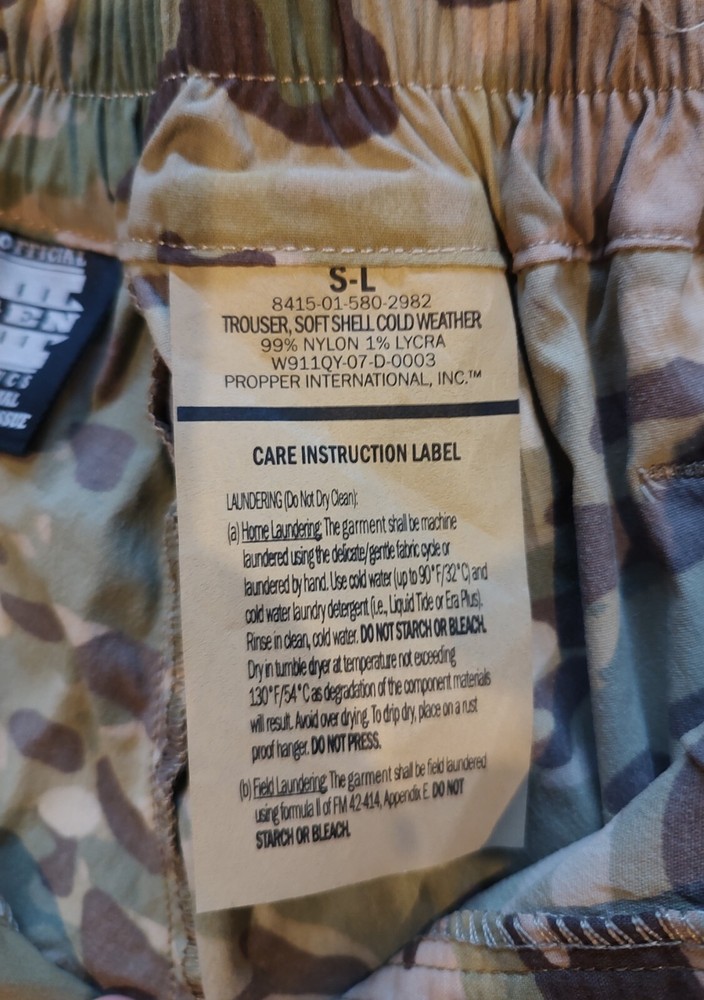Military Issued Gen III Layer 5 Small Long OCP Stay warm and protected with these Soft Shell Cold Weather Pants in Multicam OCP. Designed for durability and comfort, these tactical trousers feature a windproof, water-resistant soft shell to withstand harsh weather conditions. The breathable yet insulated fabric ensures warmth without overheating, while reinforced knees and adjustable waist tabs provide a secure fit. Perfect for military, tactical, and outdoor use, these Small Long pants offer exceptional mobility and all-weather performance.