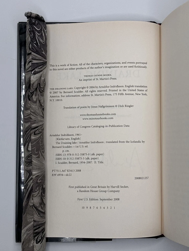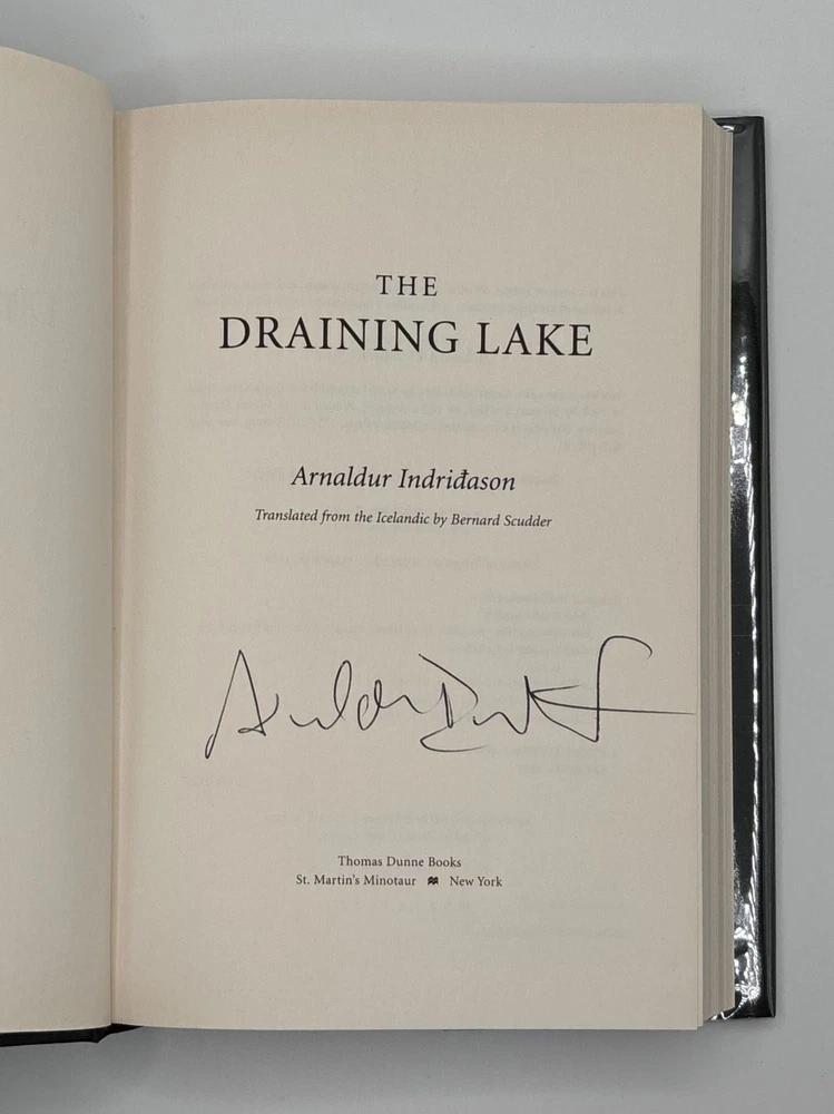 THE DRAINING LAKE [Signed] Author: Indridason, Arnaldur [Author]; Scudder, Bernard [Translator] Title: THE DRAINING LAKE [Signed] Publication: New York, New York: Thomas Dunne Books, 2008 Edition: First U.S. Edition, First Printing Description: Octavo, 312 pages. In Very Good condition with Near Fine condition dust jacket. Spine is black with white and light blue lettering. Dust jacket protected by mylar covering, price uncut: "$24.95" on front flap. Boards have mild shelving wear along extremities. Signed flat by Arnaldur Indridason [Author] on publisher's limitation page. Shelved in hallway. Seller ID: 1392215 Subject: Literature Welcome to the eBay store of Second Story Books! DC's Oldest Rare and Used Bookstore, Second Story Books operates two open shops in the Washington D.C. metropolitan area. We have an extensive internet presence and provide accredited appraisals member ASA. This listing was created by Bibliopolis.