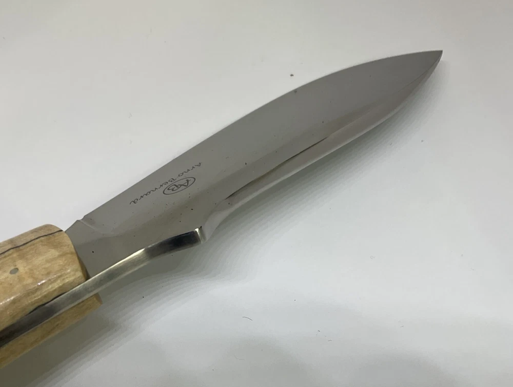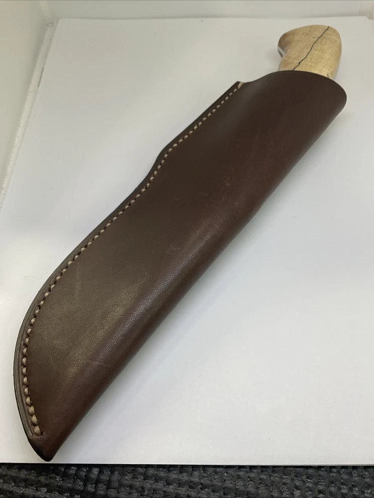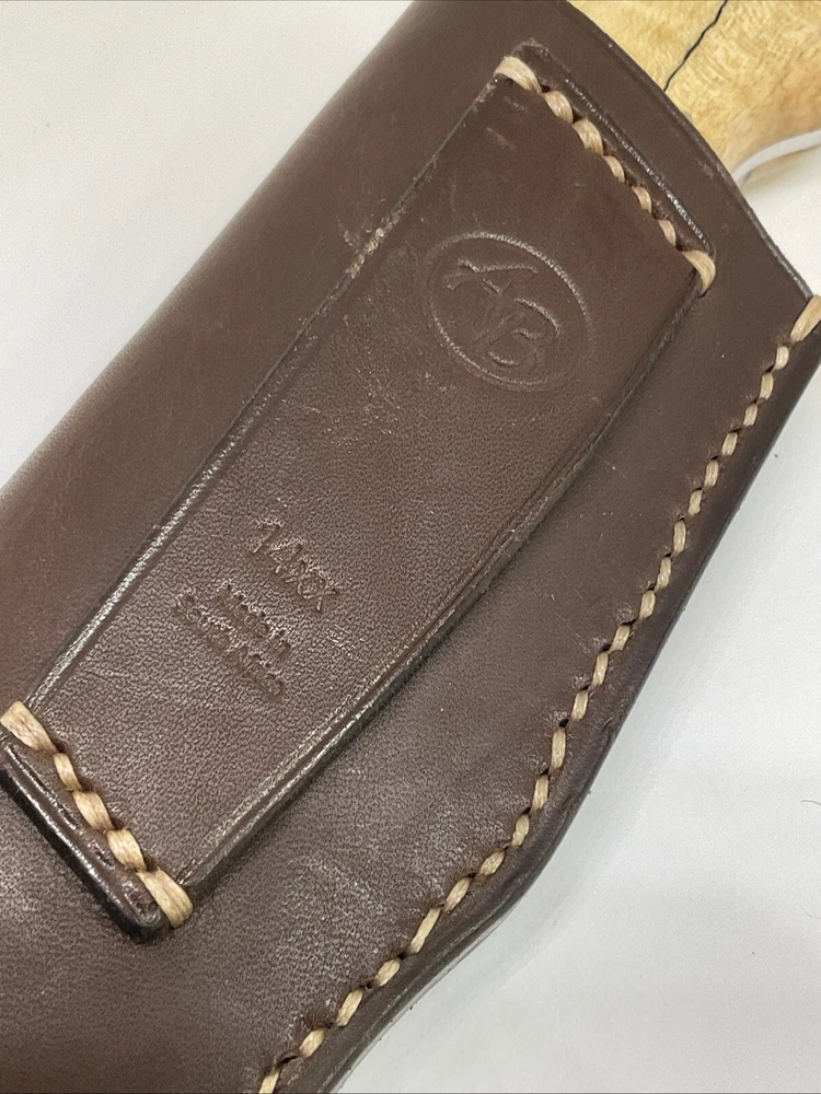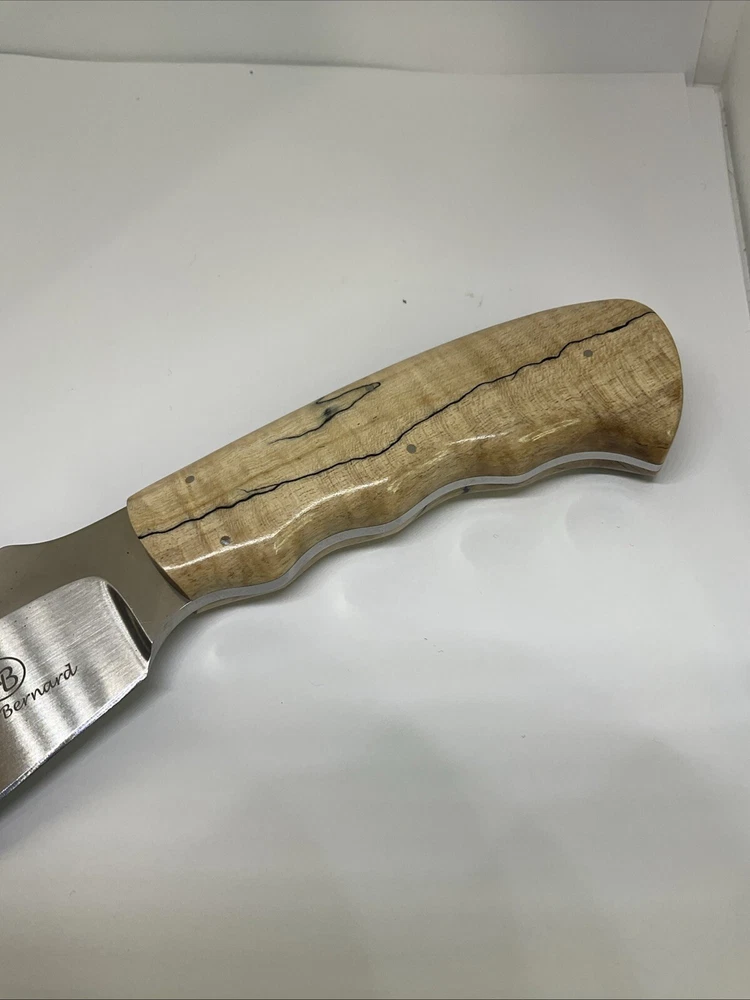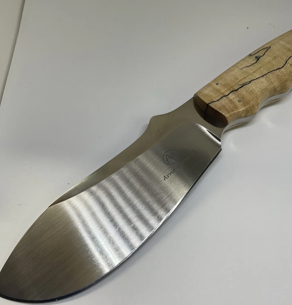 The Arno Bernard Hippo Giant Fixed Blade Hunting Skinner Knife is a handmade hunting knife designed by the brand Arno Bernard in South Africa. The blade is made of N690 stainless steel with a full tang construction, making it durable for hunting tasks. The handle is crafted from bone material, giving it a traditional and rustic look. With a blade length between 4.1 to 5 inches, this knife is suitable for skinning and other hunting needs. Its ambidextrous design allows for easy handling by both left and right-handed users.