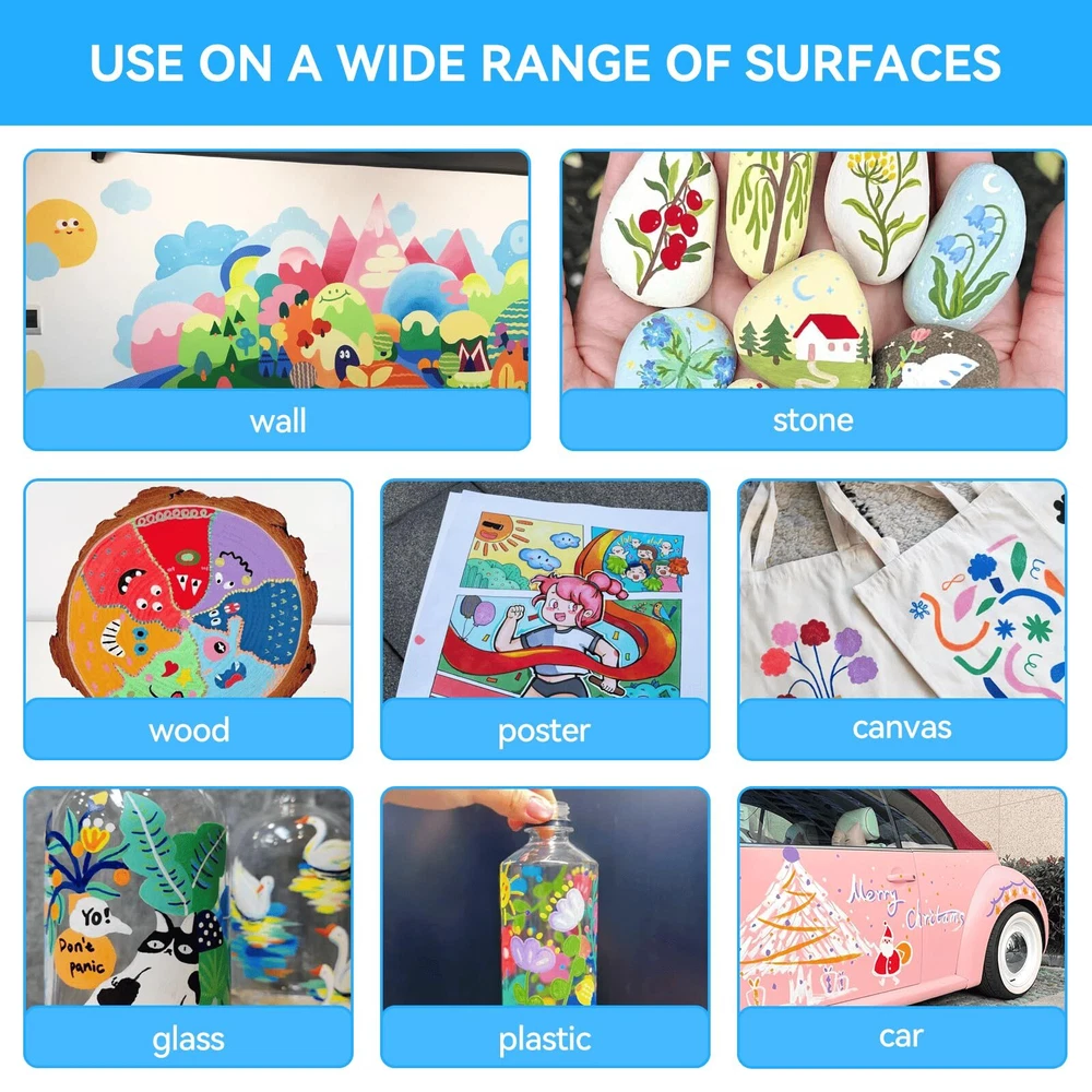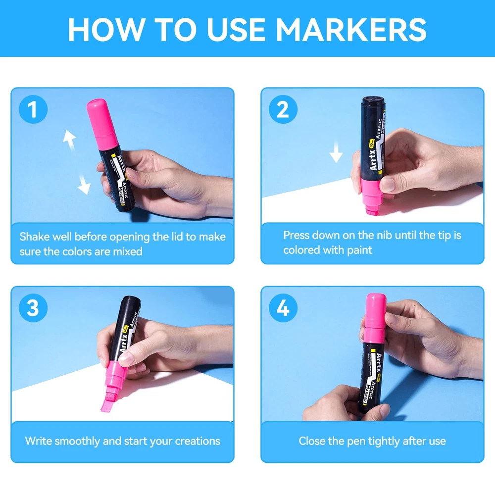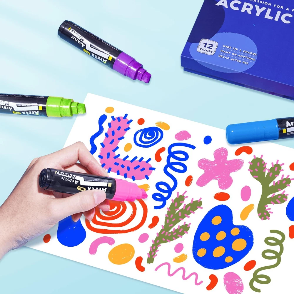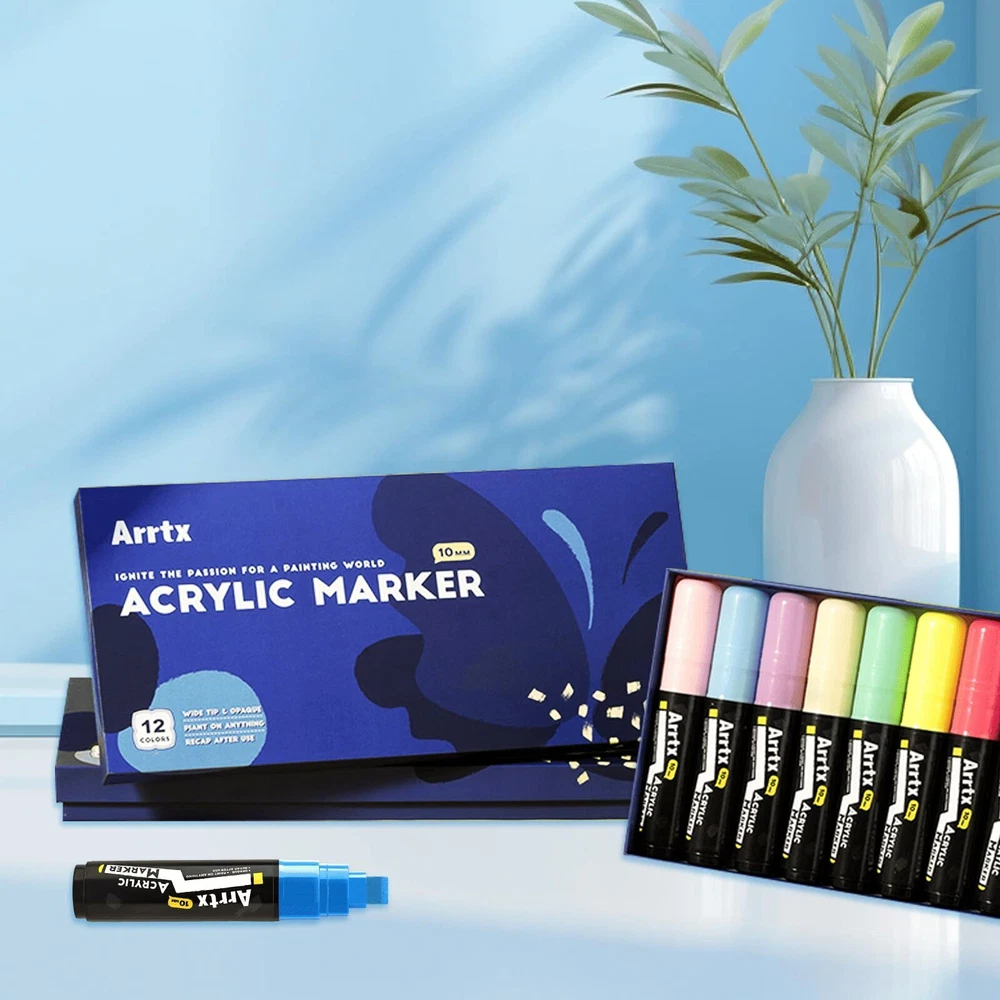 Arrtx 12 Colors Jumbo Markers | Acrylic Paint Markers for Adults | 10mm Broad Tips Acrylic Paint Pens for Stone, Glass, Easter Egg, Wood and Fabric Painting | No Toxic, No Odor 【12 VIBRANT COLORS】ARRTX Acrylic Paint Markers set comes with 12 fluorescent colors, which has rich colors and high saturation, allowing for bold, vibrant, long-lasting, and lightfast painting effects. Suitable for professional artists, graffiti enthusiasts, crafters, designers. 【DURABLE JUMBO TIP】Our Jumbo Paint Markers have 10mm-wide tip nibs, making the painting process easy to control and more efficient with good layering. Gliding effortlessly on smooth surfaces like paper and painted metal, flow smooth with great coverage. Ideal for larger illustrations, sign making and calligraphy. 【HIGH QUALITY INK】Our tagging markers are made of high-quality water-based ink, which are non-toxic and safe. There graffiti markers have a thick texture that can create full coverage on different surfaces. Once dry, the paint is waterproof, sun-proof, and fade-proof, which is a great choice for indoor or outdoor art projects. 【EASY TO USE】 To ensure the best control of the ink flow, our poster markers are built with a unique valve-action structure. Shaking the marker before use and press the nib up and down for several times until it fill with ink. Please cover the cap after use and store it horizontally when not in use. 【WIDE APPLICATION】These colored thick markers can be used on paper, stickers, stone, ceramic, wood, glass, plastic, and other smooth surfaces that add color to creations and decorations. And also make a perfect gift for family, neighbors, or friends on birthdays, parties, anniversaries, Halloween, Thanksgiving, Christmas, or New Year's.