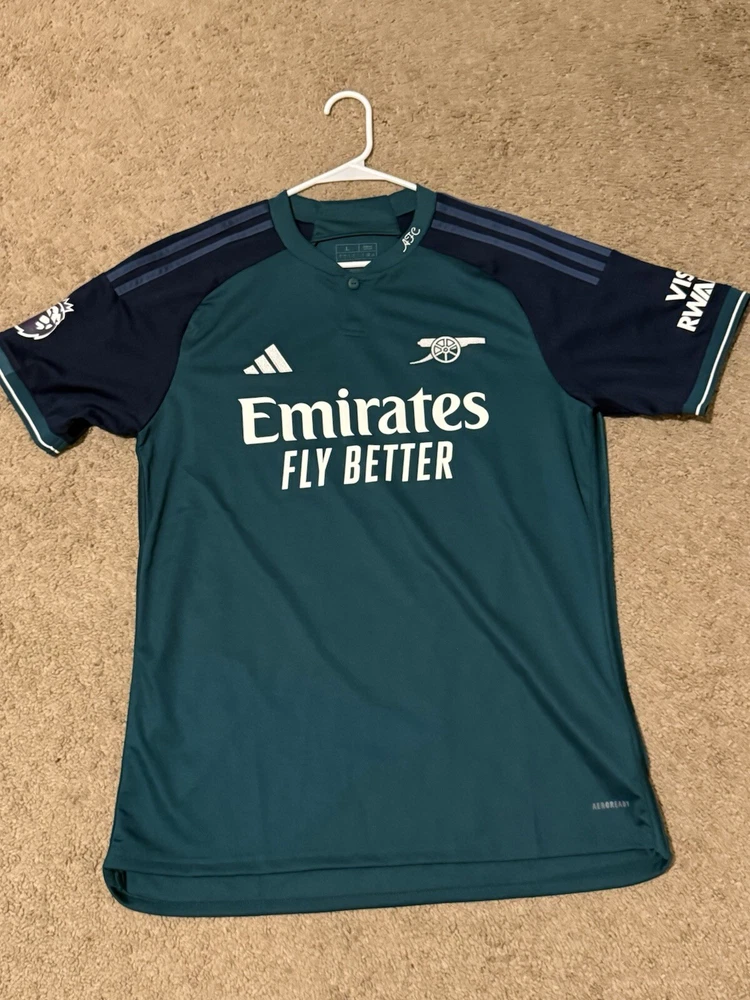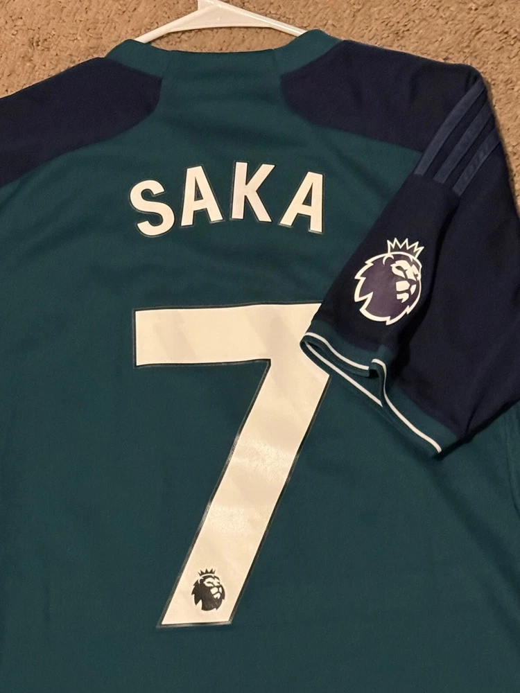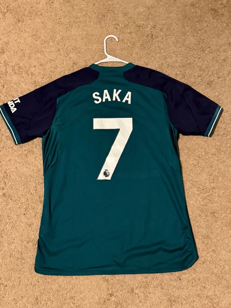 This is an adidas Arsenal 2023/24 Third Kit jersey in size Large, featuring player Bukayo Saka's name. It is officially licensed fan apparel for men who support Arsenal in soccer. New without tags, unworn
