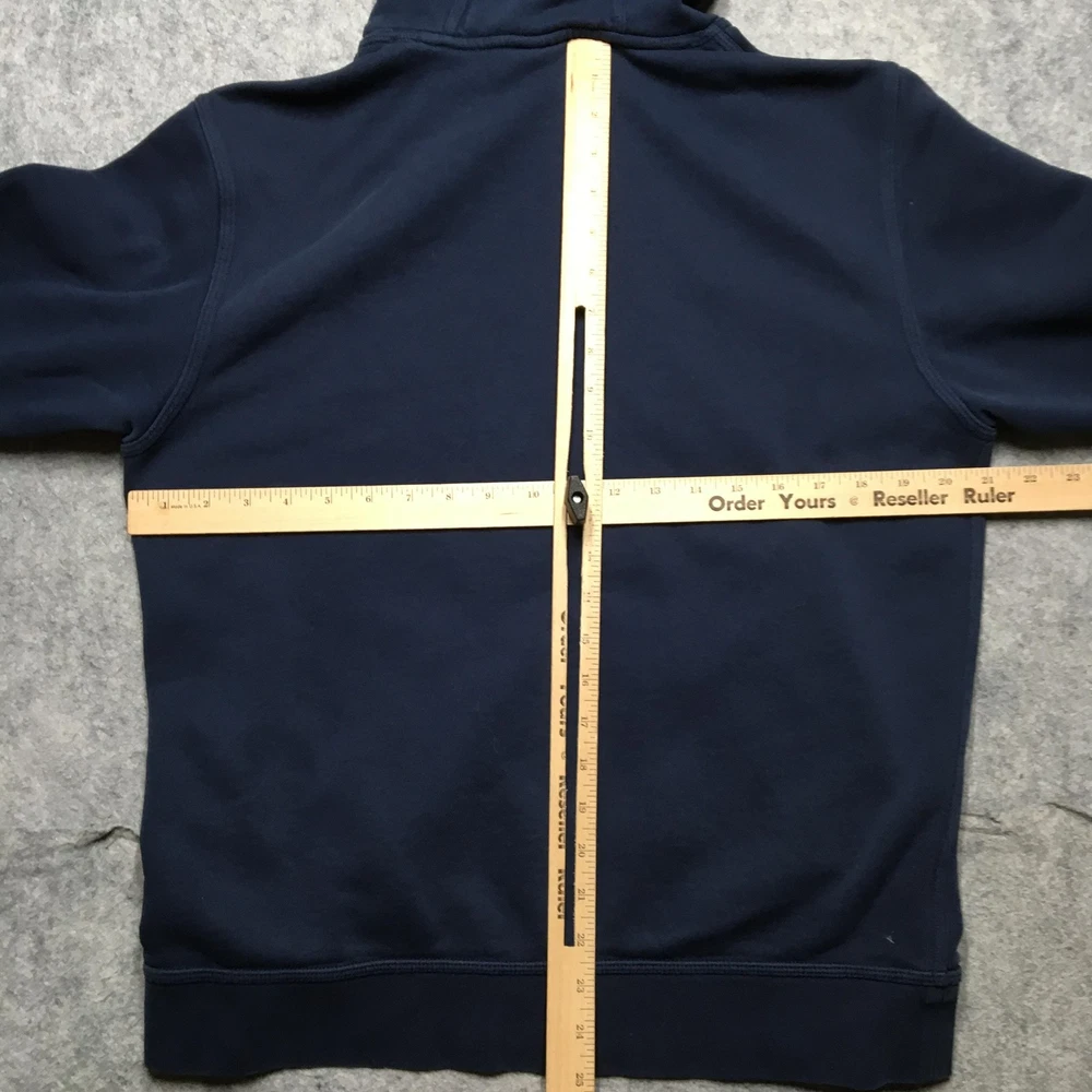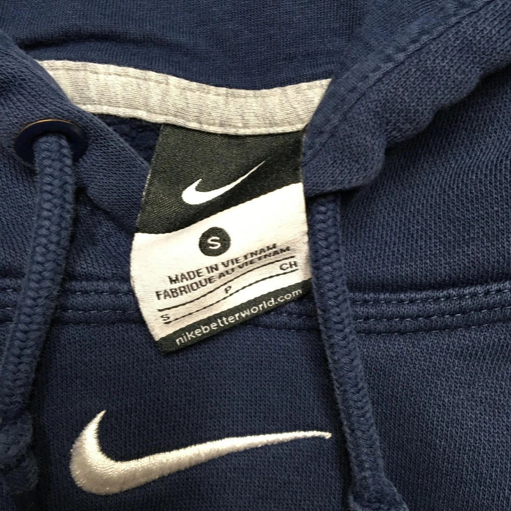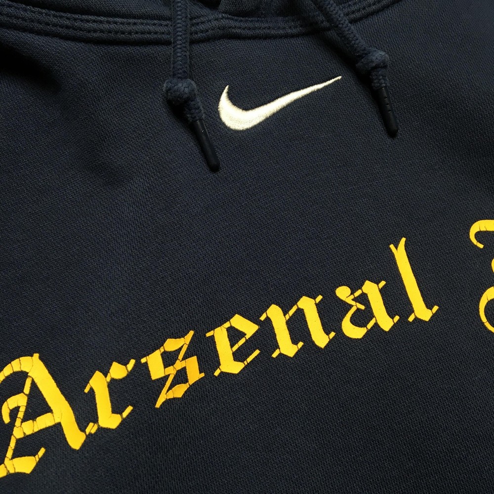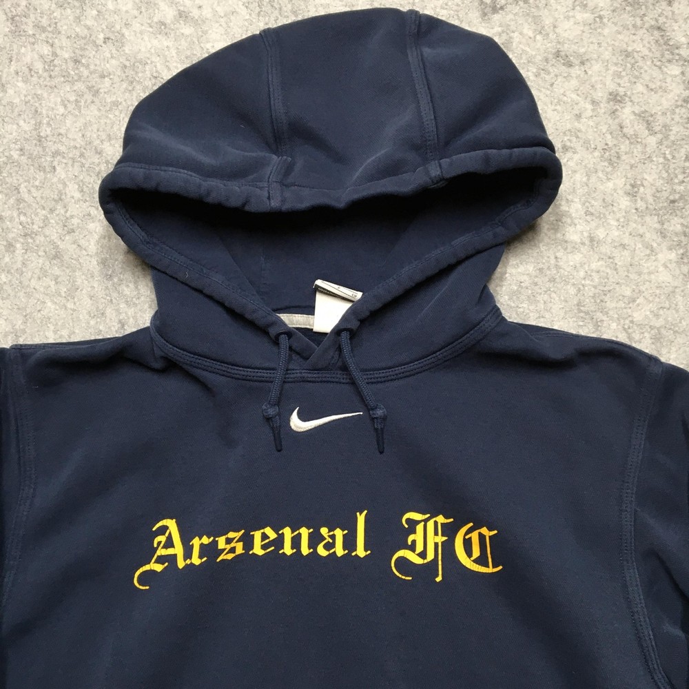 Team: Arsenal FC Brand: Nike Item: Men's pullover hooded sweatshirt/hoodie Tag Size: Small (S) Color: Navy blue with yellow Arsenal FC chest print and white Nike Swoosh logo Material: Body 80% cotton / 20% polyester; hood lining 100% cotton; rib 98% cotton / 2% spandex (per tag) Country of Origin: Made in Vietnam Logos/Markings: Embroidered Nike Swoosh at chest; front Arsenal FC gothic script print; neck tag; RN 56323; CA 05553 Features: Drawstring hood, front kangaroo pocket, ribbed cuffs and hem, soft fleece interior Sport: Soccer (Premier League) Notes: Classic Arsenal FC Nike hoodie style; review photos for color, graphic, and fit details. Add a second (or more) item to your cart from my store to receive a discount on your order! [does not apply to orders made with Best Offer] (shown in cart) Shipping is a non-negotiable flat rate based on size and weight. Each additional item is only $2 more in shipping. Please message me with any questions. I accept free returns for any reason within 60 days of delivery date, including "Does not fit" and "Just didn't like". Please note original shipping may be withheld in certain situations. Items are shipped from a smoke-free home and washed with Free & Clear detergent (except Dry Clean Only items). US Seller. Please message me with any questions! Items shipped within 1 business day (unless there is a vacation note).